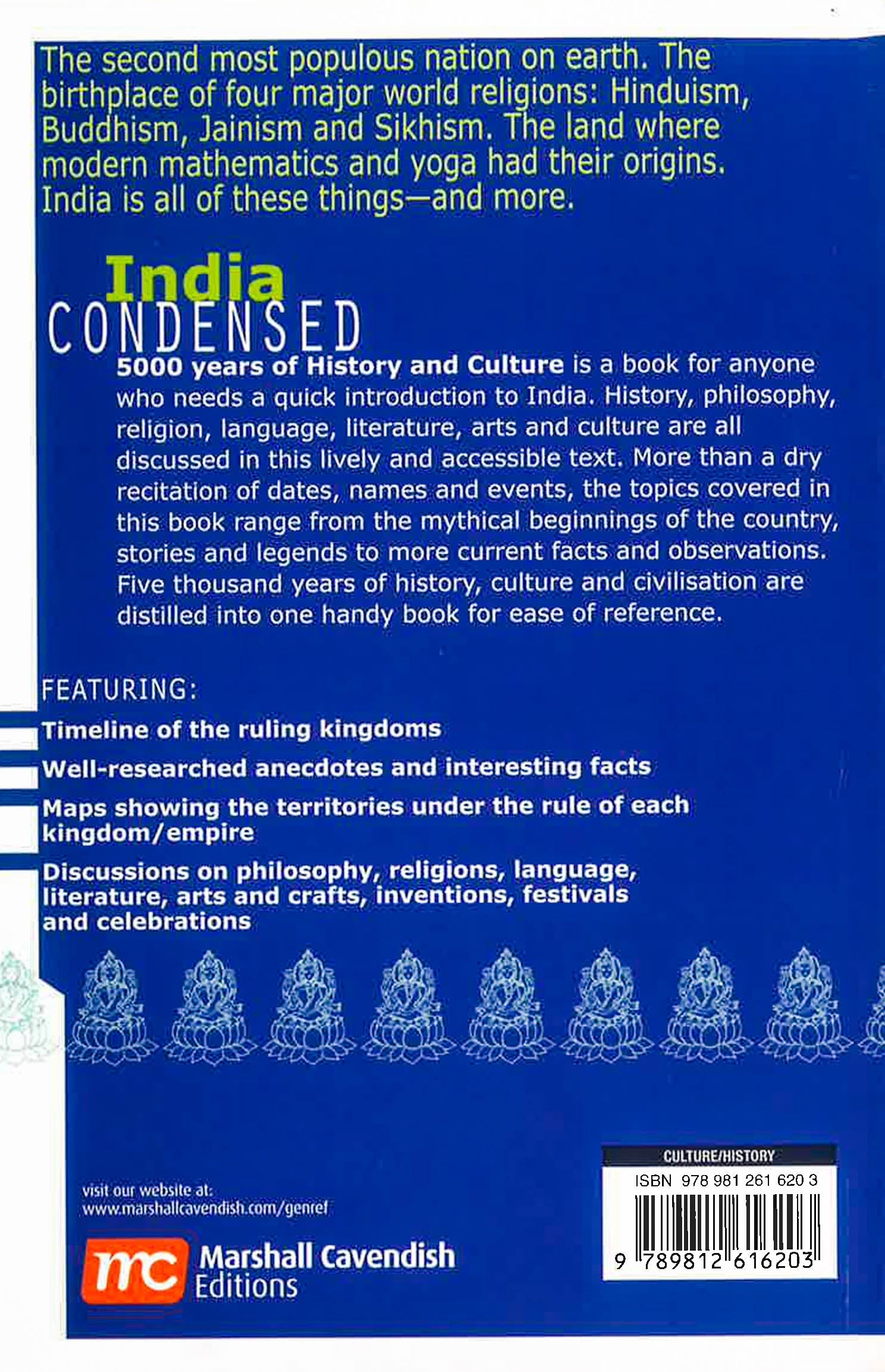 India Condensed is a book for anyone who needs a quick introduction to India. History, philosophy, religion, language, literature, arts and culture are all discussed in this lively and accessible text. More than a dry recitation of dates, names and events, the topics covered range from stories and legends to current facts and observations. Thousands of years of history, culture and civilization are distilled into one handy book for easy reference.