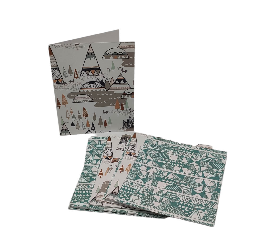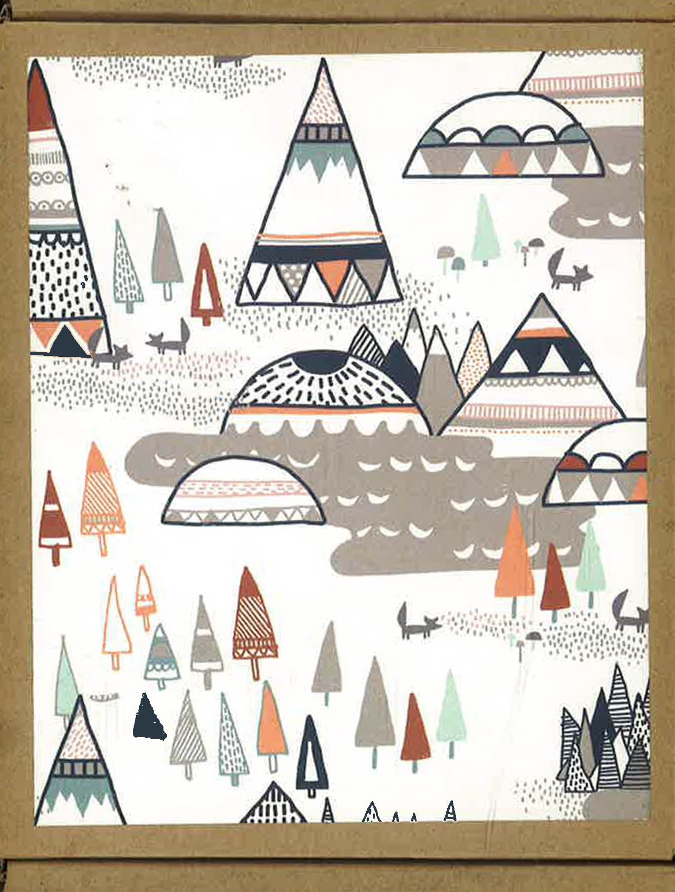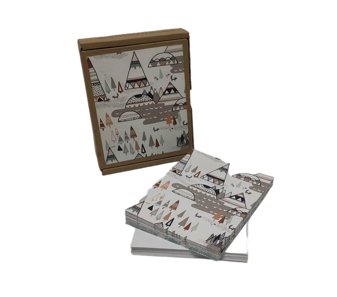 A tribal mountain landscape combined with Native American design motifs and geometry in set of environmentally-friendly boxed notecards. These blank cards are also perfect to use as invitations, friendship and all occasions. Find the foxes! Packaged in a corrugated cardboard box, our GreenNotes combine old-world charm with modern design. Cards, envelopes, and packaging are printed with soy-based inks and made with environmentally-friendly materials. 16 notecards and envelopes, 8 each of 2 images. Cards, envelopes and packaging made with recycled materials. Packaged in a reusable corrugated flip-top box. Cards printed on a luxurious uncoated paper stock. Cards and envelopes bundled together with a decorative twine tie.