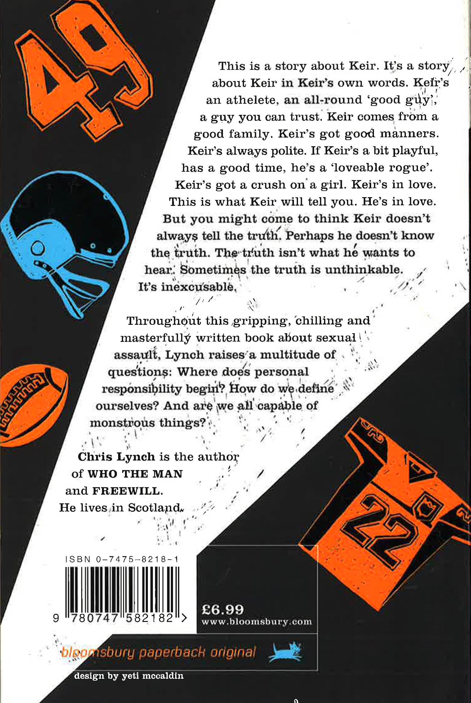 Sometimes the truth is unthinkable. It's inexcusable. A daring and chilling novel of date rape told in the voice of the accused. In a story that moves between the past and the scene of the rape, Keir attempts to defend his character from the monstrous crime of which he has been accused. But the anecdotes from Keir's senior year at high school fall short of giving the innocent and 'good-guy' picture, Keir is determined to paint of himself. Instead he is revealed somehow as a morally ambiguous and deluded young man. In this extraordinary book, Chris Lynch has pushed the boundaries and set a new standard in YA fiction. It is a gripping and masterfully written story about a subject very few people will dare to explore. Any person who reads it will have much to think about.