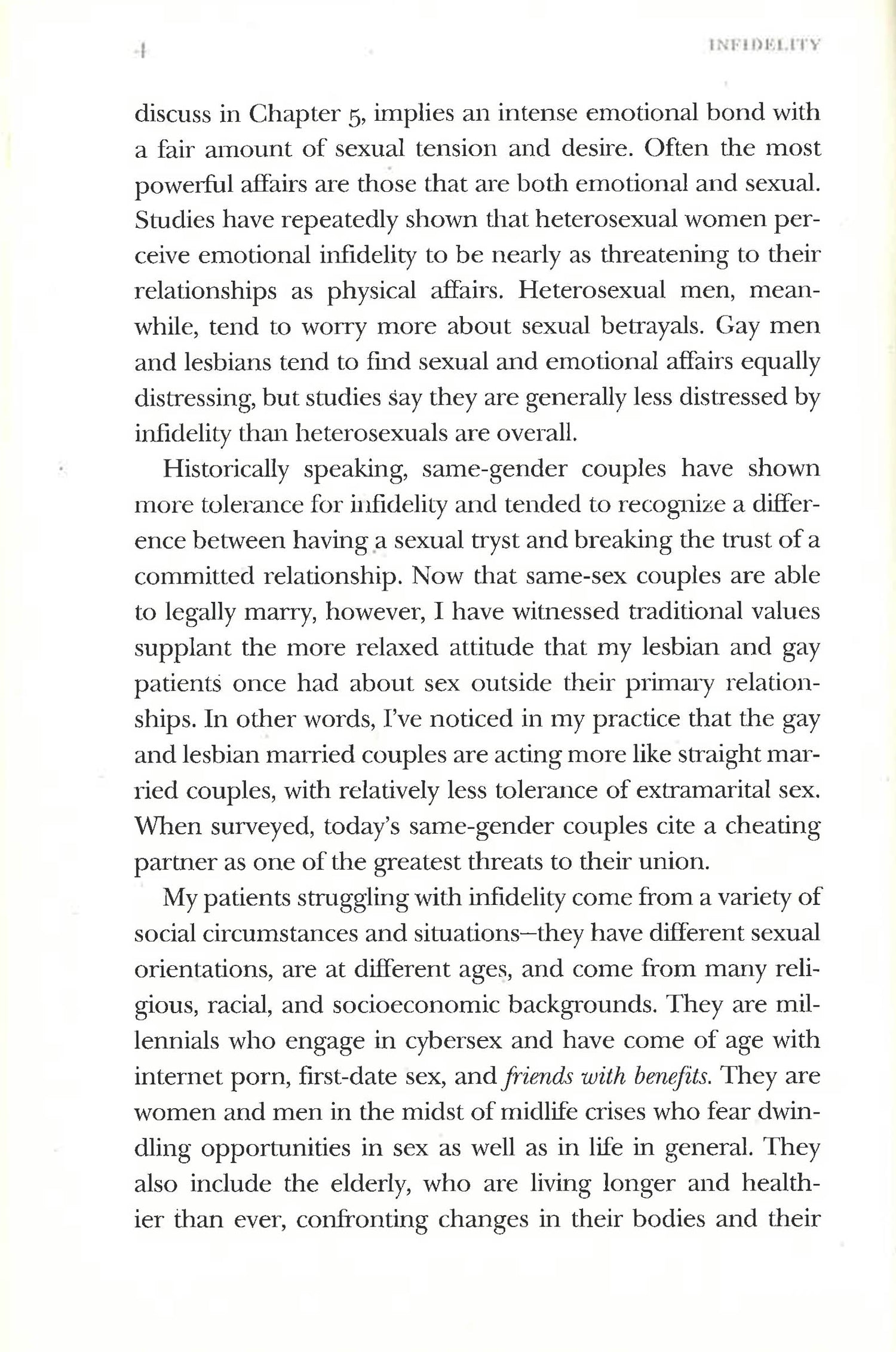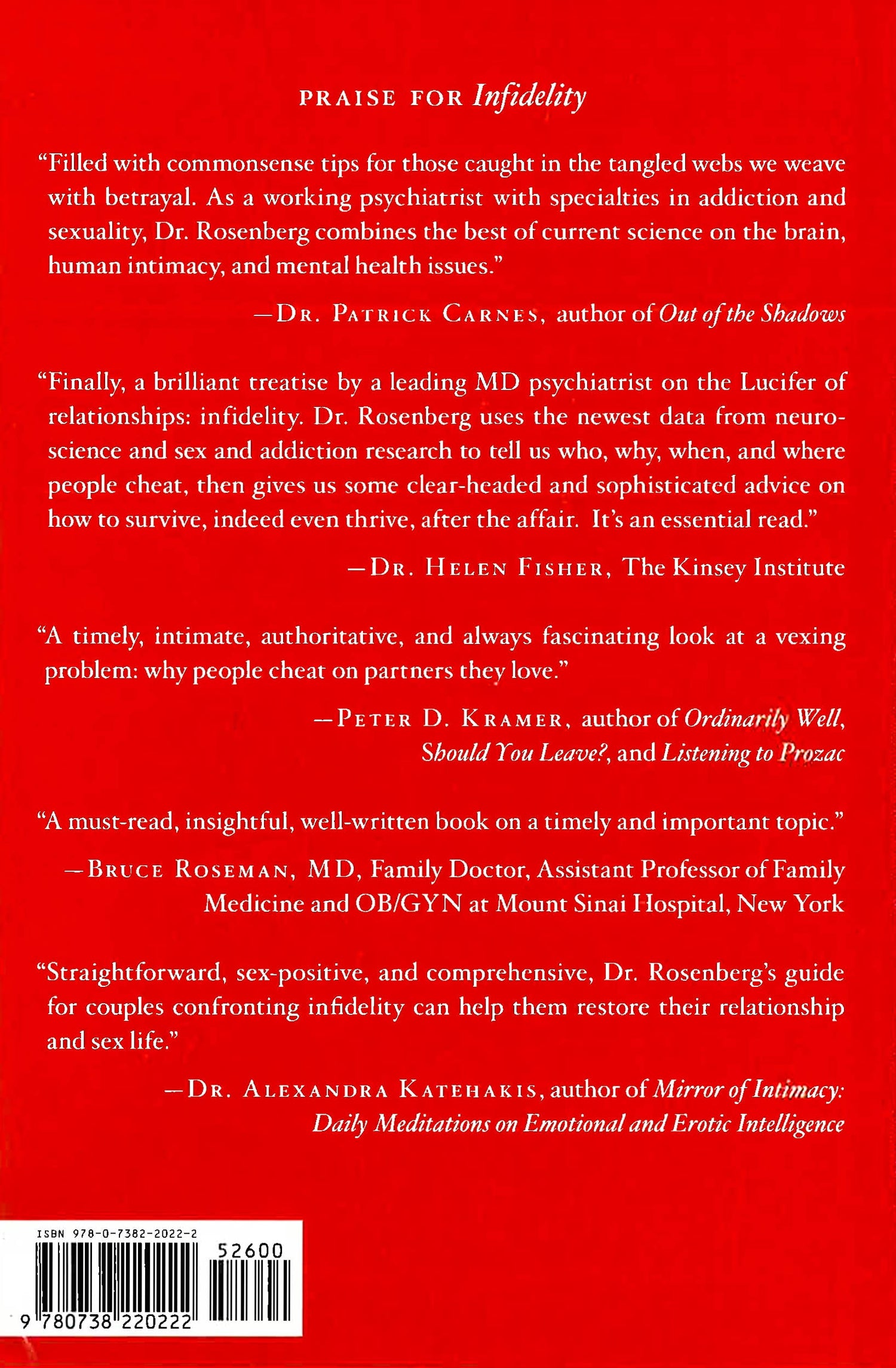 What the latest science tells us about fidelity, infidelity, memory, the brain's reward systems, love, and sexIn both genders and across age groups, infidelity is on the rise. People often cheat in a haze of delusion, believing that it will bring them real love, help them have better sex, lift their spirits, and boost their sagging self-esteem; however, very often, cheating wrecks relationships and erodes self-esteem. Hundreds of people have sought Dr. Rosenberg's help as a psychiatrist to help them stop cheating and repair the damage caused by their affairs. In Infidelity: Why Men and Women Cheat, Dr. Rosenberg explains what draws men and women to cheat and what they can do about it. He explains the three types of cheating: emotional, virtual, and physical; why they're so prevalent; and how to survive when either you or your partner are drawn to stray. Infidelity takes an objective and evidence-based approach to why men and women today cheat, drawing from the latest research in neuroscience and from Rosenberg's own clinical practice to reveal the mechanics of the sexual brain. And through concrete rules, Rosenberg guides couples on how to prevent cheating, stop it from progressing, and repair the damage caused by an affair. Infidelity provides key insights that show a couple how to find their true sexual and romantic potential and advocates honesty, trust, and integrity - the fundamentals of love.