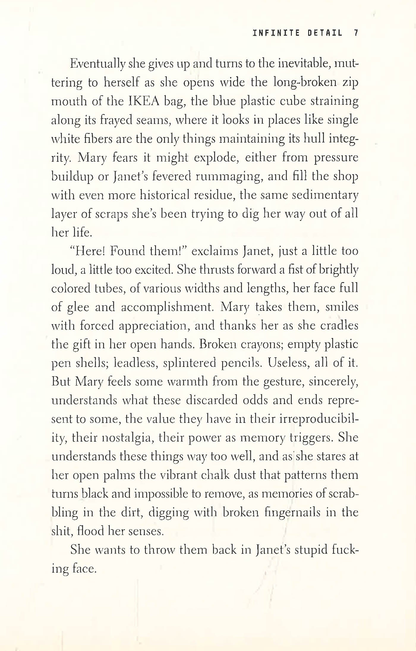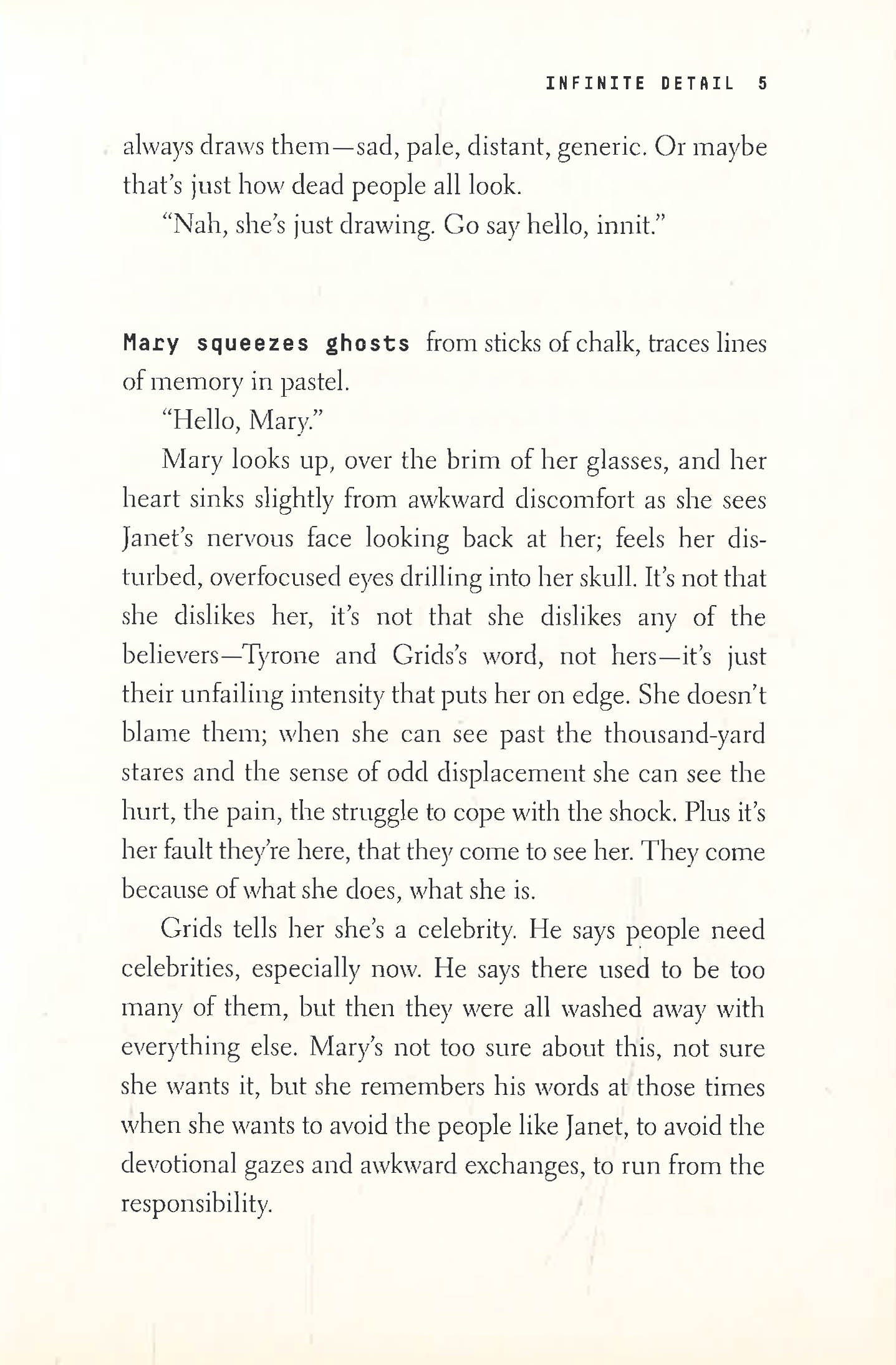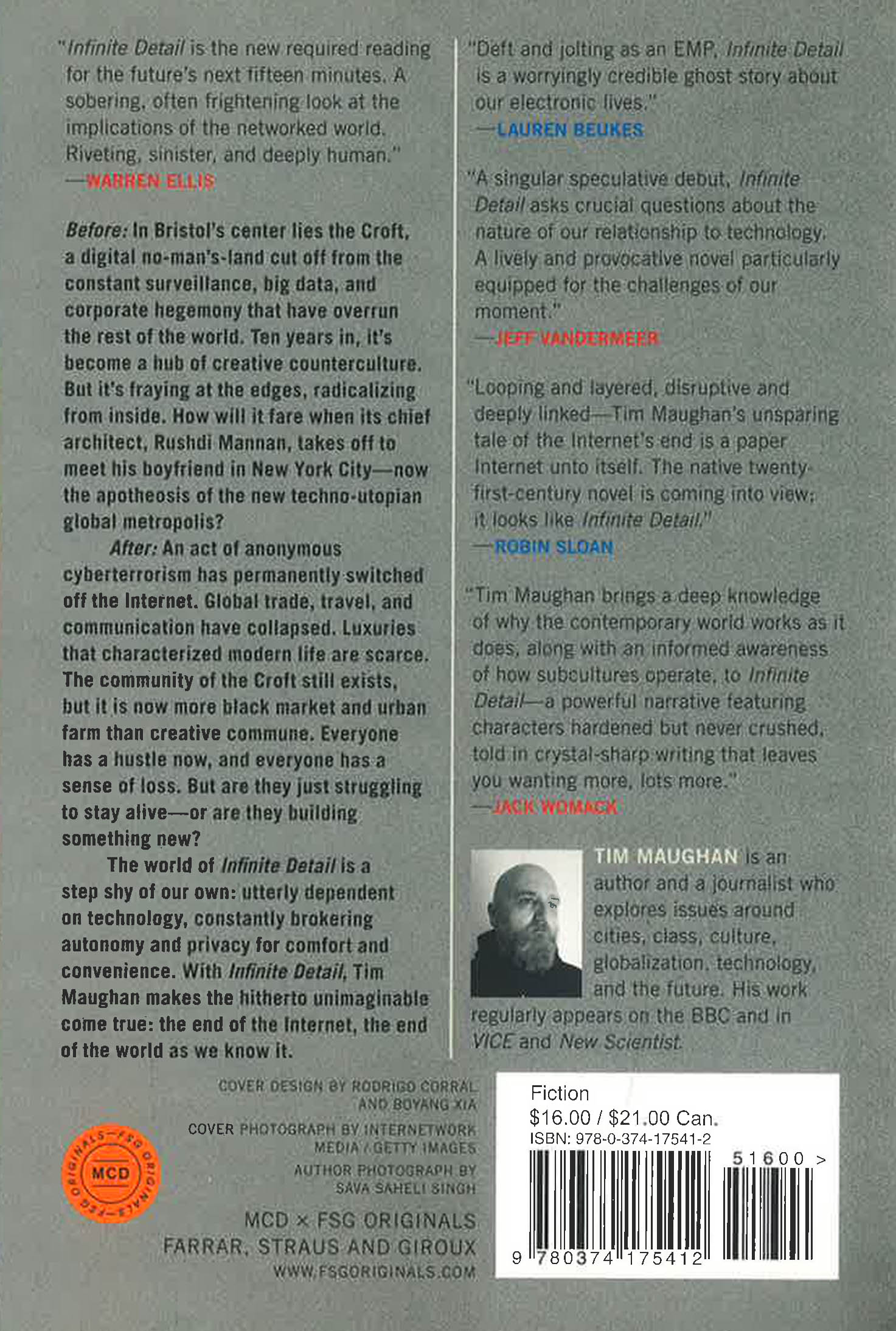 BEFORE: In Bristol’s centre lies the Croft, a digital no-man’s-land cut off from the surveillance, Big Data dependence, and corporate-sponsored, globally hegemonic aspirations that have overrun the rest of the world. Ten years in, it’s become a centre of creative counterculture. But it’s fraying at the edges, radicalising from inside. How will it fare when its chief architect, Rushdi Mannan, takes off to meet his boyfriend in New York City - now the apotheosis of the new techno-utopian global metropolis? AFTER: An act of anonymous cyberterrorism has permanently switched off the Internet. Global trade, travel, and communication have collapsed. The luxuries that characterised modern life are scarce. In the Croft, Mary - who has visions of people presumed dead - is sought out by grieving families seeking connections to lost ones. But does Mary have a gift or is she just hustling to stay alive? Like Grids, who runs the Croft’s black market like personal turf. Or like Tyrone, who hoards music (culled from cassettes, the only medium to survive the crash) and tattered sneakers like treasure. The world of Infinite Detail is a small step shy of our own: utterly dependent on technology, constantly brokering autonomy and privacy for comfort and convenience. With Infinite Detail, Tim Maughan makes the hitherto-unimaginable come true: the End of the Internet, the End of the World as We Know It.
