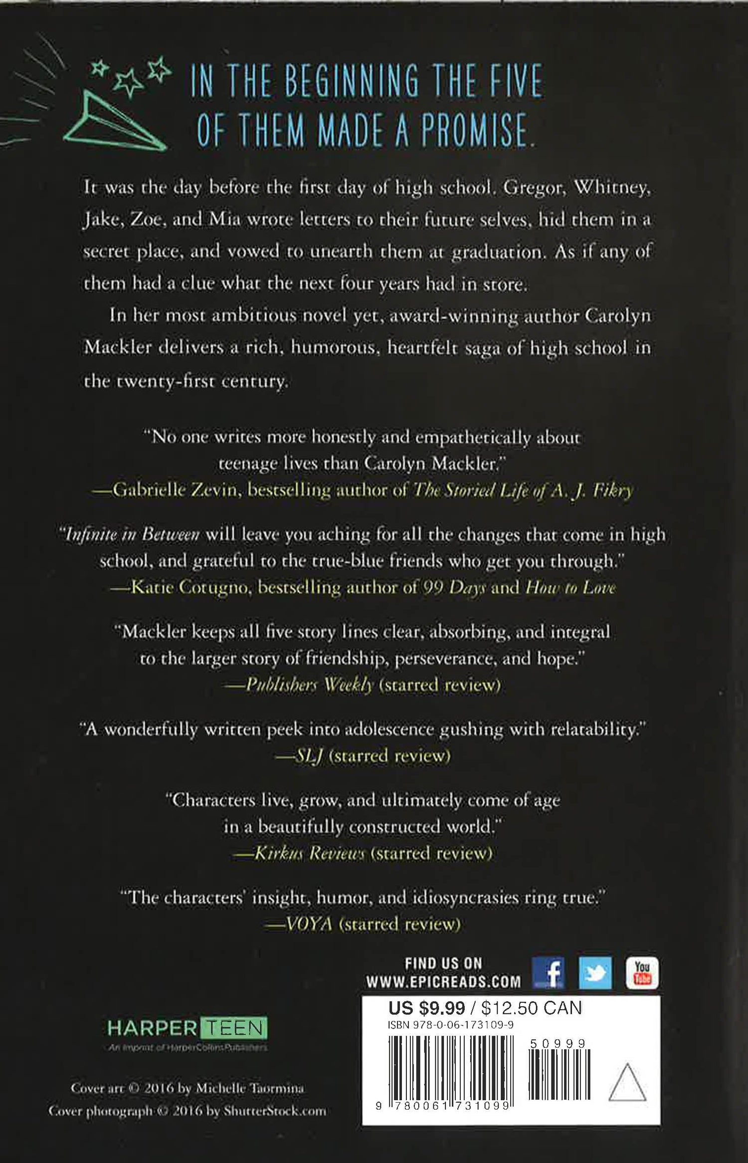 In the beginning the five of them made a promise. It was the day before the first day of high school. Gregor, Whitney, Jake, Zoe, and Mia wrote letters to their future selves, hid them in a secret place, and vowed to unearth them at graduation. As if any of them had a clue what the next four years had in store.In her most ambitious novel yet, award-winning author Carolyn Mackler delivers a rich, humorous, heartfelt saga of high school in the twenty-first century.