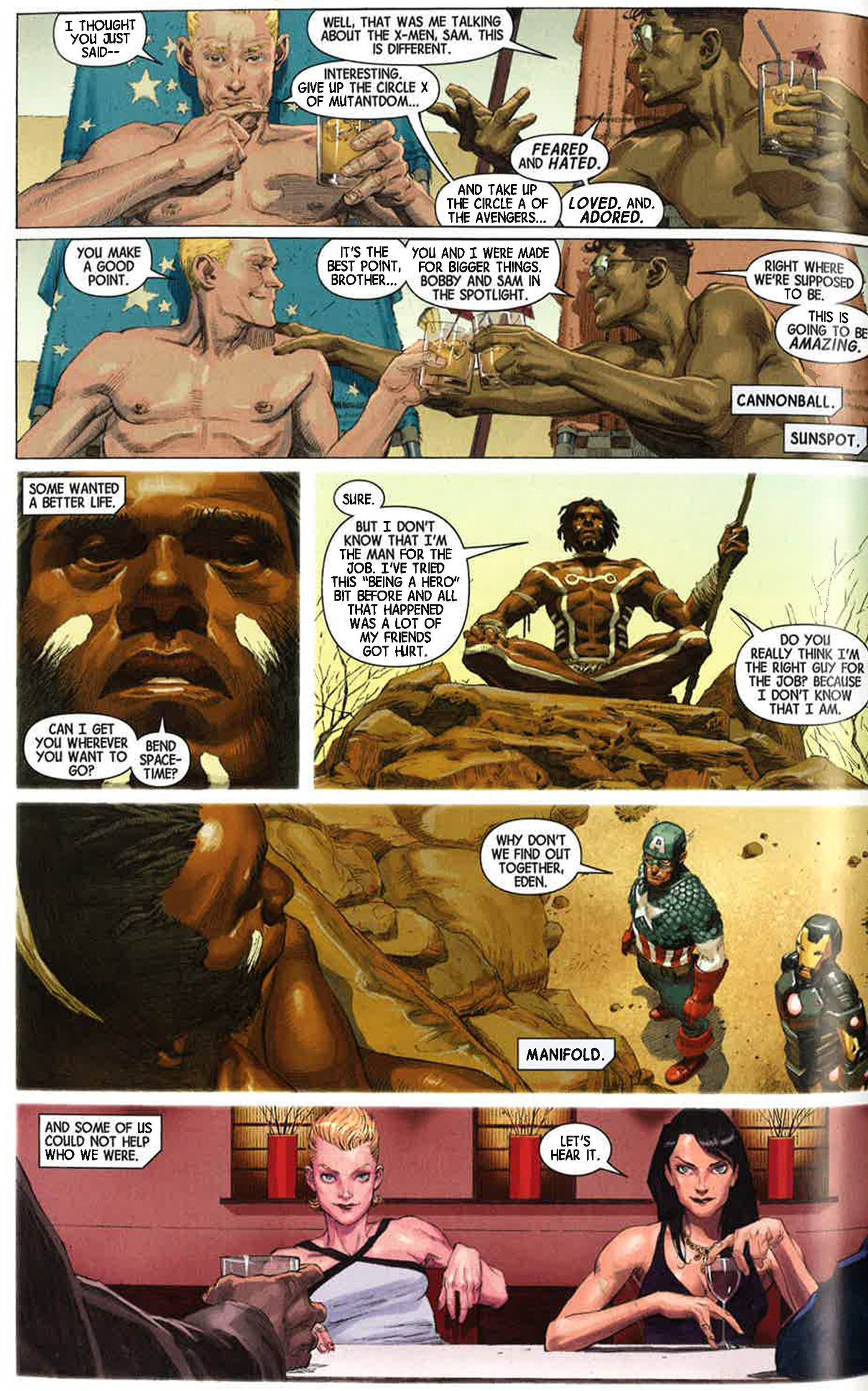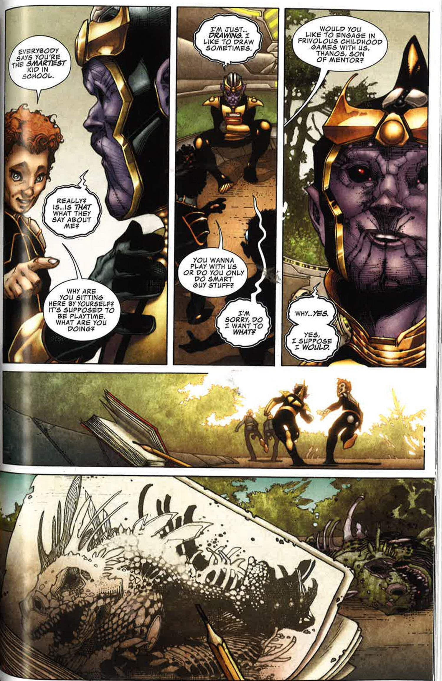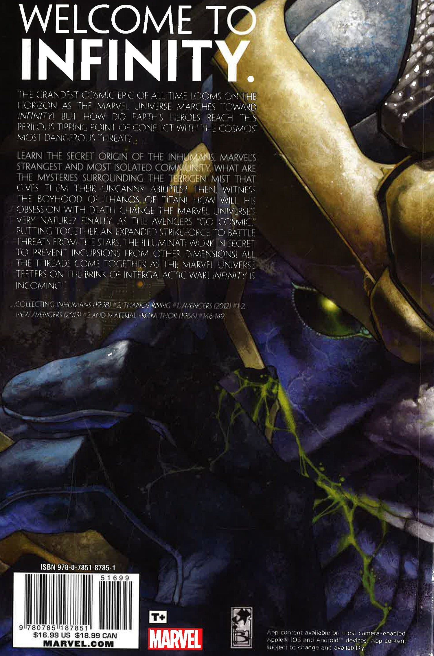 The grandest comsmic epic of all time looms on the horizon as Marvel marches toward Infinity! But how did Earth's heroes reach this perilous tipping point? Learn the secret origin of the Inhumans, Marvel's strangest and most isolated community. What are the mysteries surrounding the Terrigen Mist that gives them their uncanny abilities? Then, witness the boyhood of Thanos of Titan! How will his obsession with death change the Marvel Universe's very nature? Finally, as the Avengers "go cosmic," putting together an expanded strikeforce to battle threats from the start, the illuminati work in secret to prevent incursions from other dimensions! All the threads come together as the Marvel Universe teeters on teh brink of intergalactic war!
