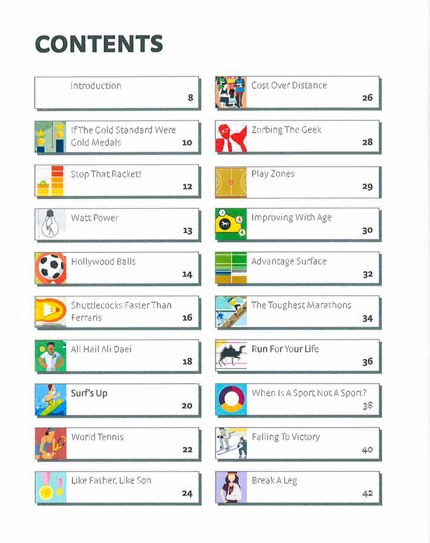 Over 80 stunning, ingenious and absorbing sport infographics! Infographic Guide to Sport presents unique, witty and surprising facts about every type of sport, from badminton to karate, cricket to ice hockey, football to zorbing. Fascinating stats and all the facts on your favourite sporting legends, it features infamous tales from behind the scenes of the sporting world.More than just a book of words, with graphs, Venn diagrams and charts, this book provides a unique overview of the all your favourite sports, boasting over 100 original artworks and illustrations and at-a-glance facts to amaze and astound readers.Discover:The world's most dangerous sportsThat shuttlecocks are faster than FerrarisNiche European sports from oina to pesapalloThe toughest marathonsWhy cheerleading is more dangerous than boxing