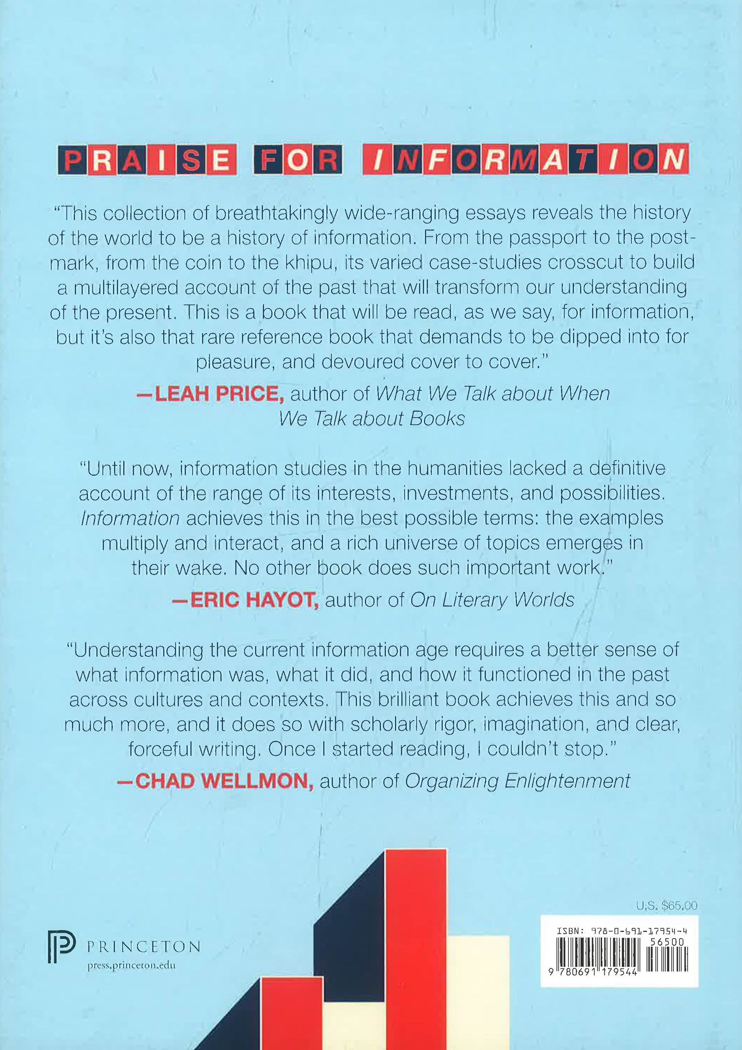 Written by an international team of experts, the book's inspired and original long- and short-form contributions reconstruct the rise of human approaches to creating, managing, and sharing facts and knowledge. Thirteen full-length chapters discuss the role of information in pivotal epochs and regions, with chief emphasis on Europe and North America, but also substantive treatment of other parts of the world as well as current global interconnections. More than 100 alphabetical entries follow, focusing on specific tools, methods, and concepts-from ancient coins to the office memo, and censorship to plagiarism. The result is a wide-ranging, deeply immersive collection that will appeal to anyone drawn to the story behind our modern mania for an informed existence.