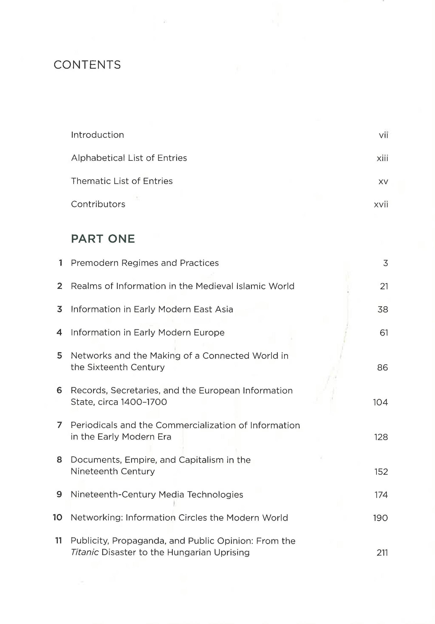 Thanks to modern technological advances, we now enjoy seemingly unlimited access to information. Yet how did information become so central to our everyday lives, and how did its processing and storage make our data-driven era possible? This volume is the first to consider these questions in comprehensive detail, tracing the global emergence of information practices, technologies, and more, from the premodern era to the present. With entries spanning archivists to algorithms and scribes to surveilling, this is the ultimate reference on how information has shaped and been shaped by societies.