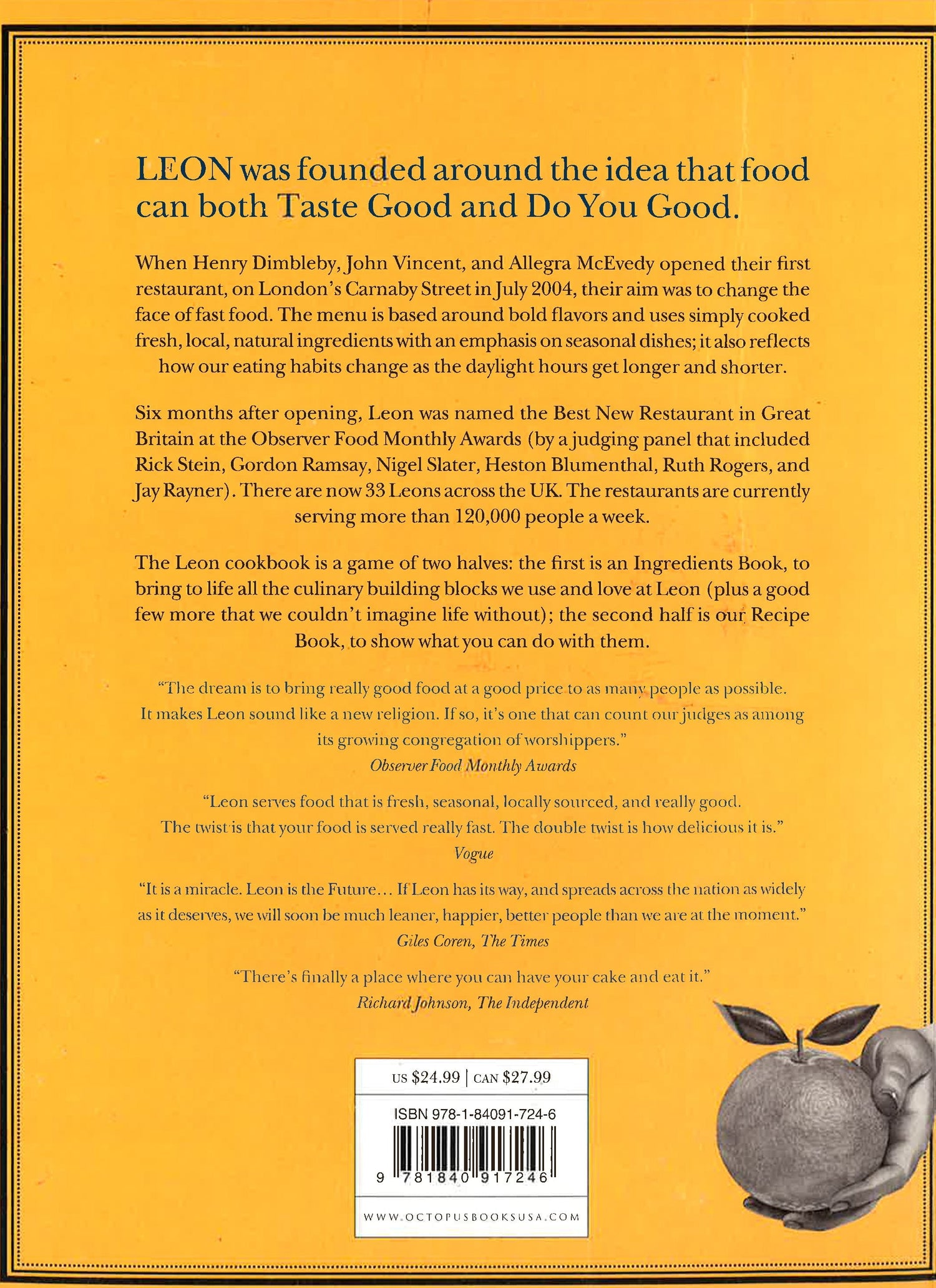 The first Leon restaurant, in London's Carnaby Street, opened its doors in July 2004. For its founders - henry Dimbleby, John Vincent and Allegra McEvedy - the aim was to change the face of fast food, by bringing fresh, wholesome cooking to the high street. Six months later, Leon was named the Best New Restaurant in Great Britain at the Observer Food Monthly Awards. The menu is based around bold flavors, using simply-cooked fresh, local, natural ingredients with an emphasis on seasonal dishes; it also reflects how our eating habits change as the daylight house get longer and shorter. This is a book of two halves. The Ingredients Book arms you with everything you need to know about the basic building blocks of any recipe. LEON chooses its ingredients above all for their flavor and healthiness but also with a view to the world we live in, so that such shark-infested waters as sustainable fish are tackled and easy to navigate. LEON's top 250 fruits, vegetables, fish, meats, dairy and store cupboard ingredients are all given their own entries. Nutrition, a bit of history, flavor and the best way to get the most out of them are all covered, seasoned with a fair amount of random miscellany. The second half is The Recipe Book, where you can put your newly found knowledge of ingredients to great use with over 140 recipes: some are familiar favourites taken from LEON's menus such as the Original Superfood Salad, Moroccan Meatballs or Magic Mackerel Couscous and, for LEON Lovers everywhere, at last a recipe for the coveted LEON Better Brownie. Plus there are some recipes from the founders, their friends and those who helped make LEON what it is today, like Fred's Millennium Octopus and David Dimbleby's Spanish Omelette. LEON's food message is a simple and honest one - cook and eat with the best ingredients available and don't forget the naughty bits that are so necessary for a fully-rounded life. * This book may have reminder mark*