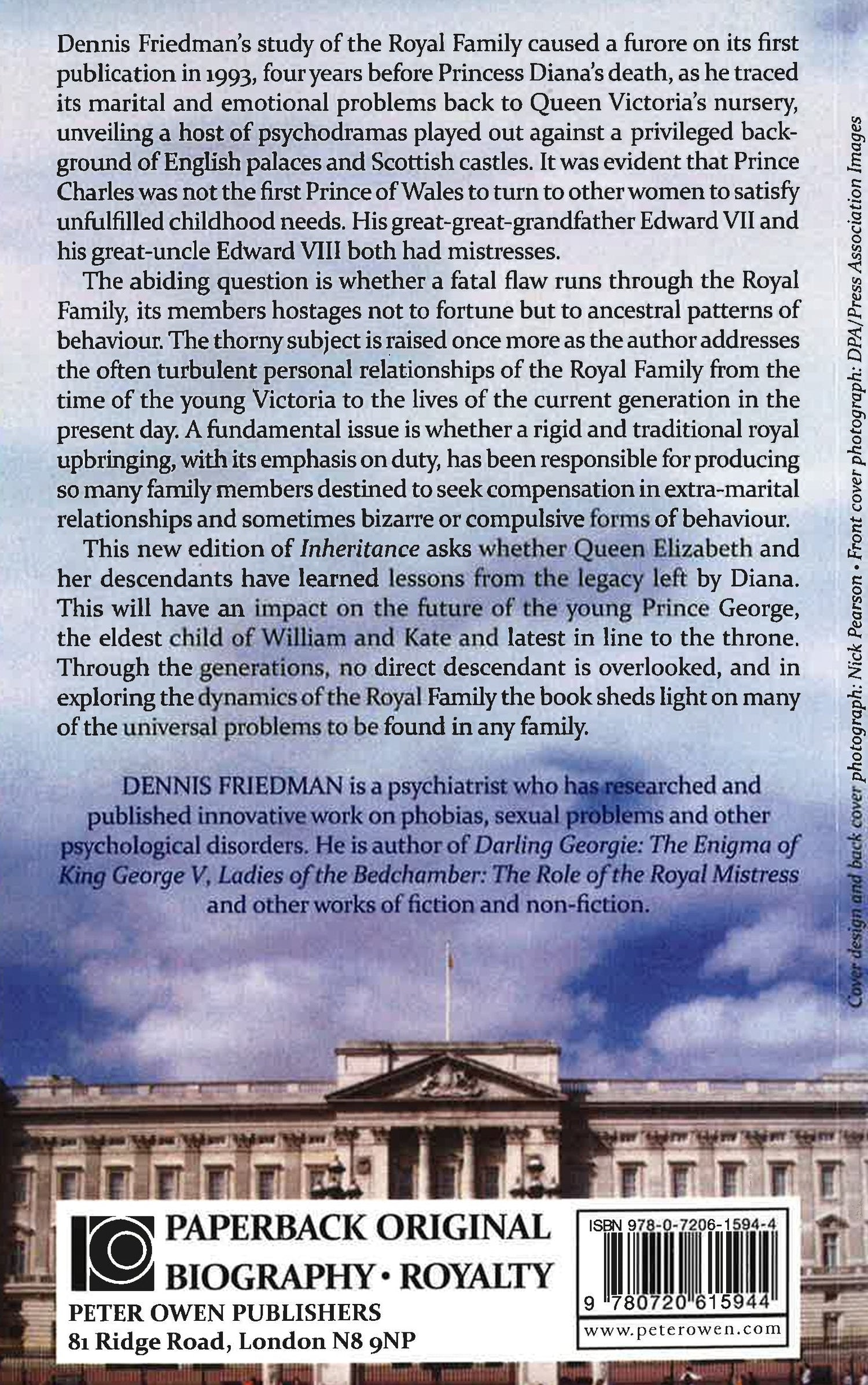 Inexploring Royal dynamics, "Inheritance" sheds light on problems found in any familyOn its first publication in the 1990s, Dennis Friedman's" Inheritance" caused a furor inEnglandas he traced the many problems of the Royal family as it was then back to Queen Victoria's nursery, unveiling a host of psychodramas played out against a privileged background of English palaces and Scottish castles. In a post-Diana age, the arrival of a new Prince George to the seemingly stable and blissfully happy William and Kate seems to refute Fiedman's thesis but what of the notoriously wayward Prince Harry? Many questions are raised in this book addressing the complex and turbulent royal relationships, perhaps the most fundamental being the rigid and traditional royal upbringing which still awaits the baby prince. As the royal line is followed down the generations no direct descendent is overlooked andno issue is sidestepped."