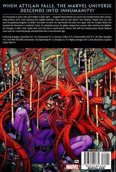 After the fall of Attilan and the Terrigen Bomb explosion, thousands of people across the globe have transformed into Inhumans! Their new powers are dangerous and terrifying, making them targets. With Black Bolt believed dead, who can these new Inhumans turn to? As the Avengers face Karnak, who has discovered the Inhumans' secret, Medusa struggles to rule her vastly increased population, and Marvel's heroes - including the Hulk, Spider-Girl, the X-Men, the new Illuminati, Iron Man, the Jean Grey School, Avengers Academy, Luke Cage and the Superior Spider-Man - must cope with the fallout! COLLECTING: Avengers Assemble 21.INH-23.INH, 24-25; Inhumanity 1-2; Uncanny X-Men 15.INH; Indestructible Hulk 17.INH-18.INH, 19; New Avengers 13.INH; Iron Man 20.