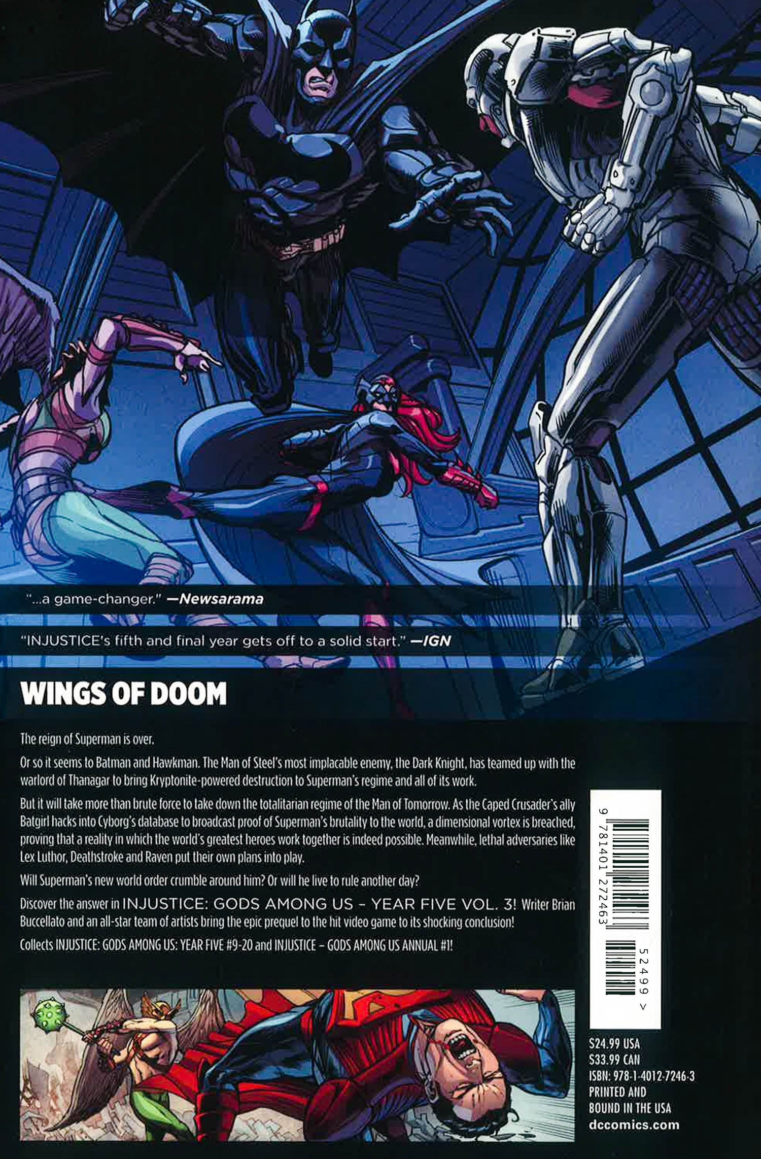 Writer Brian Buccellato and an all-star team of artists bring the epic prequel of the hit video game to its shocking conclusion!The Man of Steel?s most implacable enemy, the Dark Knight, has teamed up with the warlord of Thanagar to bring Kryptonite-powered destruction to Superman?s regime and all of its work.But it will take more than brute force to take down the totalitarian regime of the Man of Tomorrow. As the Caped Crusader?s ally Batgirl hacks into Cyborg?s database to broadcast proof of Superman?s brutality to the world, a dimensional vortex is breached, proving that a reality in which the world?s greatest heroes work together is indeed possible. Meanwhile, lethal adversaries like Lex Luthor, Deathstroke and Raven put their own plans into play.Will Superman?s new world order crumble around him? Or will he live to rule another day?Author Brian Buccellato provides all the answers in INJUSTICE: GODS AMONG US: YEAR FIVE VOL. 3! Collects INJUSTICE: GODS AMONG US: YEAR FIVE #9-20 and INJUSTICE: GODS AMONG US ANNUAL #1!