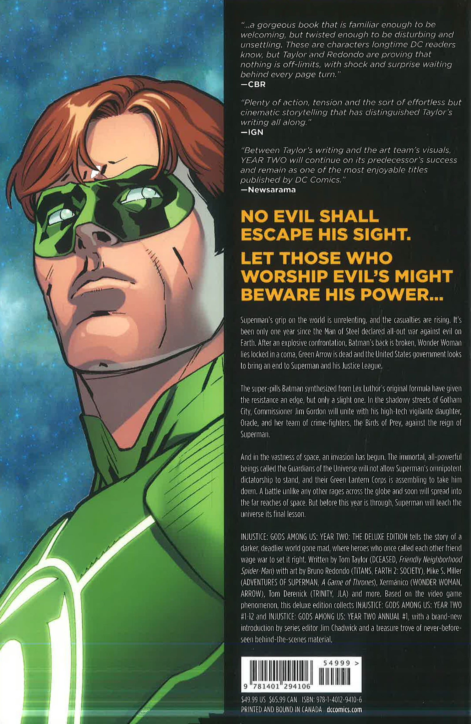 Superman's grip over the world is unrelenting, and the casualties are rising. It's been only one year since the Man of Steel declared all-out war against evil on Earth. After an explosive confrontation, Batman's back is broken, Wonder Woman lies locked in a coma, Green Arrow is dead, and the United States government looks to bring an end to Superman and his Justice League.