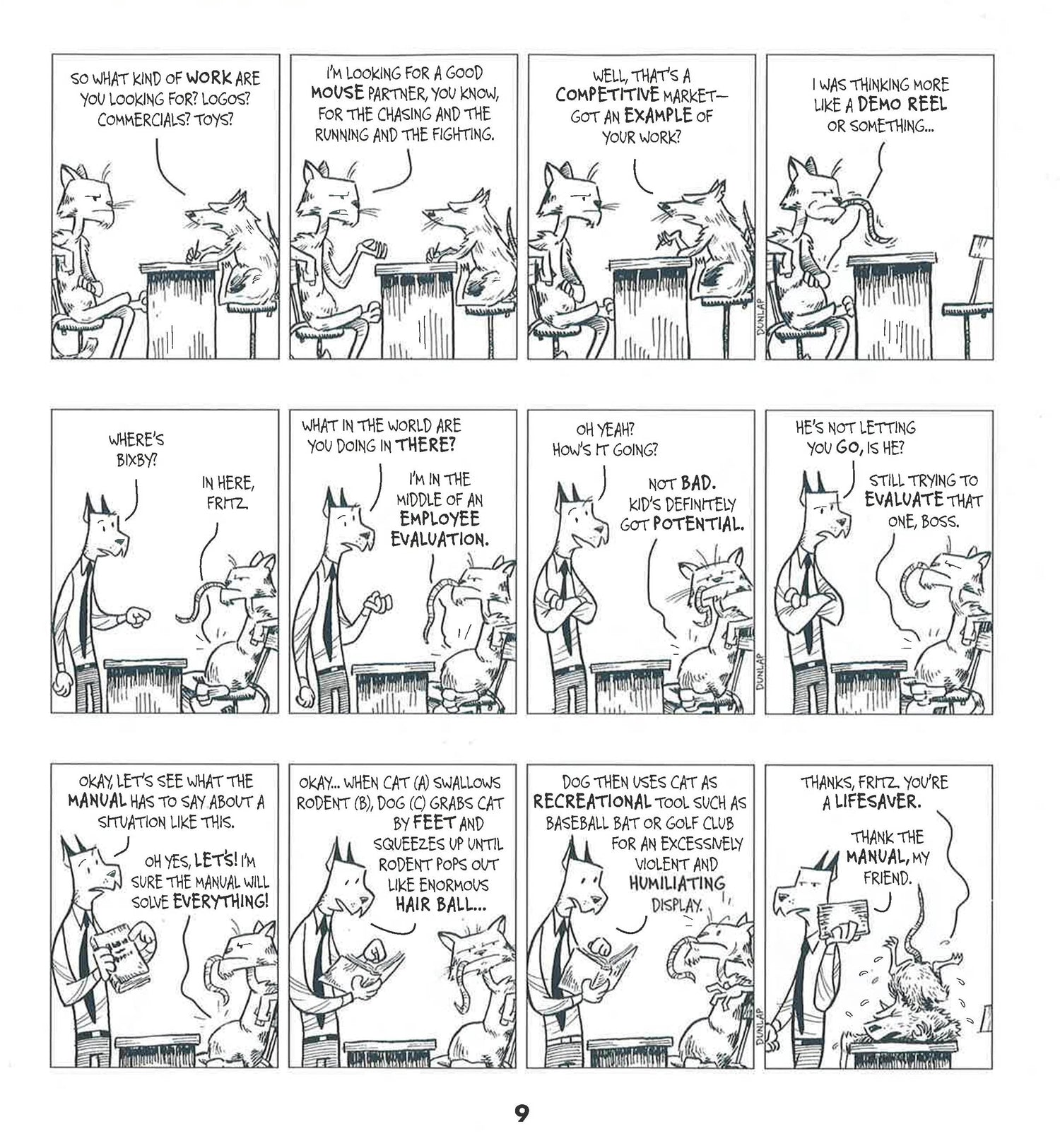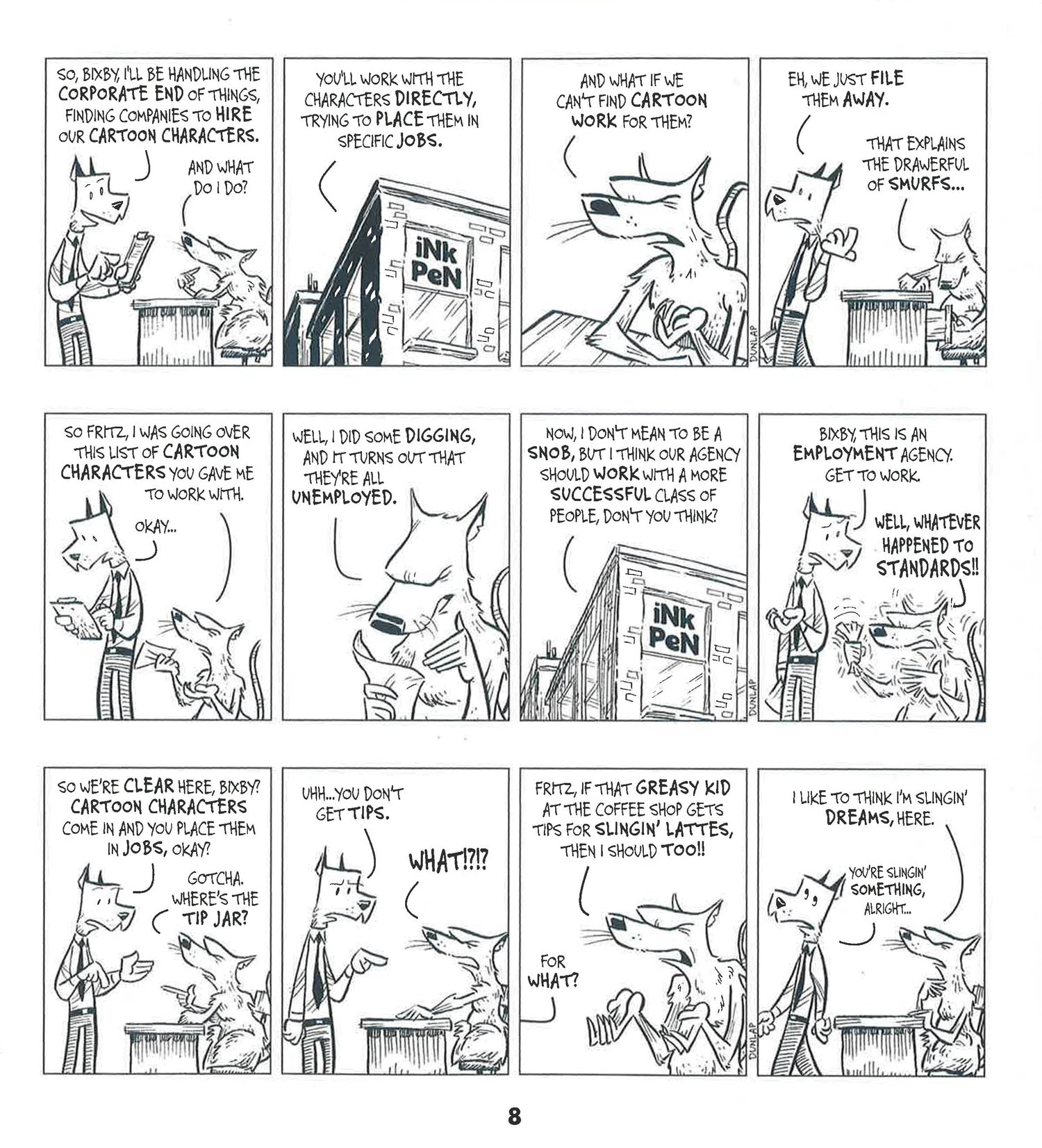 Ink Pen" never runs out of insights into the seedy underbelly of cartoon character employment. Dunlap has a truly unique perspective and storytelling style about the odd world of cartooning.From the very first frame, "Ink Pen" invites us to encounter the struggles of Hamhock, the talking pig who tries to make his big break into the biz. But it's a ruthless one that sees him only as a side of the other white meat. We quickly learn that rejection only makes us stronger . . . or slightly more stupid. Read and laugh as Hamhock and an array of plucky sidekicks are thrust into danger by careless superheroes and the villains they duel.