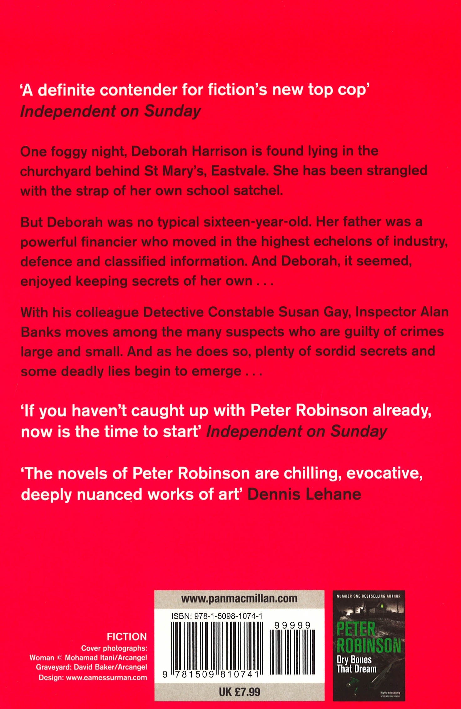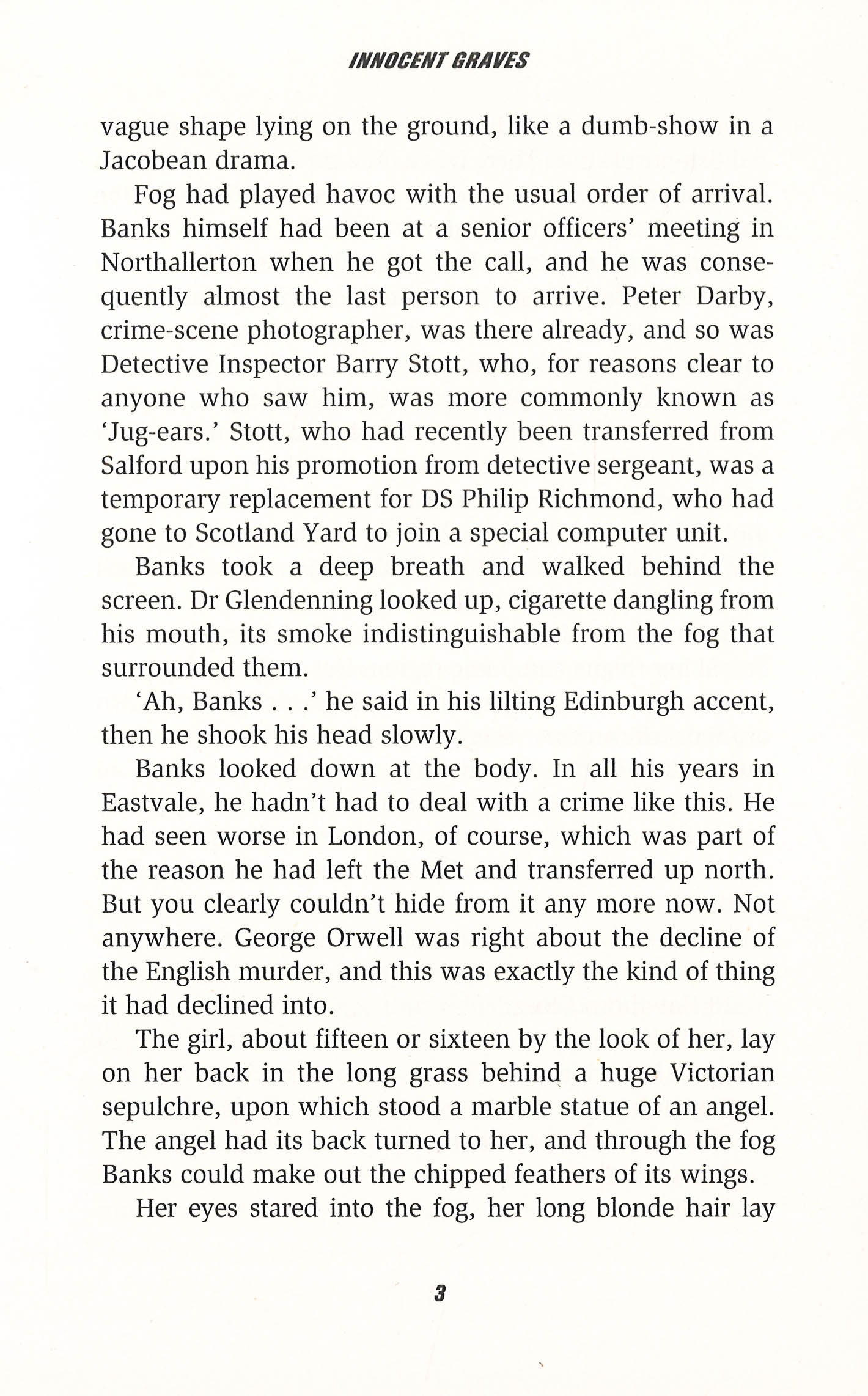 Innocent Graves is the eighth novel in Peter Robinson's Inspector Banks series, following on from Dry Bones That Dream.One foggy night, Deborah Harrison is found lying in the churchyard behind St Mary's, Eastvale. She has been strangled with the strap of her own school satchel. But Deborah was no typical sixteen-year old. Her father was a powerful financier who moved in the highest echelons of industry, defence and classified information. And Deborah, it seemed, enjoyed keeping secrets of her own . . . With his colleague Detective Constable Susan Gay, Inspector Alan Banks moves along the many suspects, guilty of crimes large and small. And as he does so, plenty of sordid secrets and some deadly lies begin to emerge . . .Innocent Graves is followed by the ninth book in this Yorkshire-based crime series, Dead Right.