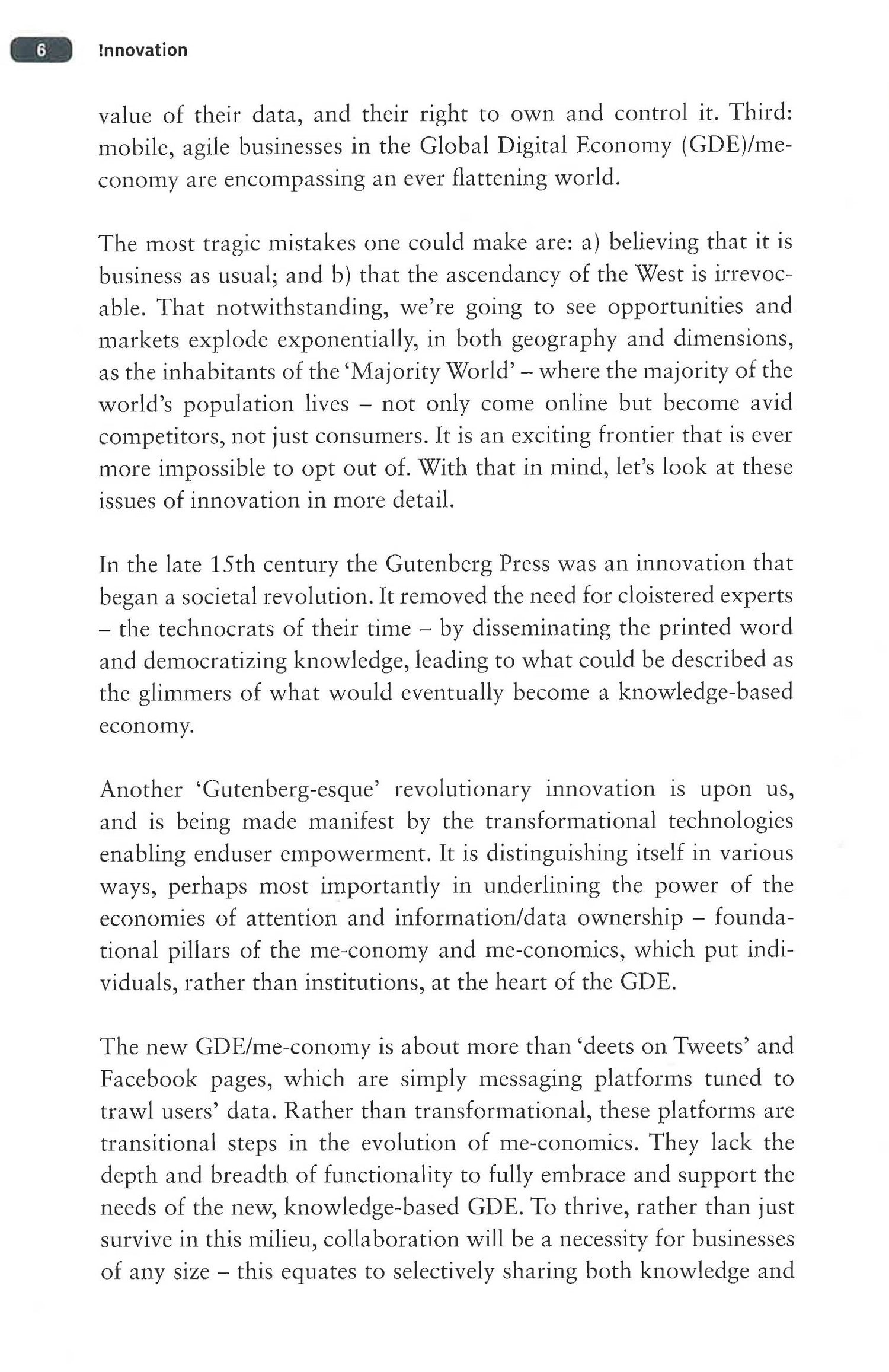 Any organisation looking to succeed in the global digital economy of today - and tomorrow - must innovate. Innovation introduces the global pioneers whose ideas and products have driven the changes that have revolutionised our world in every field. It showcases the pioneers who have broken the mould and led the pack in every field from business and technology to food, fashion, culture and healthcare. Drawing on exclusive interviews with more than 100 leading innovators from around the world, Innovation highlights the common denominators linking these highly creative people. It presents the inside track on who's done what, how they did it, what drives them on, and why innovation is so critical to individuals, businesses and to society as a whole. This book is a fascinating, fast-paced read and more importantly, it will empower you and your business to be more innovative too.