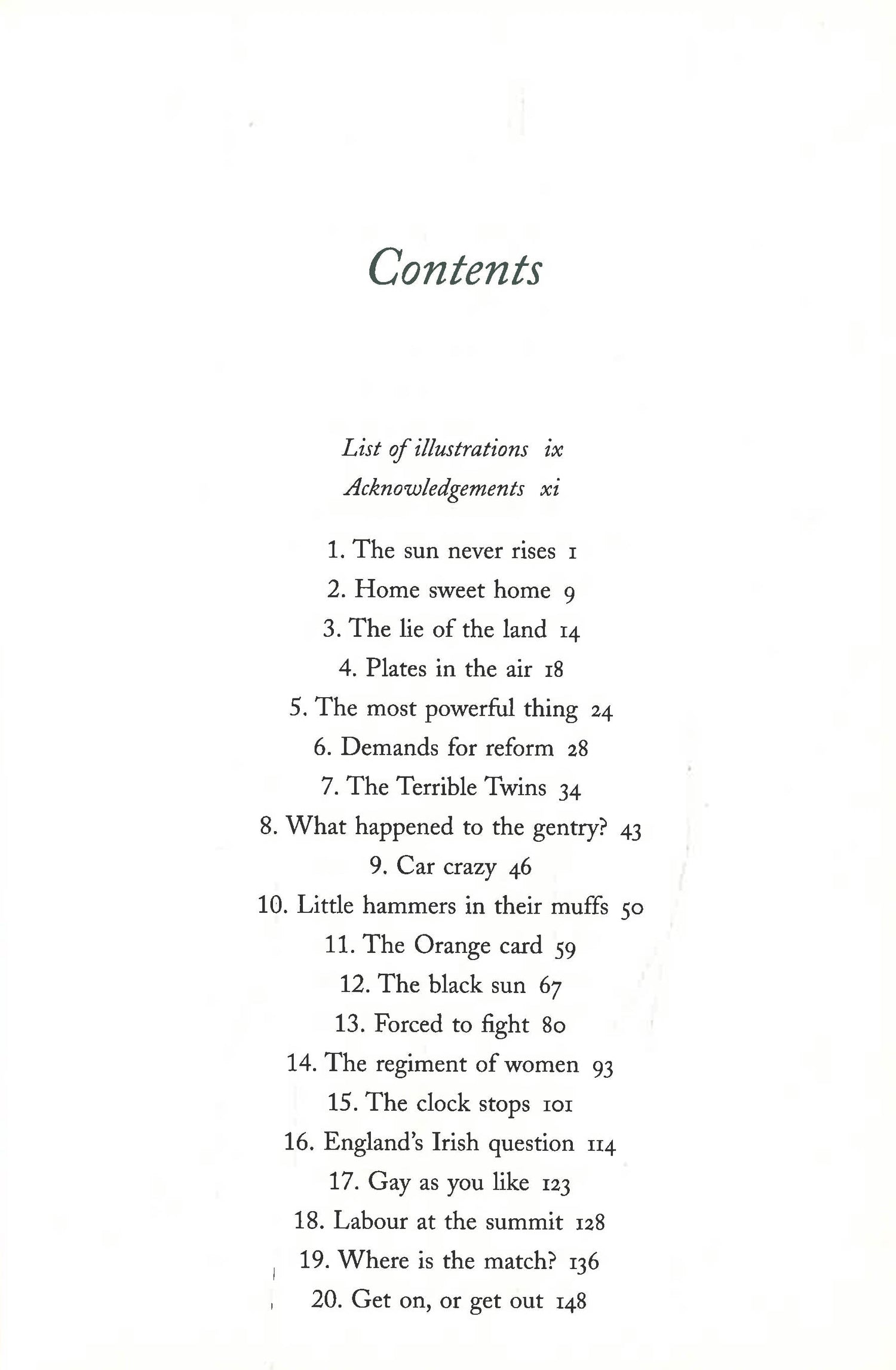 It was a century of enormous change, encompassing two world wars, four monarchs (Edward VII, George V, George VI and the Queen), the decline of the aristocracy and the rise of the Labour Party, women's suffrage, the birth of the NHS, the march of suburbia and the clearance of the slums. It was a period that saw the work of the Bloomsbury Group and T.S. Eliot, of Kingsley Amis and Philip Larkin, from the end of the post-war slump to the technicolor explosion of the 1960s, to free love and punk rock, and from Thatcher to Blair.