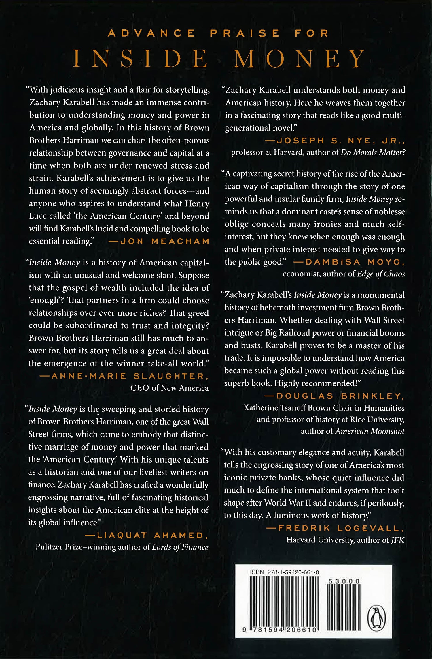 In Inside Money, acclaimed historian, commentator, and former financial executive Zachary Karabell offers the first full and frank look inside this institution against the backdrop of American history. Blessed with complete access to the company's archives, as well as a thrilling understanding of the larger forces at play, Karabell has created an X-ray of American power--financial, political, cultural--as it has evolved from the early 1800s to the present. Today, unlike many of its competitors, Brown Brothers Harriman remains a private partnership and a beacon of sustainable capitalism, having forgone the heady speculative upsides of the past thirty years but also having avoided any role in the devastating downsides. The firm is no longer in the command capsule of the American economy, but, arguably, that is to its credit. If its partners cleaved to any one adage over the generations, it is that a relentless pursuit of more can destroy more than it creates.