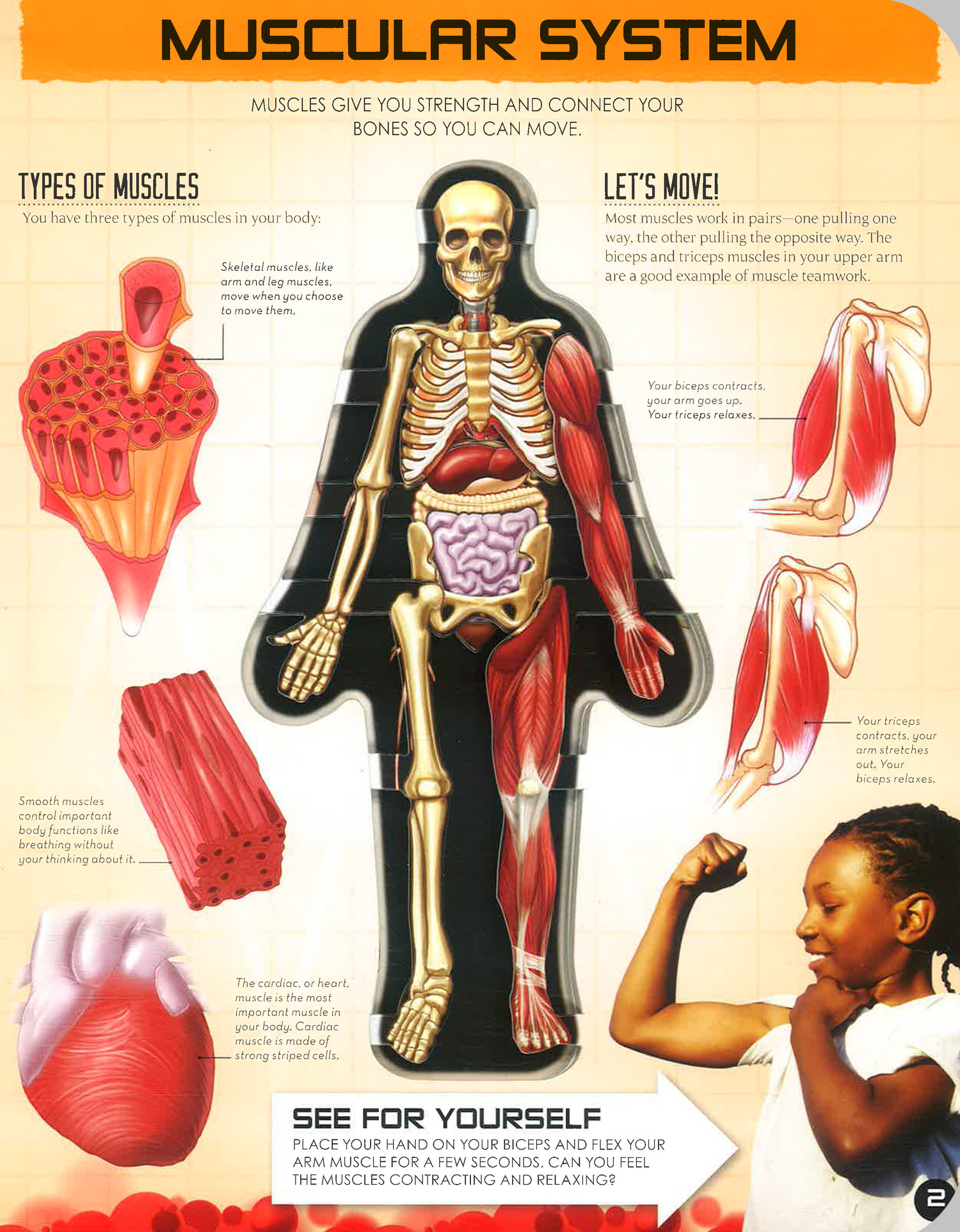 Inside Out Human Body features a layered 3-D model of the human body that serves as the center point of each section, revealing key body parts and functions, alongside entertaining and informative text that explains how the body works.