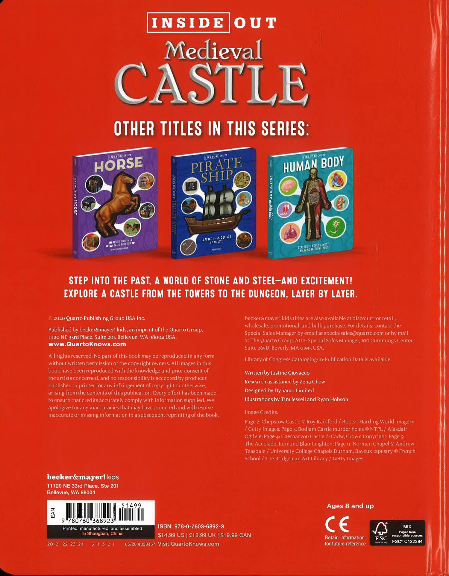 Step into the past, a world of stone and steel--and excitement! Inside Out: Medieval Castle includes everything you need to start your medieval adventure, from scaling a tower to outfitting an armory. Alongside beautiful illustrations and photographs featuring real-life castles, an interactive die-cut model reveals the many parts of an ancient castle. Though most people live in regular houses now, castles have influenced both architecture and lifestyles across the centuries. From their original purpose of defense and protection, to their housing of royalty and knights, Inside Out: Medieval Castle exposes all the nooks and crannies of the medieval castle and ways of living. Be amazed by everything from the daunting portcullis, to the intricate staircases, to the dark dungeons. ?