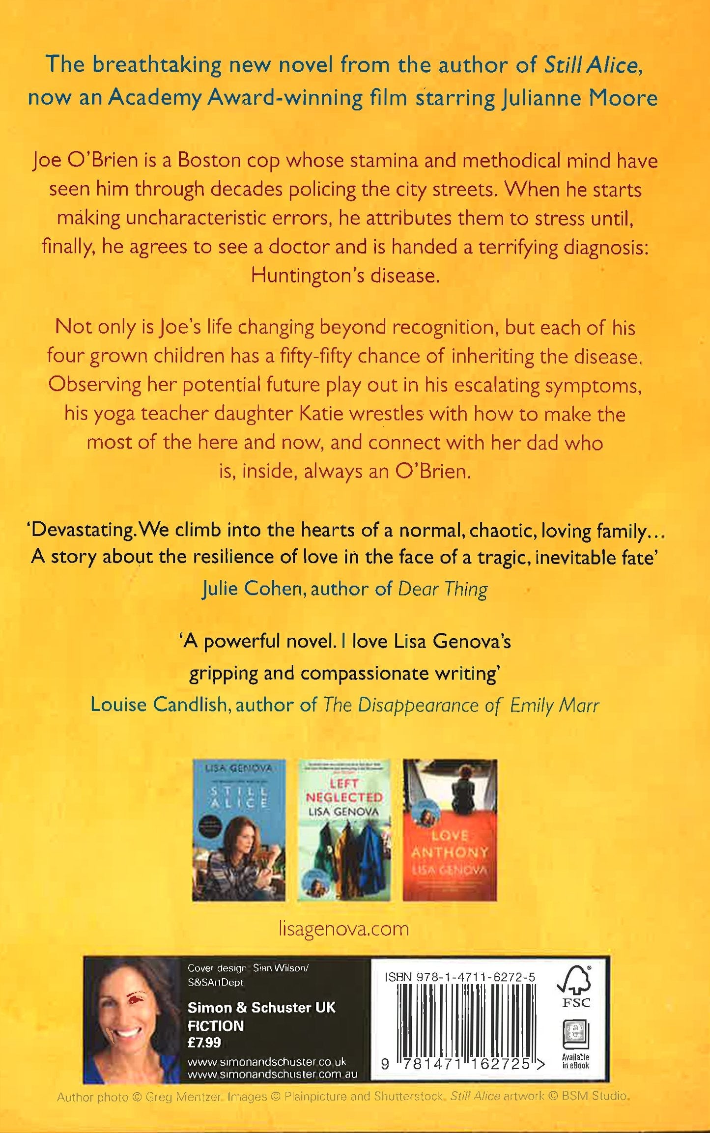 The breathtaking new novel from the author of STILL ALICE, which was adapted into an Oscar-winning film starring Julianne Moore. Joe O'Brien is a Boston cop; his physical stamina and methodical mind have seen him through decades policing the city streets, while raising a family with his wife Rosie. When he starts committing uncharacteristic errors - mislaying his police weapon, trouble writing up reports, slurred speech - he attributes them to stress. Finally, he agrees to see a doctor and is handed a terrifying, unexpected diagnosis: Huntington's disease. Not only is Joe's life set to change beyond recognition, but each of his four grown children has a fifty-fifty chance of inheriting the disease. Observing her potential future play out in his escalating symptoms, his pretty yoga teacher daughter Katie wrestles with how to make the most of the here and now, and how to care for her dad who is, inside, always an O'Brien. Inside the O'Briens is a powerfully true and tender elegy to the resilience of the human spirit.