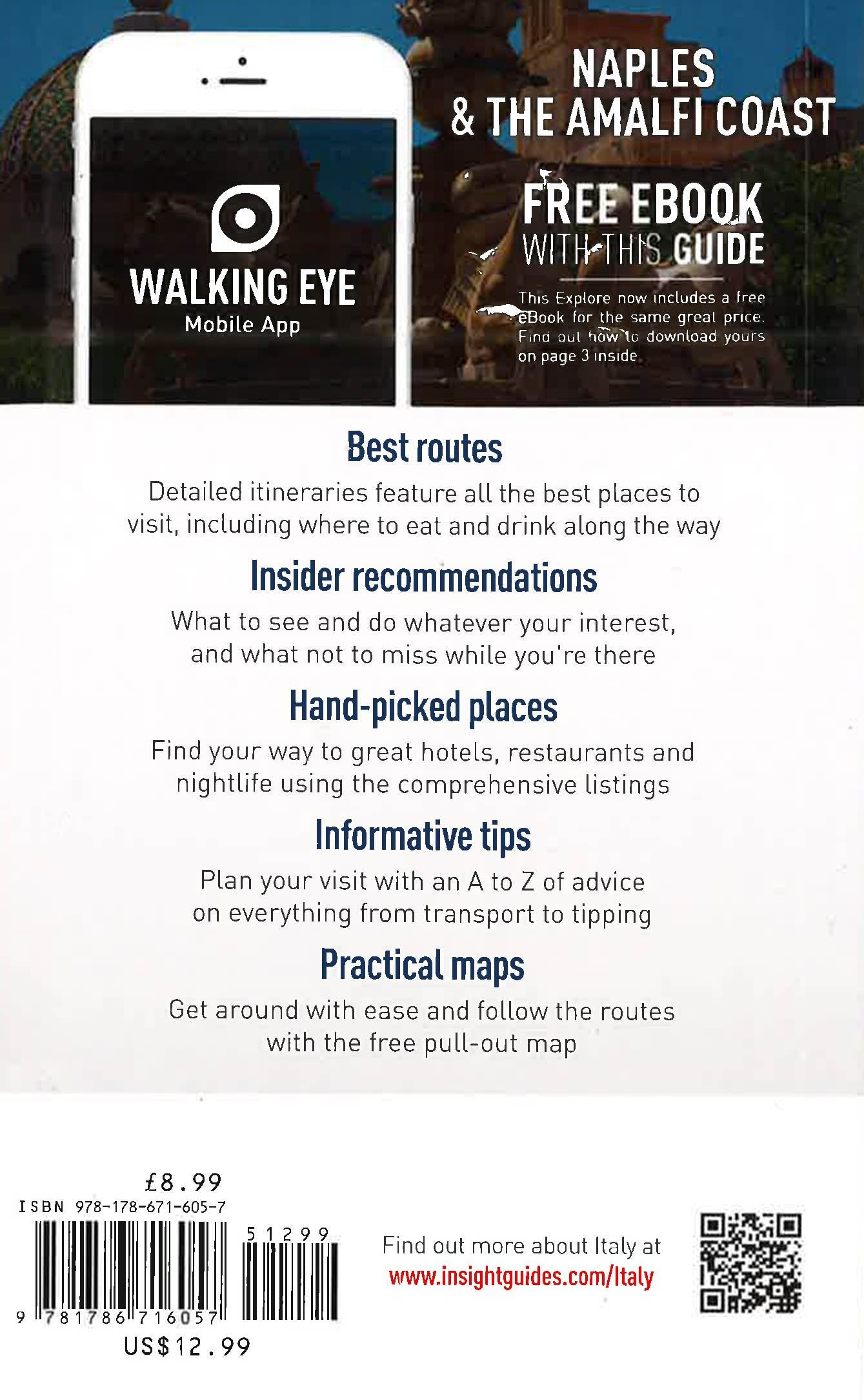 Ideal itineraries and top travel tips in a pocket-sized package. Now with free eBook, and a pull-out map. Plan your trip, plan perfect days and discover how to get around - this Insight Guides pocket-sized book is a convenient, quick-reference companion to discovering what to do and see in Naples, Capri and the Amalfi Coast, from top attractions like Positano, to hidden gems, including the best pizza restaurants. * Compact, concise, and packed with essential information about Where to Go and What Do, this is an ideal on-the-move companion when you're exploring Naples, Capri and the Amalfi Coast * Covers Top Ten Attractions, including the Blue Grotto and Herculaneum and Perfect Day itinerary suggestions * Offers an insightful overview of landscape, history and culture * Contains an invaluable pull-out map, and essential practical information on everything from Eating Out to Getting Around * Includes an innovative extra that's unique in the market - all Pocket Guides come with a free eBook * Inspirational colour photography throughout * Sharp design and colour-coded sections make for an engaging reading experience About Insight Guides: Insight Guides is a pioneer of full-colour guide books, with almost 50 years' experience of publishing high-quality, visual travel guides with user-friendly, modern design. We produce around 400 full-colour print guide books and maps, as well as phrase books, picture-packed eBooks and apps to meet different travellers' needs. Insight Guides' unique combination of beautiful travel photography and focus on history and culture create a unique visual reference and planning tool to inspire your next adventure.