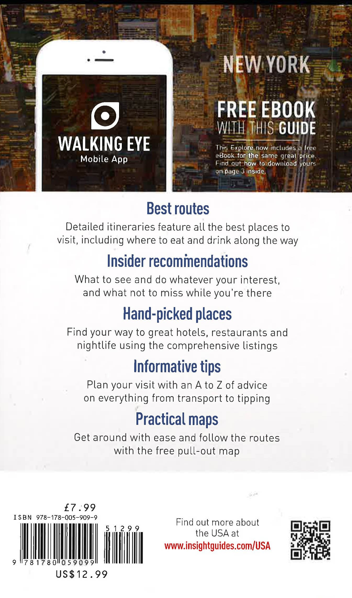Pocket-sized books to inspire your on-foot exploration of top international destinations. Now with free eBook. Experience the best of New York with this indispensably practical Insight Guides Explore book. From making sure you don't miss out on must-see attractions like the Statue of Liberty to discovering hidden gems, including the Harlem's Apollo, the easy-to-follow, ready-made walking routes will help you plan your trip, save you time, and enhance your exploration of this fascinating state. * Practical, pocket-sized and packed with inspirational insider information, this will make the ideal on-the-move companion for your trip to New York * Enjoy over 18 irresistible Best Routes to walk, from Fifth Avenue to Brooklyn * Features concise insider information about landscape, history, food and drink, and entertainment options * Invaluable maps: each Best Route is accompanied by a detailed full-colour map, while the large pull-out map provides an essential overview of the area * Discover your destination's must-see sights and hand-picked hidden gems * Directory section provides invaluable insight into top accommodation, restaurant and nightlife options by area, along with an overview of language, books and films * Includes an innovative extra that's unique in the market - all Explore Guides come with a free eBook * Inspirational colour photography throughout About Insight Guides: Insight Guides is a pioneer of full-colour guide books, with almost 50 years' experience of publishing high-quality, visual travel guides with user-friendly, modern design. We produce around 400 full-colour print guide books and maps as well as phrase books, picture-packed eBooks and apps to meet different travellers' needs. Insight Guides' unique combination of beautiful travel photography and focus on history and culture create a unique visual reference and planning tool to inspire your next adventure.