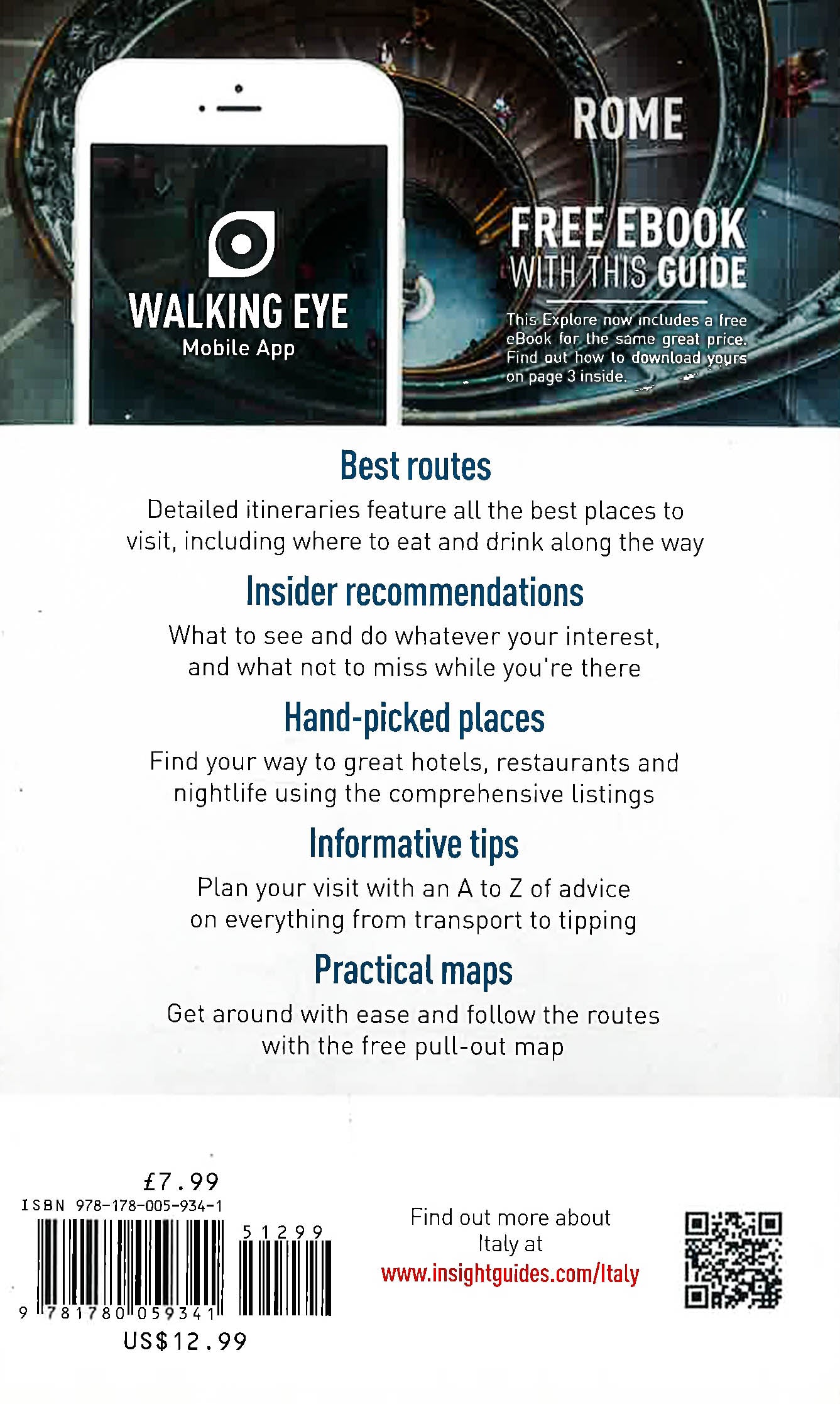 Experience the best of Rome with this indispensably practical Insight Guides Explore book. From making sure you don't miss out on must-see attractions like the Spanish Steps to discovering hidden gems, including Monti, the easy-to-follow, ready-made walking routes will help you plan your trip, save you time, and enhance your exploration of this fascinating city. * Practical, pocket-sized and packed with inspirational insider information, this will make the ideal on-the-move companion for your trip to Rome Enjoy over 17 irresistible Best Routes to walk, from the Roman Forum to Ostia Antica * Features concise insider information about landscape, history, food and drink, and entertainment options * Invaluable maps: each Best Route is accompanied by a detailed full-colour map, while the large pull-out map provides an essential overview of the area * Discover your destination's must-see sights and hand-picked hidden gems * Directory section provides invaluable insight into top accommodation, restaurant and nightlife options by area, along with an overview of language, books and films * Includes an innovative extra that's unique in the market - all Explore Guides come with a free eBook * Inspirational colour photography throughout About Insight Guides: Insight Guides is a pioneer of full-colour guide books, with almost 50 years' experience of publishing high-quality, visual travel guides with user-friendly, modern design. We produce around 400 full-colour print guide books and maps as well as phrase books, picture-packed eBooks and apps to meet different travellers' needs. Insight Guides' unique combination of beautiful travel photography and focus on history and culture create a unique visual reference and planning tool to inspire your next adventure.