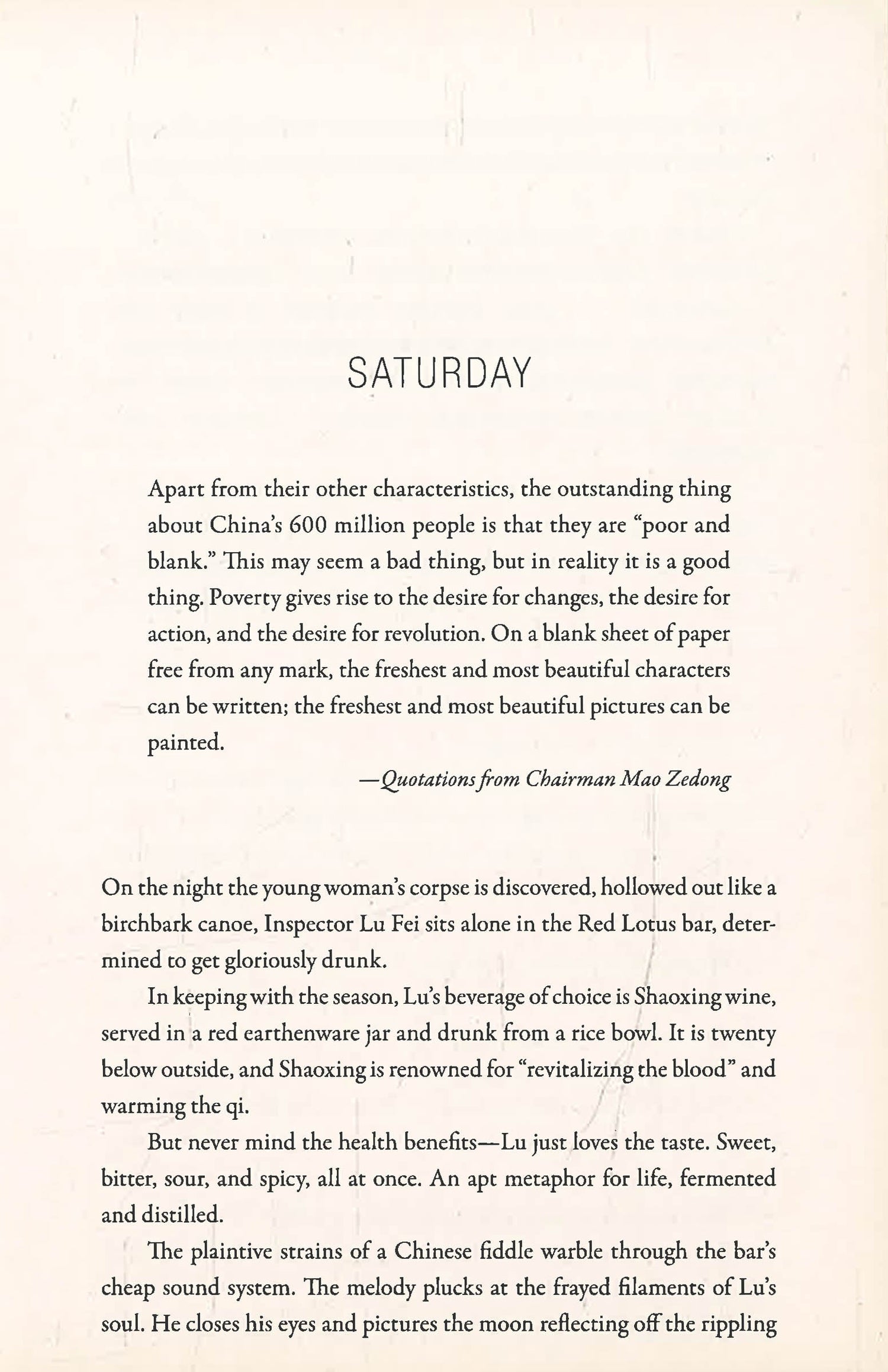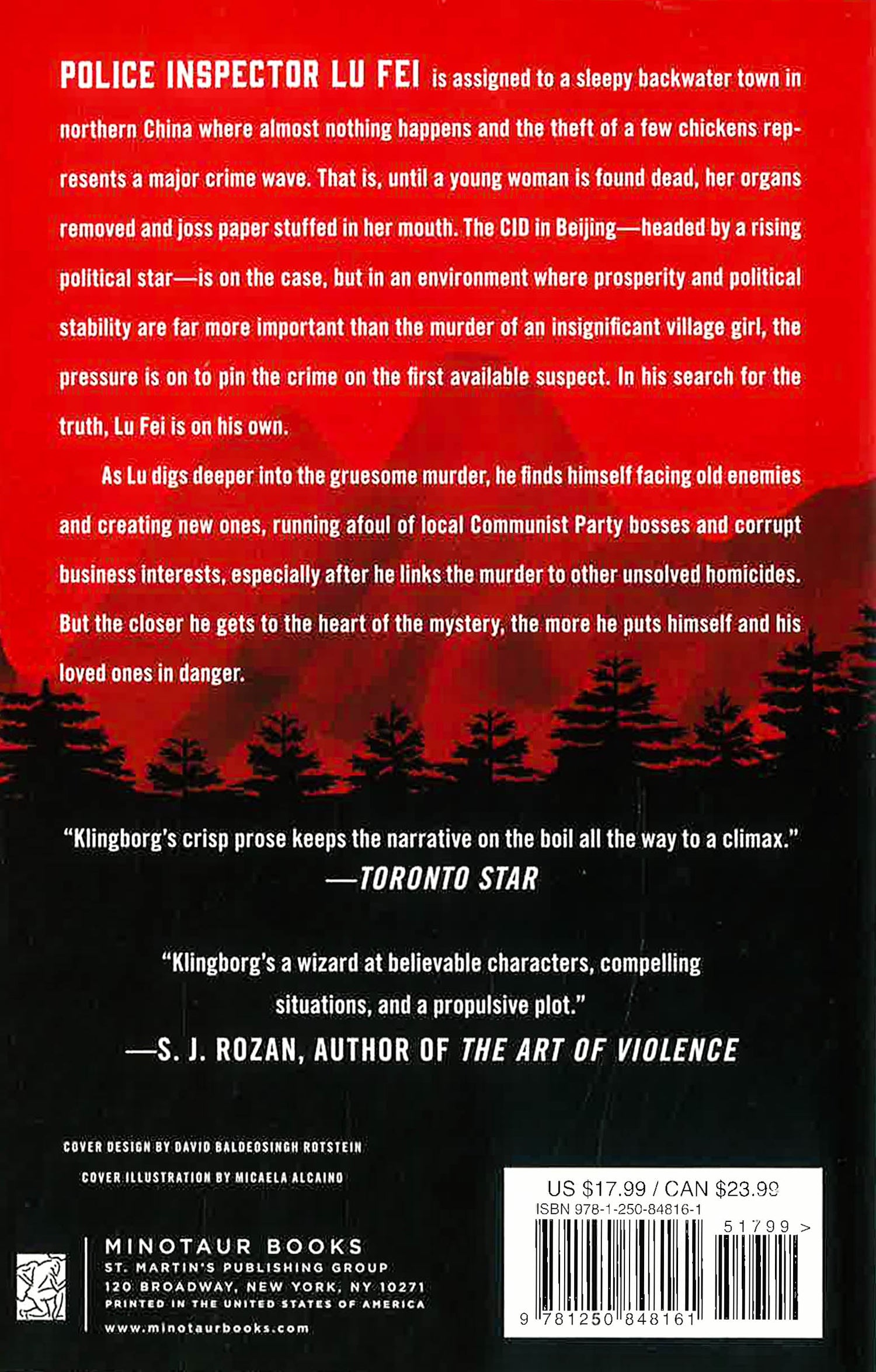 Lu Fei is a graduate of China's top police college but he's been assigned to a sleepy backwater town in northern China, where almost nothing happens and the theft of a few chickens represents a major crime wave. That is until a young woman is found dead, her organs removed, and joss paper stuffed in her mouth. The CID in Beijing-headed by a rising political star-is on the case but in an increasingly authoritarian China, prosperity and political stability are far more important than solving the murder of an insignificant village girl. As such, the CID head is interested in pinning the crime on the first available suspect rather than wading into uncomfortable truths, leaving Lu Fei on his own.