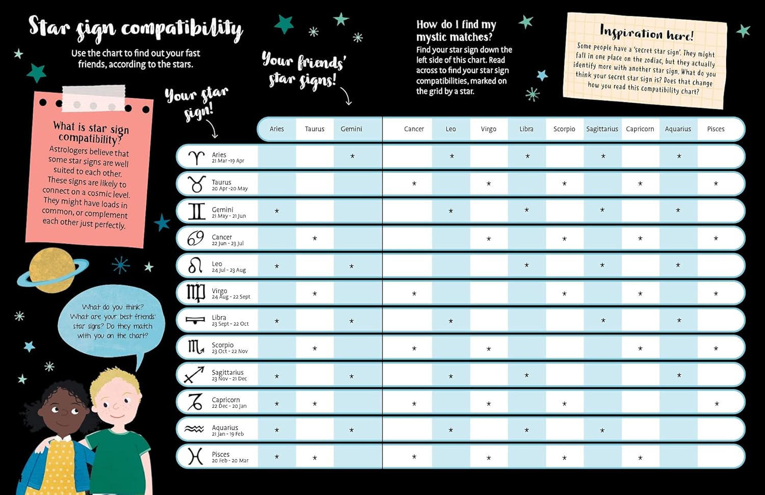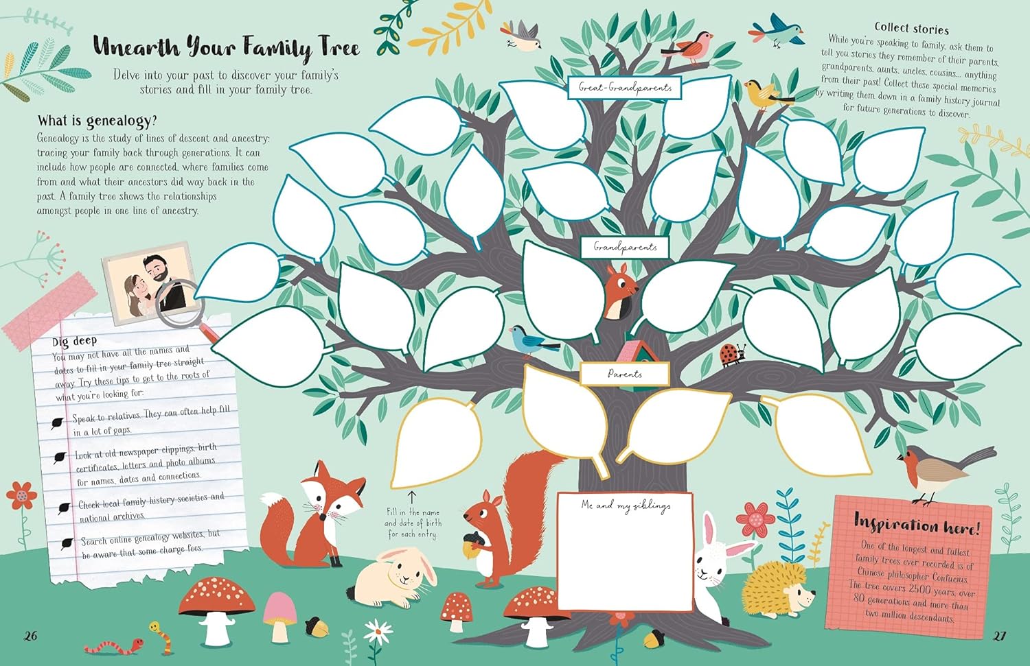 Contents include: Doodles, Drawing techniques, Painting, Origami, Make your own greetings cards, Make a den, Host a slumber party, How to Hygge, Journaling tips, Story writing inspiration, Write a haiku, Word searches, Sudoku, Morse code, Calligraphy, Handwriting analysis, Learn sign language, Make bath bombs, Recipes, Plant kitchen herbs, Flower pressing, Make your own jewelry, Yoga poses, Meditation techniques, Start a dream diary, Make a terrarium, Make a time capsule, Are you an introvert/extrovert quiz, An interview with you, Your hopes and fears, Create a thumbprint family tree.