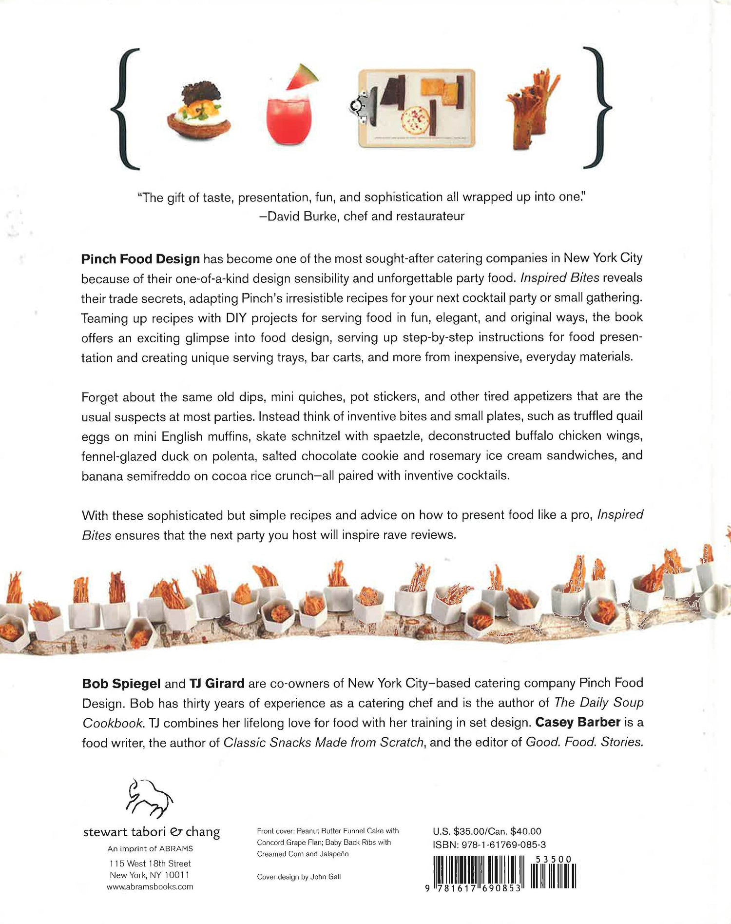 TJ Girard and Bob Spiegel, co-owners of the catering company Pinch Food Design, are known for their unforgettable party food and one-of-a-kind design sensibility. This book reveals their trade secrets, offering up irresistible recipes for your next cocktail party-paired with DIY projects for presenting food in fun, elegant, and original ways. Forget about the same old tired dips, mini quiches, and pot stickers. Instead think truffled quail eggs on mini English muffins, skate schnitzel with spaetzle, deconstructed buffalo chicken wings, fennel glazed duck on polenta, salted chocolate cookie with rosemary ice cream sandwiches, banana semifreddo on cocoa rice crunch, and more. With these addictively delicious recipes and advice on how to present food like a pro, Inspired Bites ensures the next gathering you host will be a memorable one.