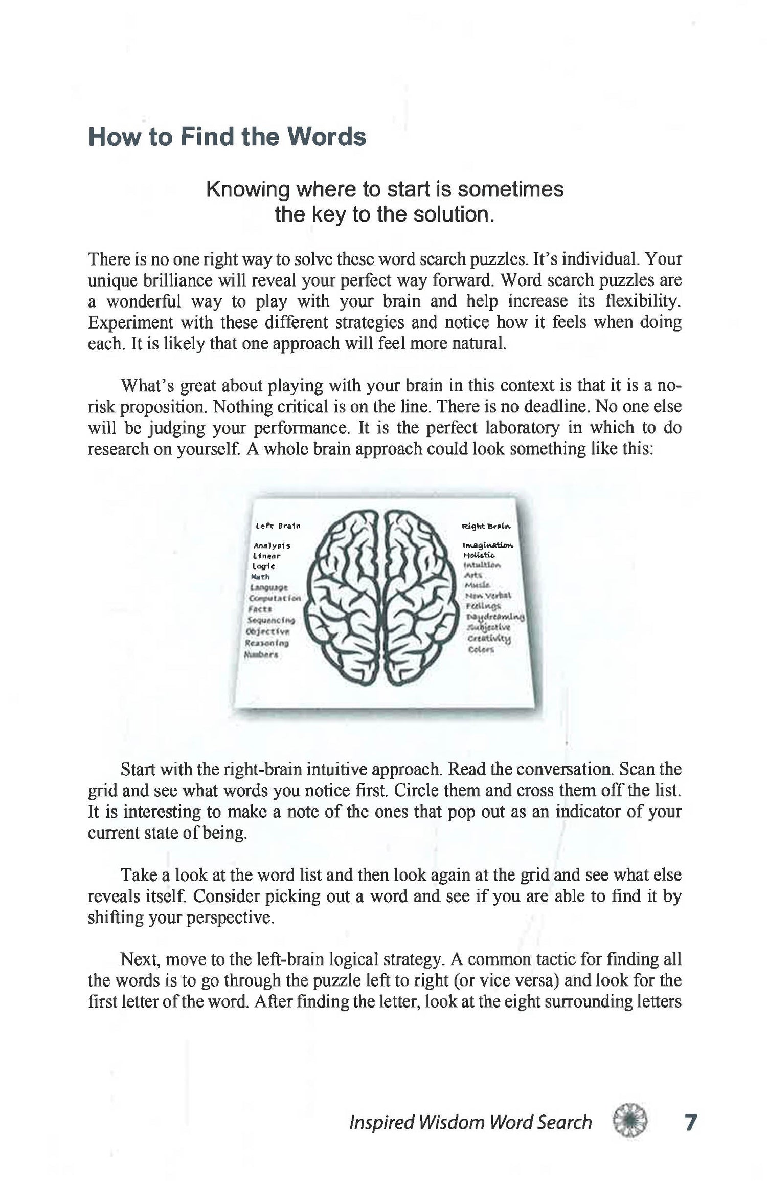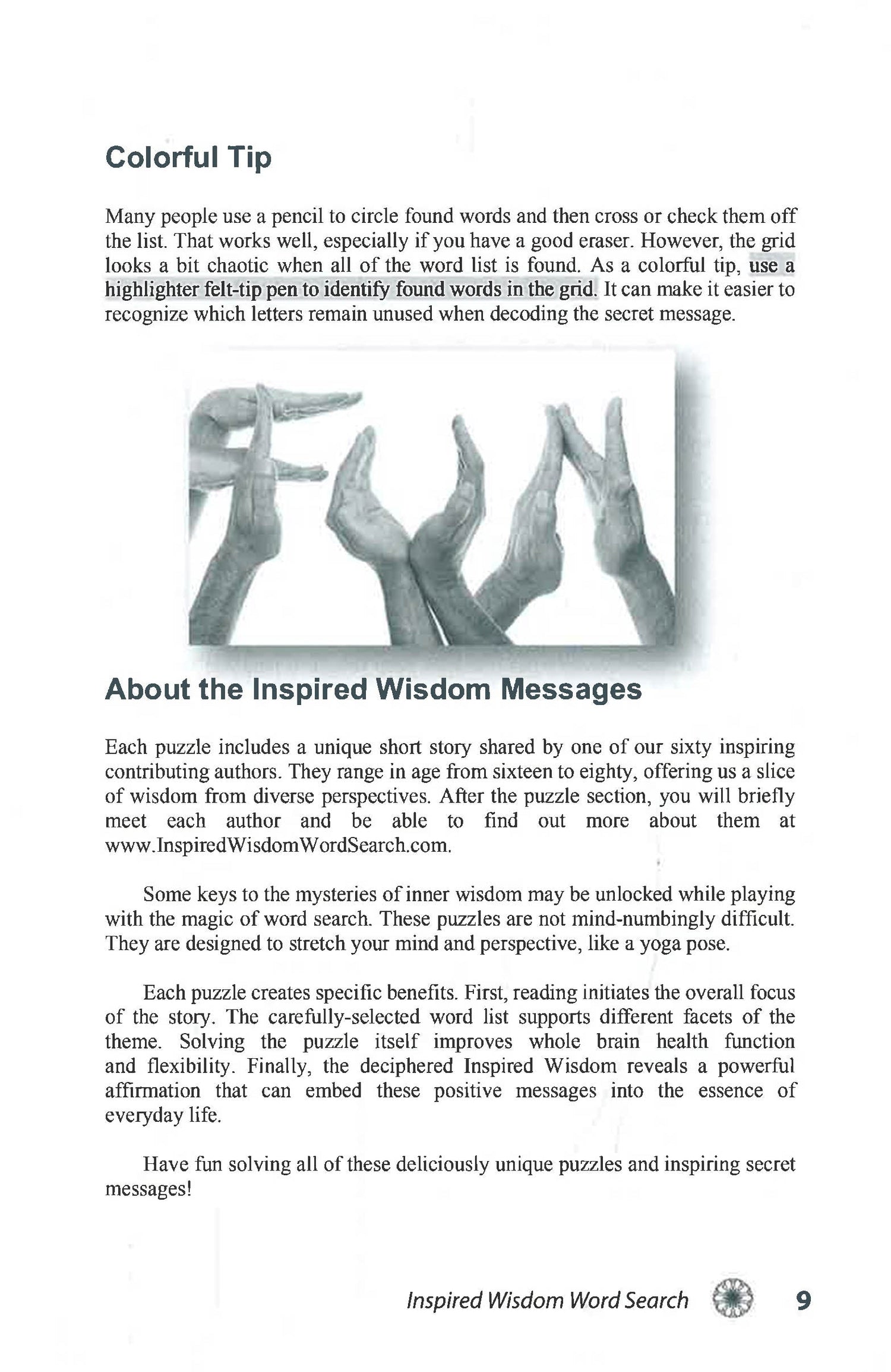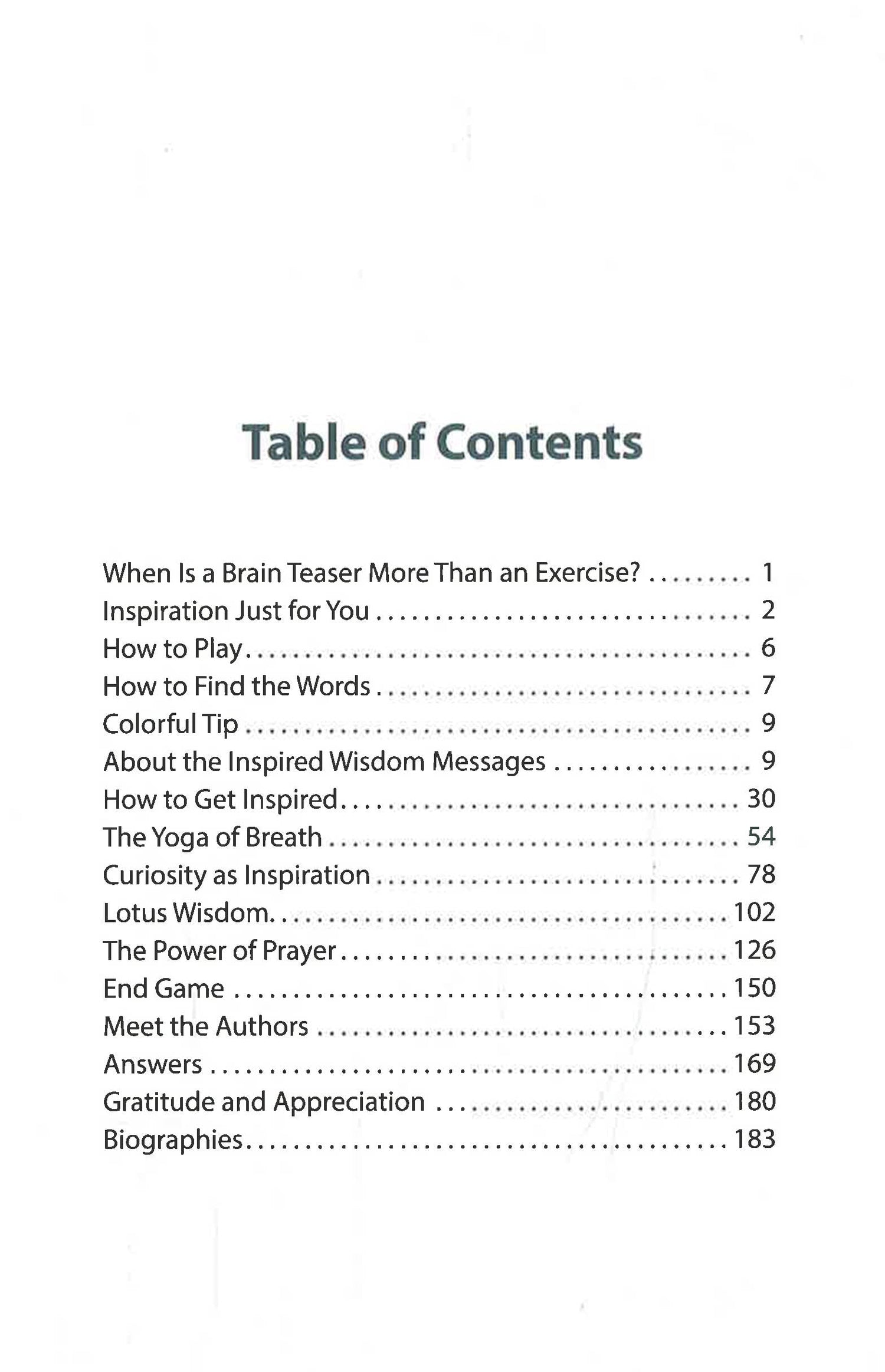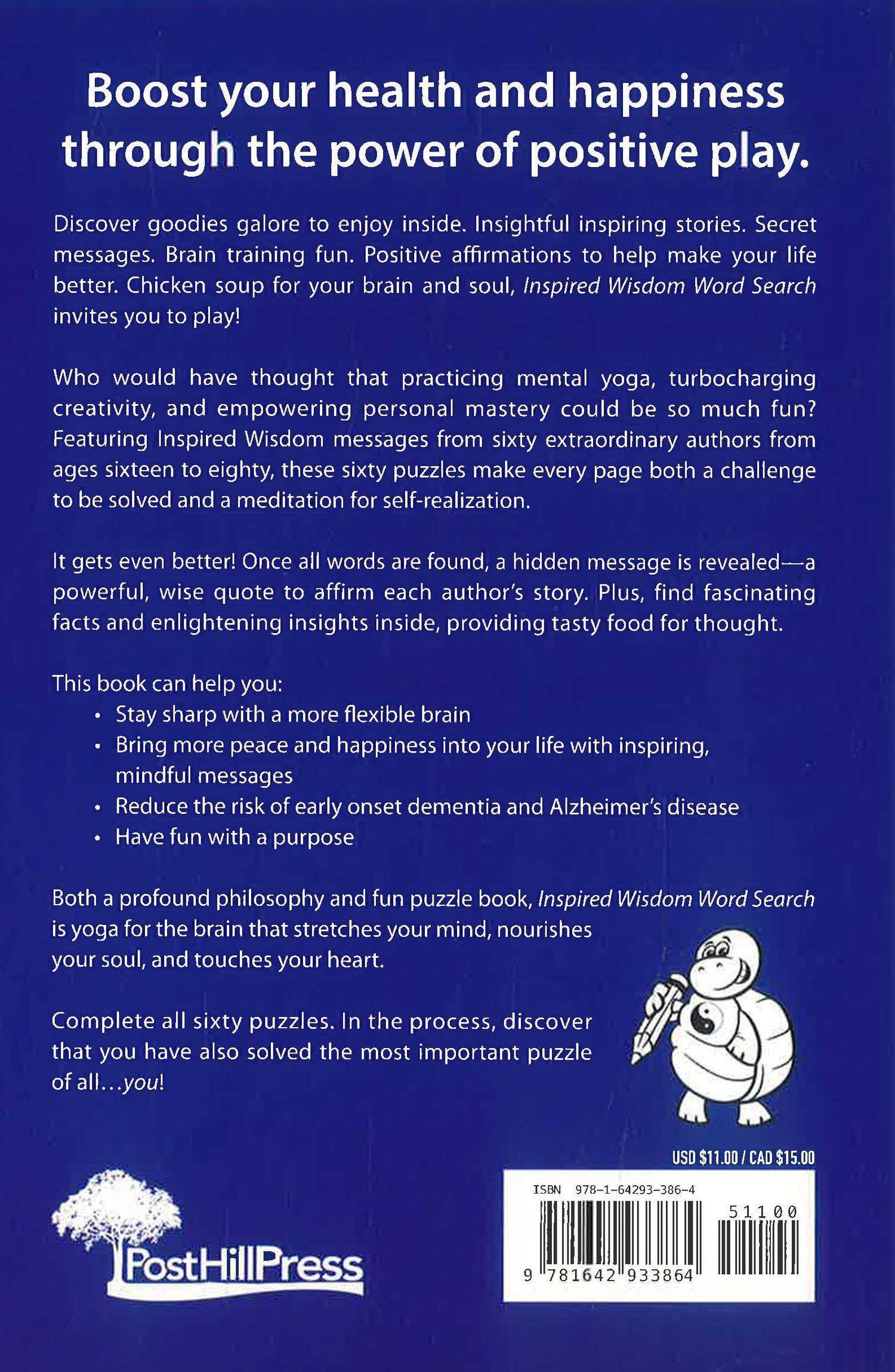 Boost your health and happiness through the power of positive play. Discover goodies galore to enjoy inside. Insightful inspiring stories. Secret messages. Brain training fun. Positive affirmations to help make your life better. Chicken soup for your brain and soul, Inspired Wisdom Word Search invites you to play! Who would have thought that practicing mental yoga, turbocharging creativity, and empowering personal mastery could be so much fun? Featuring Inspired Wisdom messages from sixty extraordinary authors from ages sixteen to eighty, these sixty puzzles make every page both a challenge to be solved and a meditation for self-realization. It gets even better! Once all words are found, a hidden message is revealed—a powerful, wise quote to affirm each author’s story. Plus, find fascinating facts and enlightening insights inside, providing tasty food for thought. This book can help you: Stay sharp with a more flexible brain.Bring more peace and happiness into your life with inspiring, mindful messages.Reduce the risk of early onset dementia and Alzheimer’s disease.Have fun with a purpose. Both a profound philosophy and fun puzzle book, Inspired Wisdom Word Search is yoga for the brain that stretches your mind, nourishes your soul, and touches your heart. Complete the sixty puzzles inside. In the process, discover that you have also solved the most important puzzle of all…you!