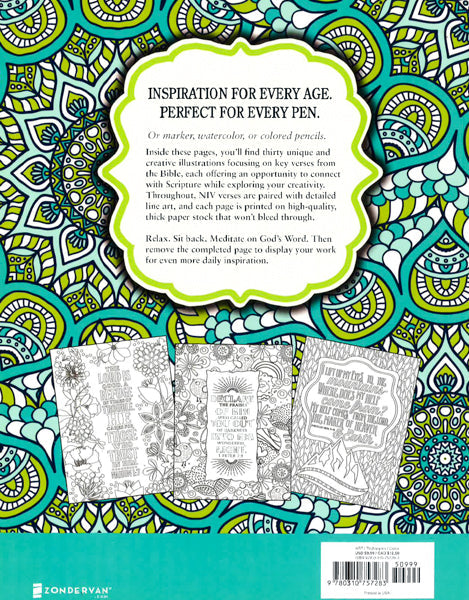 Relax, sit back, and meditate on God's Word through this unique and inspiring coloring book, featuring 30 beautiful illustrations to color while you connect with Scripture and explore your creativity. The Inspiring Words Coloring Book pairs key verses from the Bible with detailed line art, each page offering an opportunity to mediate on God's Word as you take a much-needed break from the noise and stress of everyday life. Inside these pages, teens to adults will find 30 unique and imaginative illustrations printed on high-quality, thick paper stock that won't bleed through. Whether you use markers, pens, watercolors, or colored pencils, when you're finished coloring, the completed page can be removed to display your work at home, in the office, or anywhere else you need daily inspiration. The Inspiring Words Coloring Book: Contains 30 NIV Bible-based inspirational coloring designs Is designed with thick, non-perforated paper stock that won't bleed through from one page to the next Focuses on key verses from the Bible, each offering an opportunity to connect with Scripture while exploring your creativity Is a perfect addition to classrooms, Sunday school classes, at home, or at the office Is the go-to birthday, First Communion, or graduation gift for the art lover in your life