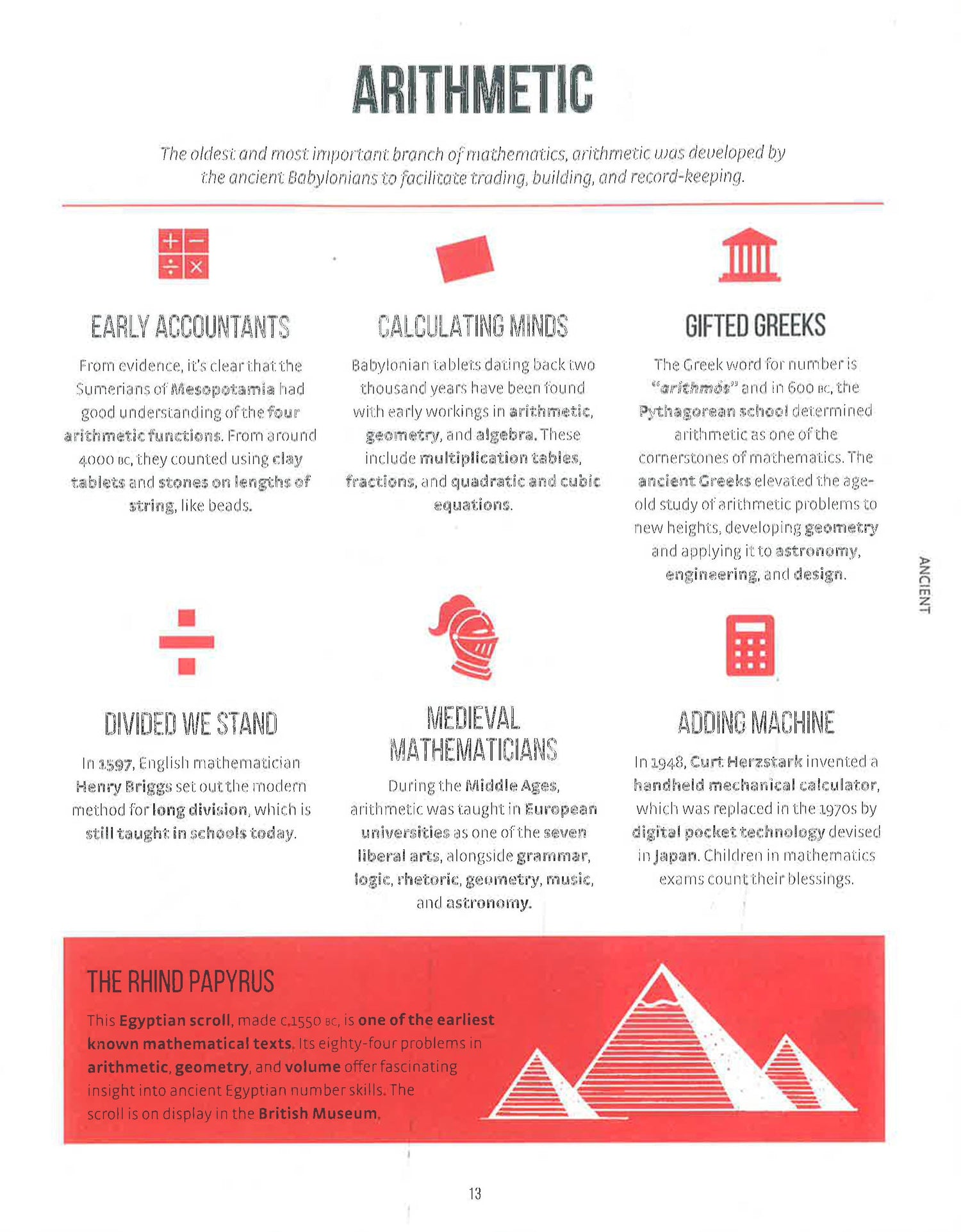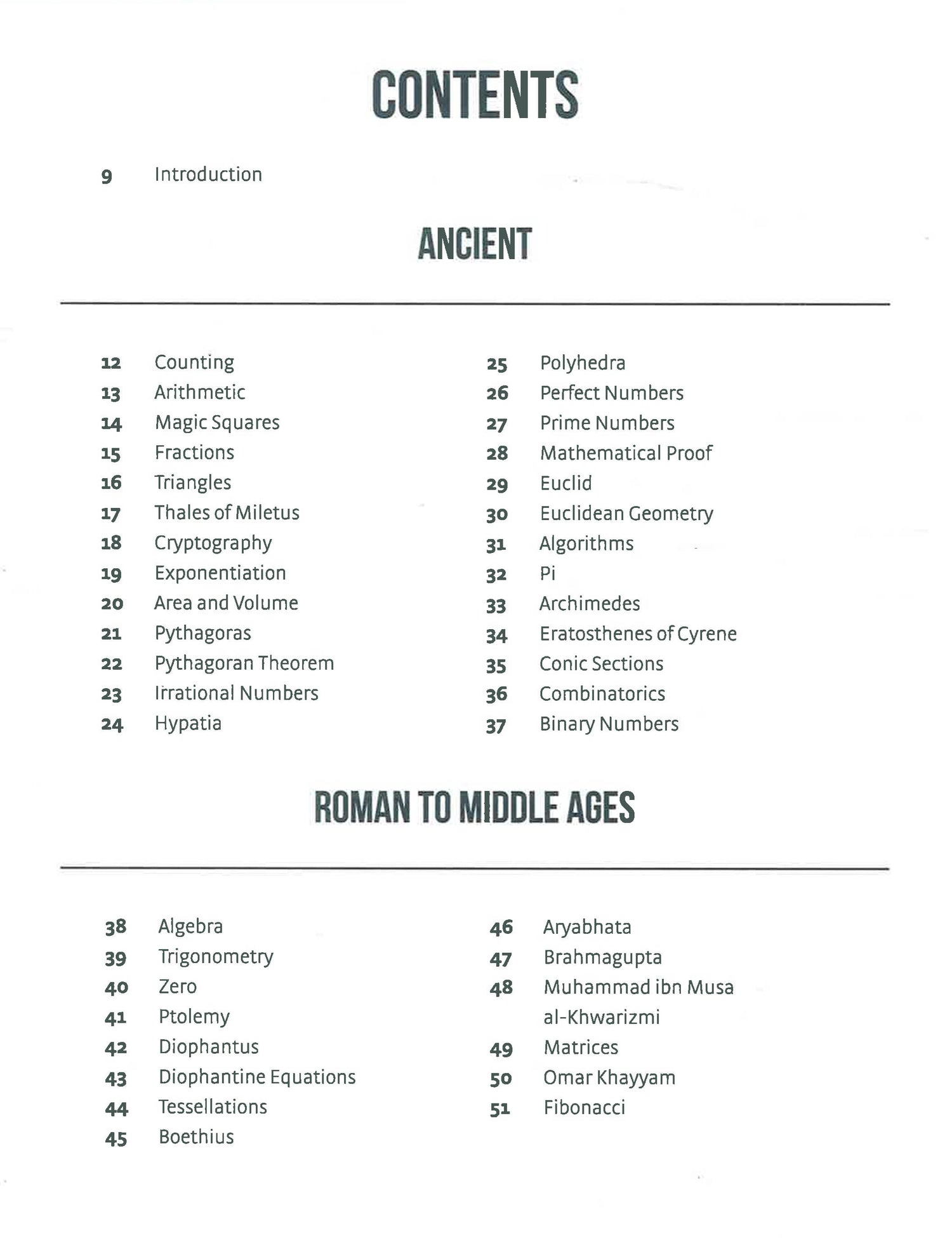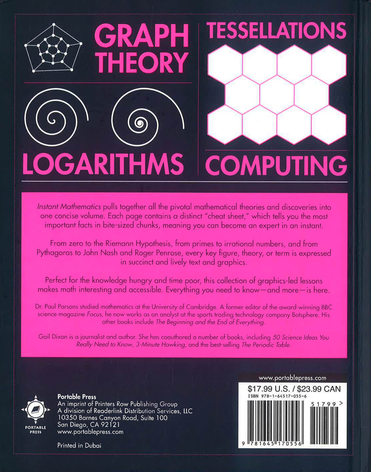 Instant Mathematics pulls together all the pivotal mathematical theories and discoveries into one concise volume. Each page contains a distinct “cheat sheet,” which tells you the most important facts in bite-size chunks, so you can feel like an expert in minutes! From zero to the Riemann Hypothesis, from primes to irrational numbers, and from Pythagoras to John Nash and Roger Penrose—every key figure, theory, or term is expressed in succinct and lively text and graphics. Perfect for the knowledge-hungry and time-poor, this collection of graphics-led lessons makes math interesting and accessible. Everything you need to know—and more!—packed into one convenient volume.