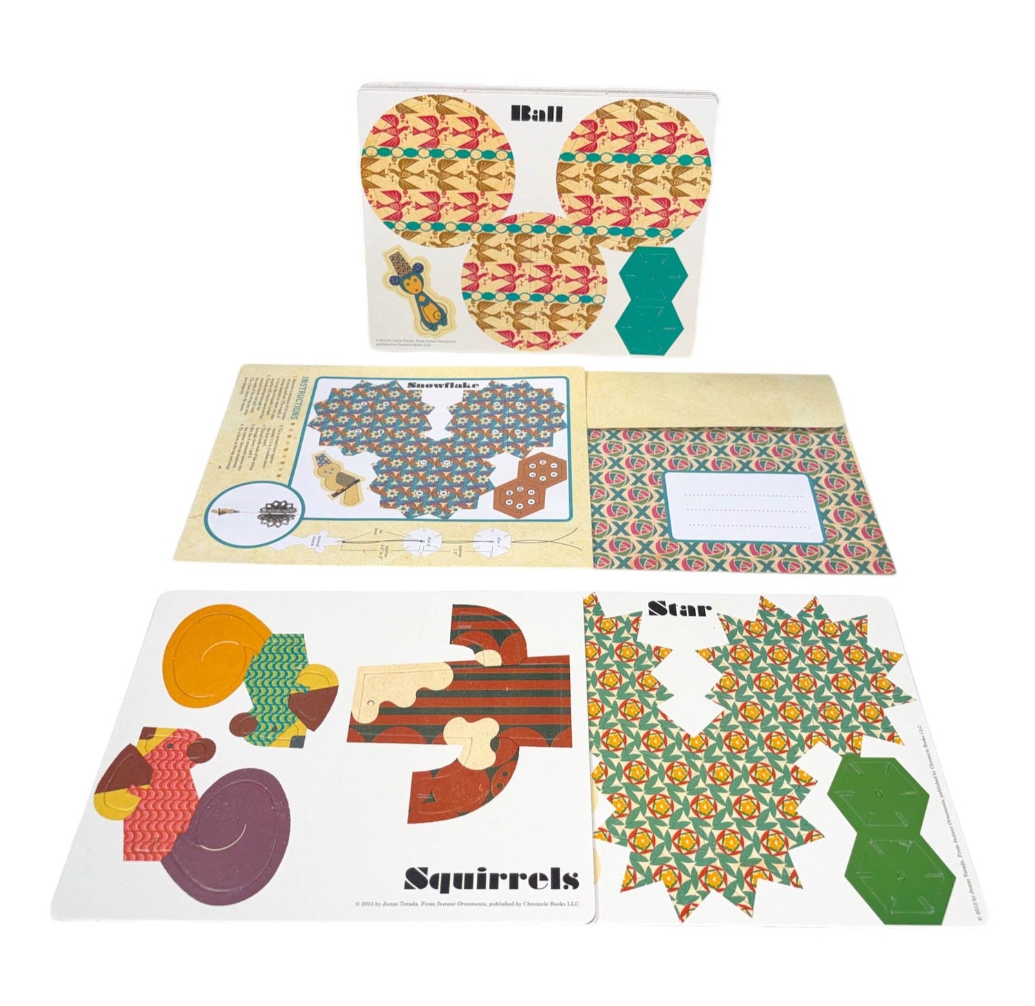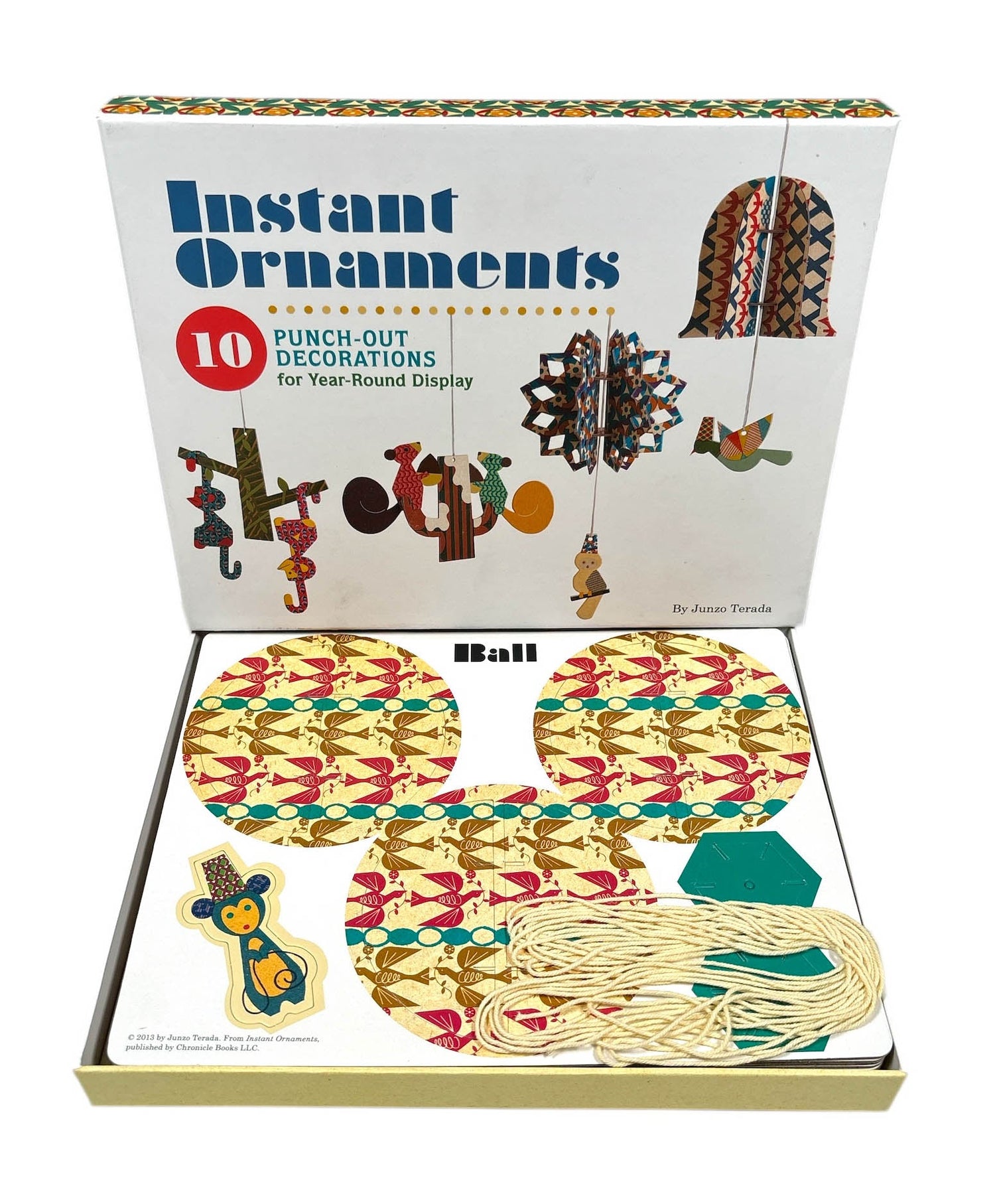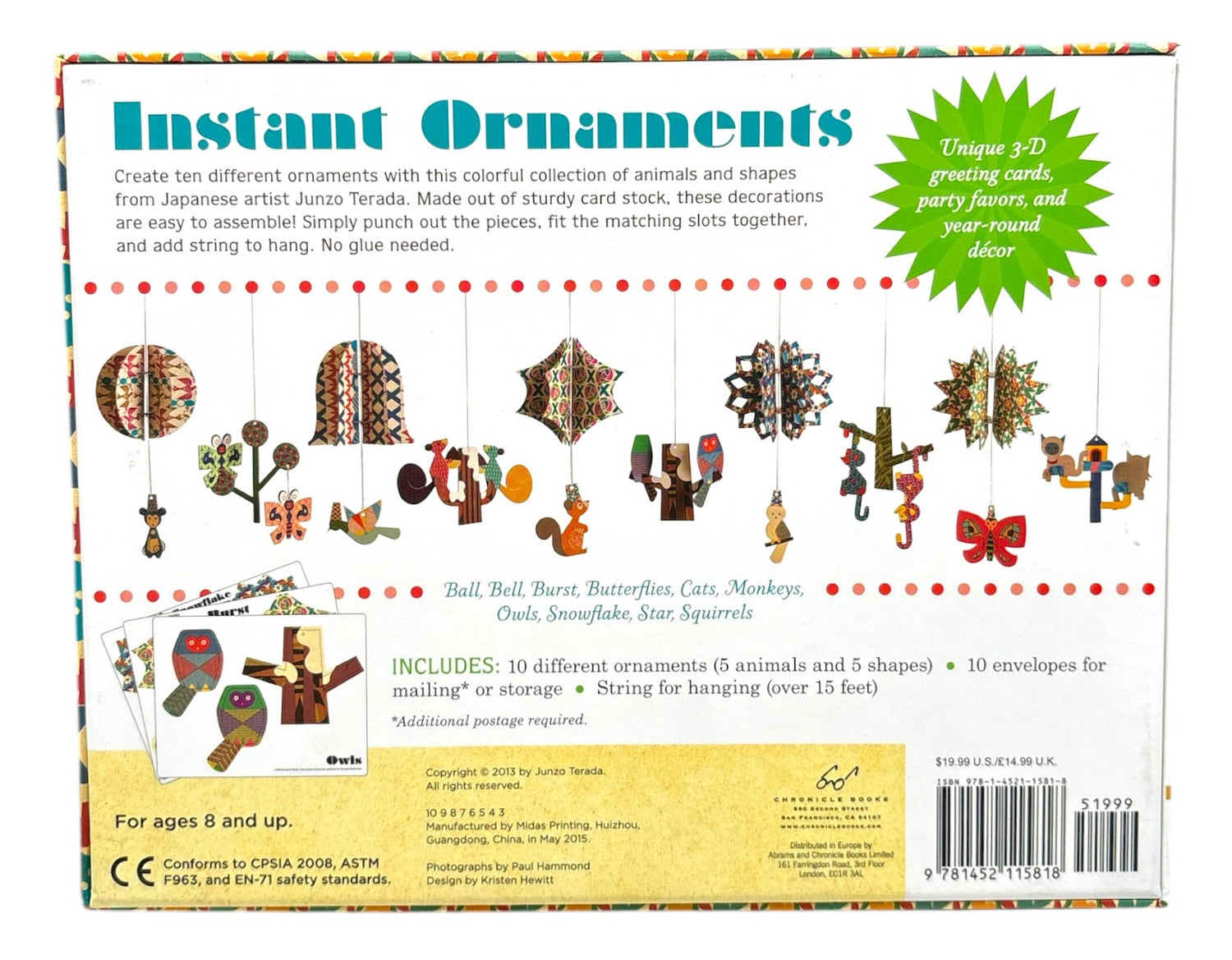 Easy to assemble, these ten different punch-out decorations feature the beloved Junzo Terada's delightful artistry. No scissors or glue needed! Includes: butterflies, cats, monkeys, owls, and squirrels; ball, bell, burst, snowflake, and star; string and mail-ready envelopes. This set of instant ornaments makes for unique party favors, 3-D greeting cards, and year-round décor.