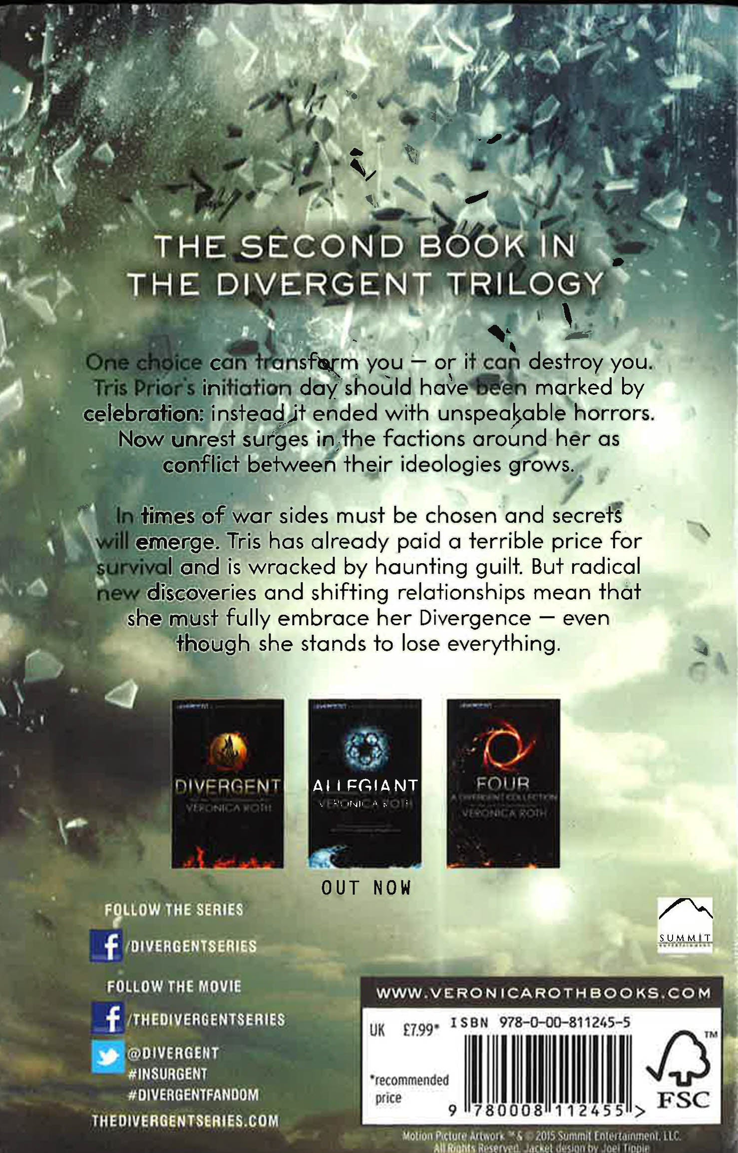 Fighting for survival in a shattered world... the truth is her only hope. The thrillingly dark sequel to No. 1 New York Times bestseller, DIVERGENT. DIVERGENT, INSURGENT and ALLEGIANT were major blockbuster movies in 2014, 2015 and 2016.Fighting for survival in a shattered world... the truth is her only hope. The thrillingly dark sequel to No. 1 New York Times bestseller, DIVERGENT. DIVERGENT, INSURGENT and ALLEGIANT were major blockbuster movies in 2014, 2015 and 2016. I have done bad things. I can't take them back, and they are part of who I am. Tris has survived a brutal attack on her former home and family. But she has paid a terrible price. Wracked by grief and guilt, she becomes ever more reckless as she struggles to accept her new future. Yet if Tris wants to uncover the truth about her world, she must be stronger than ever... because more shocking choices and sacrifices lie ahead.