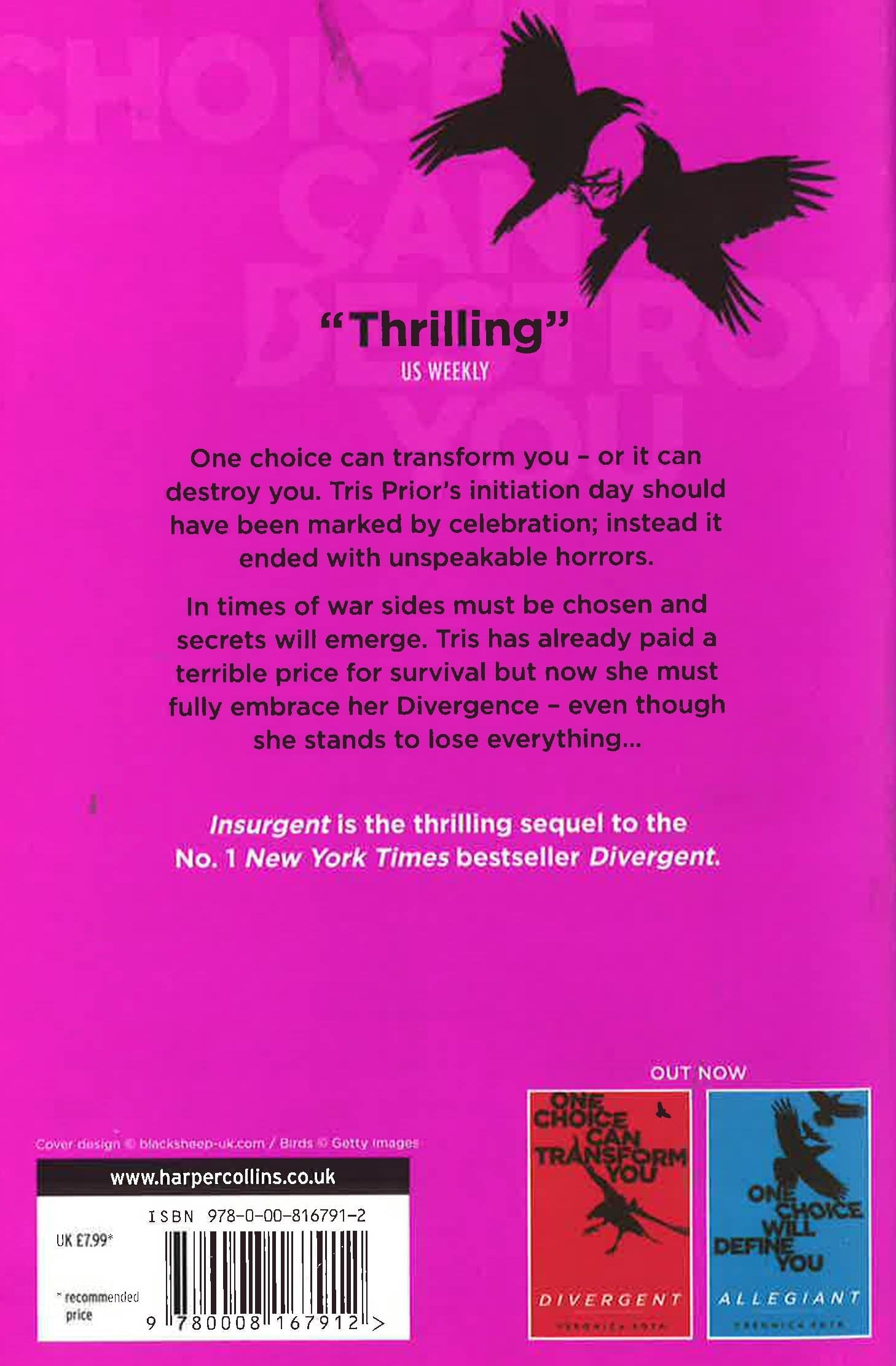 The thrillingly dark sequel to New York Times bestseller, DIVERGENT - a major motion picture franchise. One choice can transform you - or it can destroy you. Tris Prior's initiation day should have been marked by victorious celebrations with her chosen faction; instead it ended with unspeakable horrors. Now unrest surges in the factions around her as conflict between their ideologies grows. War seems inevitable; and in times of war sides must be chosen, secrets will emerge and choices will become ever more irrevocable. Tris has already paid a terrible price for survival and is wracked by haunting grief and guilt. But radical new discoveries and shifting relationships mean that she must fully embrace her Divergence - even though she cannot know what might be lost in doing so. New York Times bestselling author Veronica Roth's much-anticipated second book of the dystopian Divergent trilogy is another intoxicating thrill-ride, rich with hallmark twists, heartbreak, romance and powerful insights about human nature.
