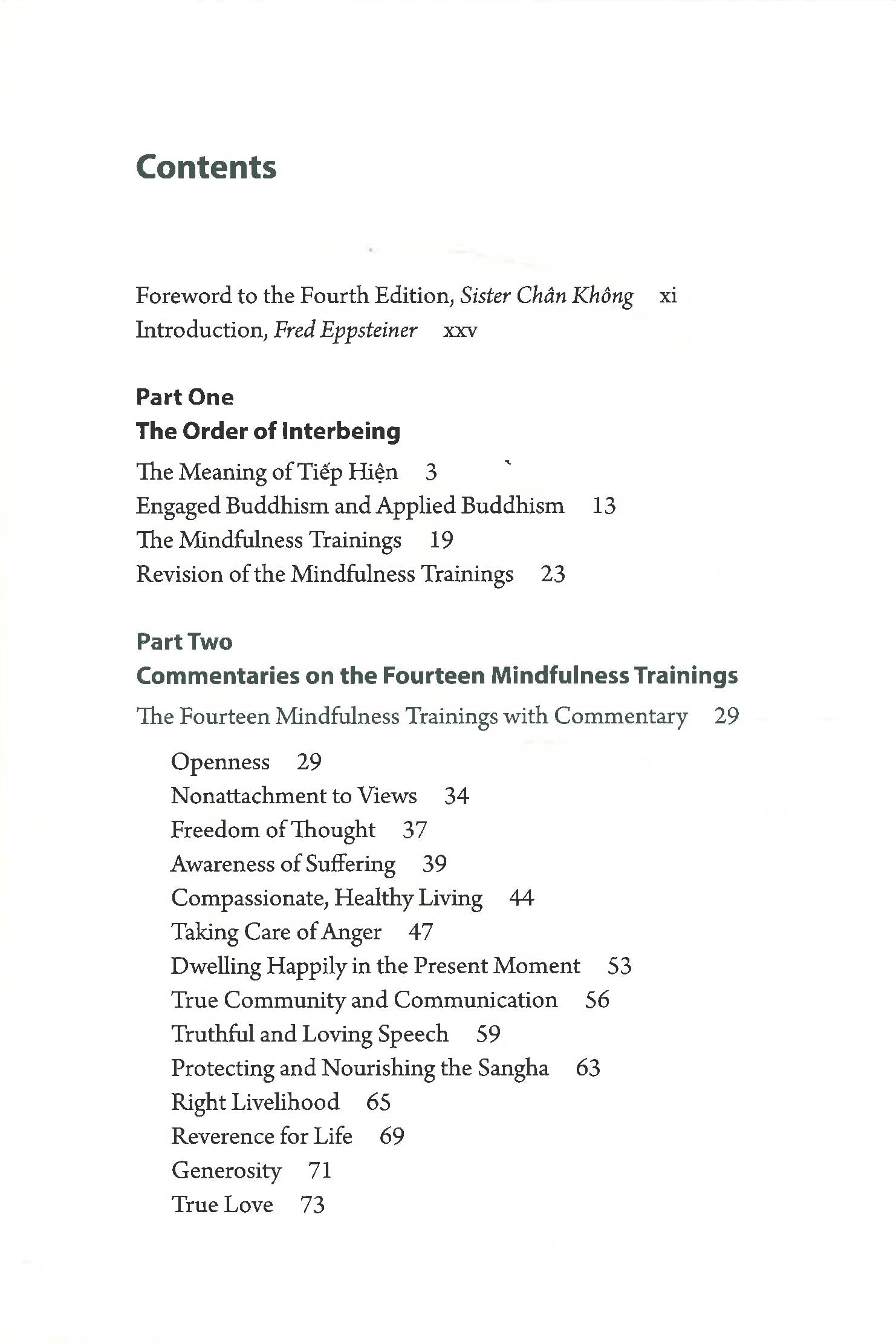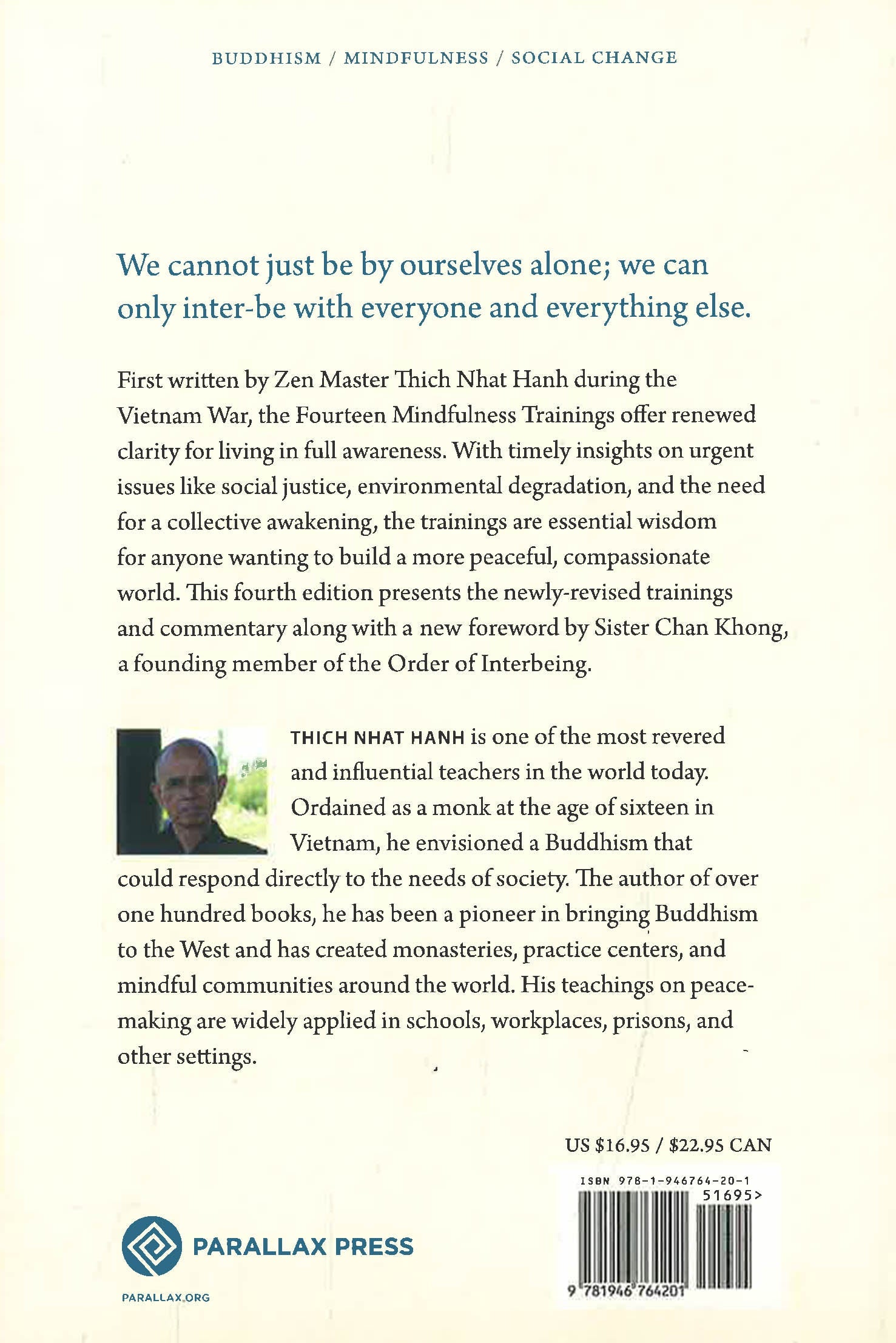 The Fourteen Mindfulness Trainings are a radical expression of Buddhist ethics and morality that offer essential insights for existing mindfully, and not burning out. This fourth edition introduces the most up-to-date revision of the Fourteen Mindfulness Trainings, with fresh commentary on living in contemporary society. Extra depth is added with a new foreword by Sister Chan Khong, one of the first 6 people to be ordained as a monastic by Thich Nhat Hanh, who opens a vivid personal window into the history and lineage of these trainings.