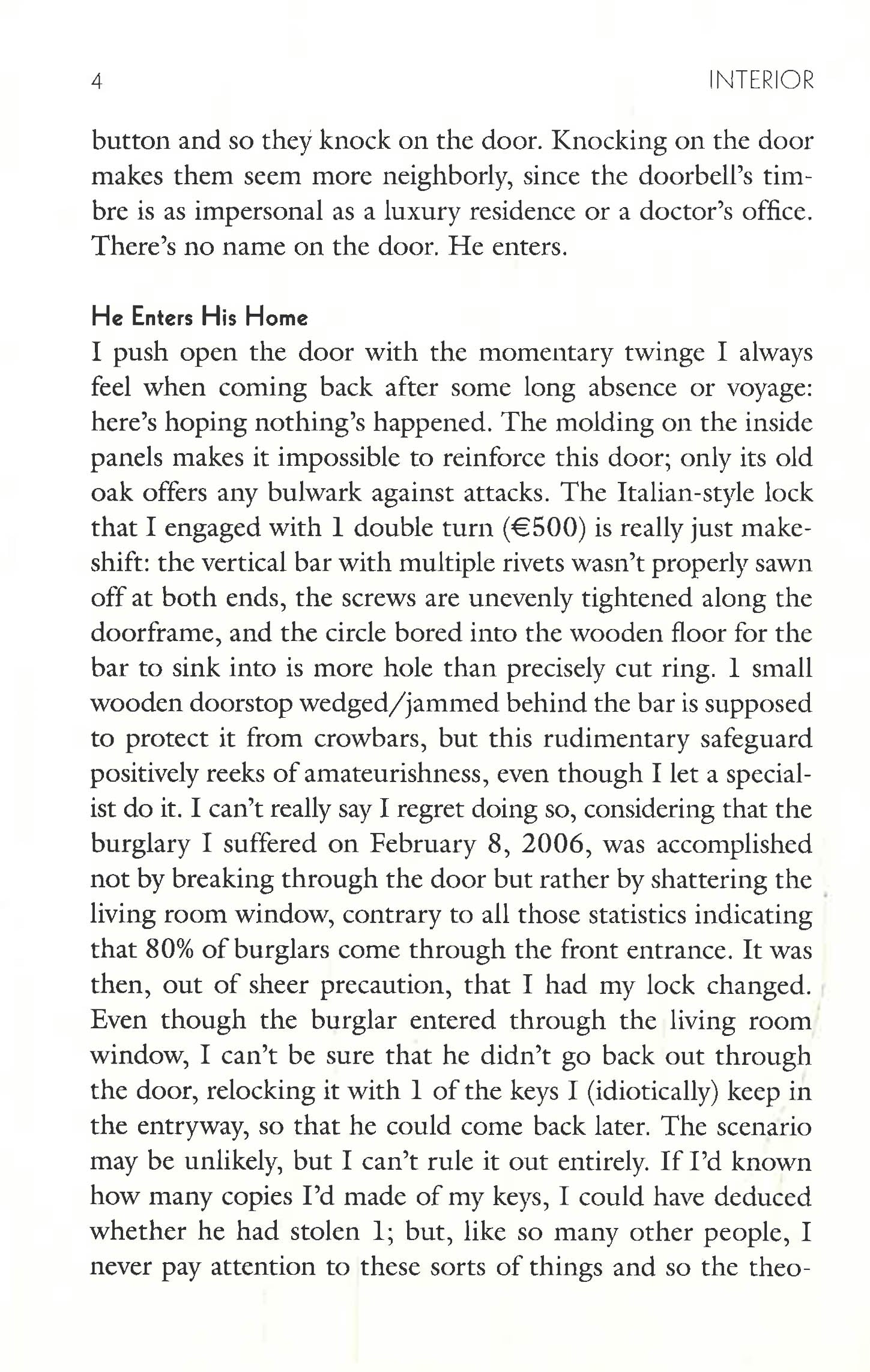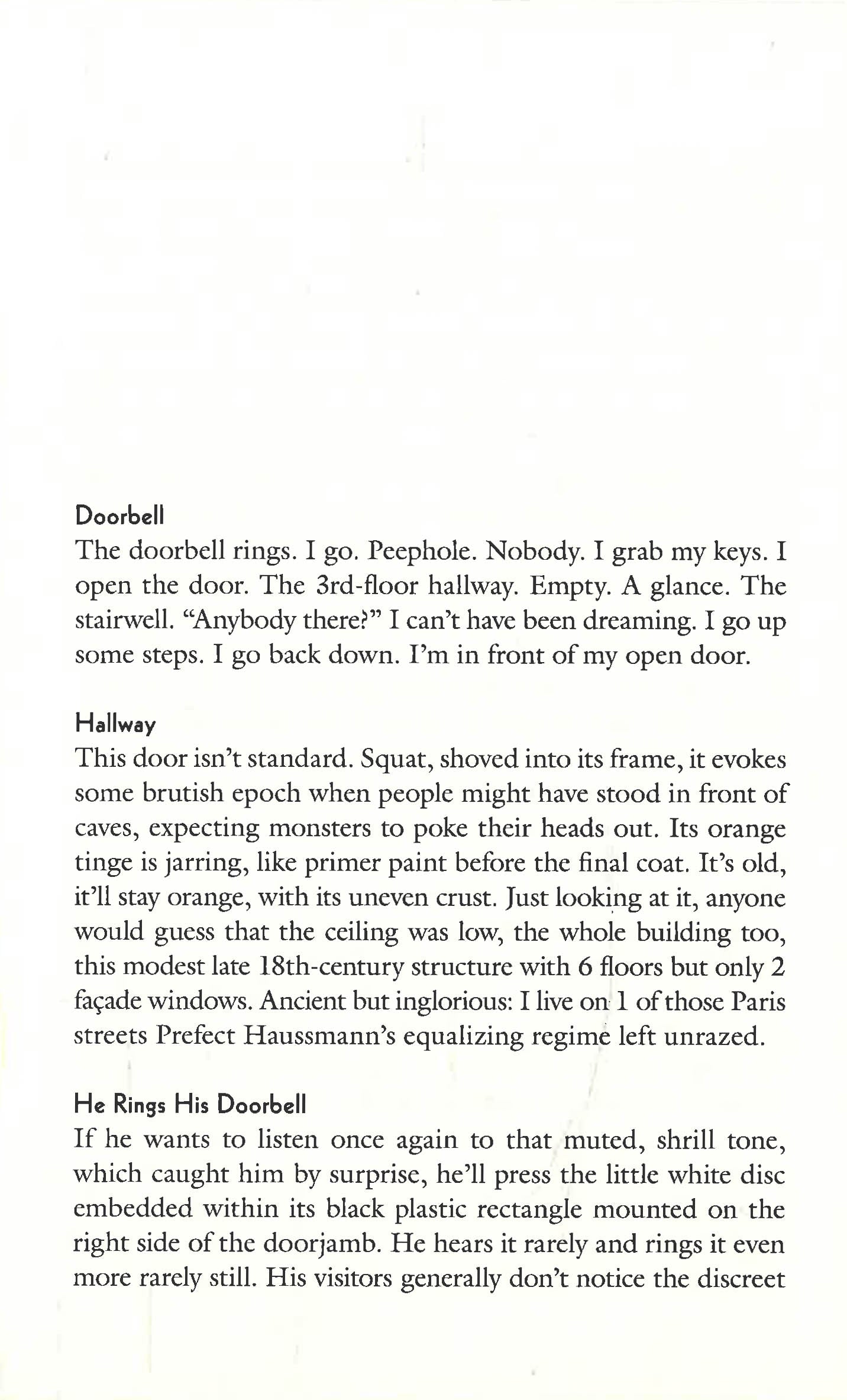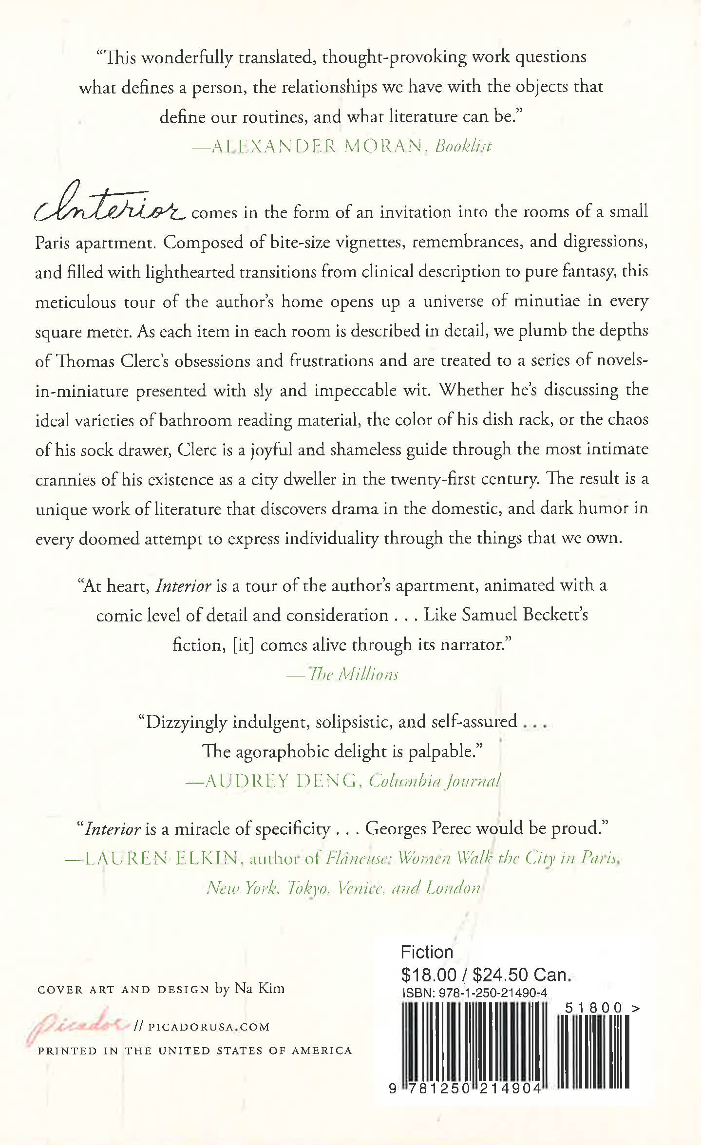 Composed of bite-size vignettes, remembrances, and digressions, and filled with lighthearted transitions from pure description to quirky reminiscence and back, this meticulous tour through the rooms of Clerc's home reveals fascinating insights into the author's obsessions, desires, and frustrations. Each space is described in painstaking detail, sometimes down to the centimeter, and the history of every object and appliance is fully excavated with self-deprecating wit. From the ideal varieties of bathroom reading material to the color of his dish rack to the chaos of his sock drawer, Clerc happily and shamelessly guides us through the most intimate crannies of his home, as well as through all the strata of his existence as a bourgeois city dweller approaching middle age.