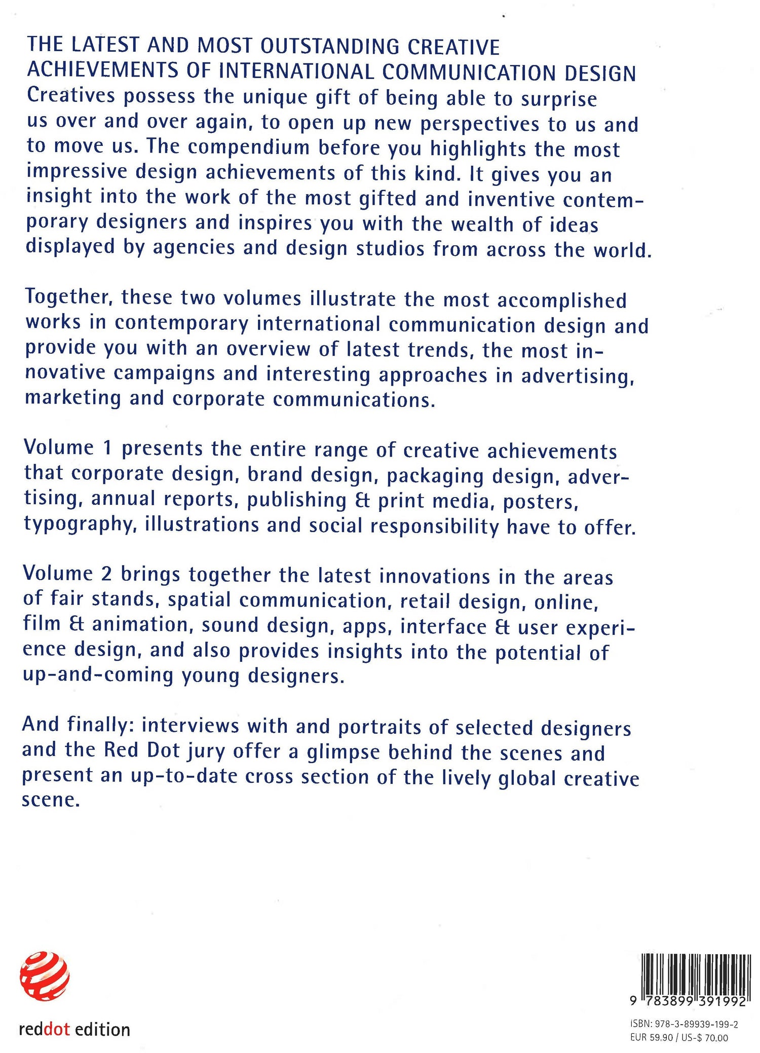 The reference book for contemporary design presents today's best projects in communication design on more than 1,200 pages. Browse through the latest developments in the industry and behold innovative works and outstanding campaigns from the fields of advertising, marketing and more. Volume 1 comprises the wide range of creative achievements in corporate design, brand design, packaging design, advertising, annual reports, publishing & print media, posters, typography and illustrations. Volume 2 features trends in spatial communication, fair stands, retail design, e-commerce, online, film & animation, sound and game design, apps and interface design. Moreover, portraits of the best designers complete the standard work of international communication design.