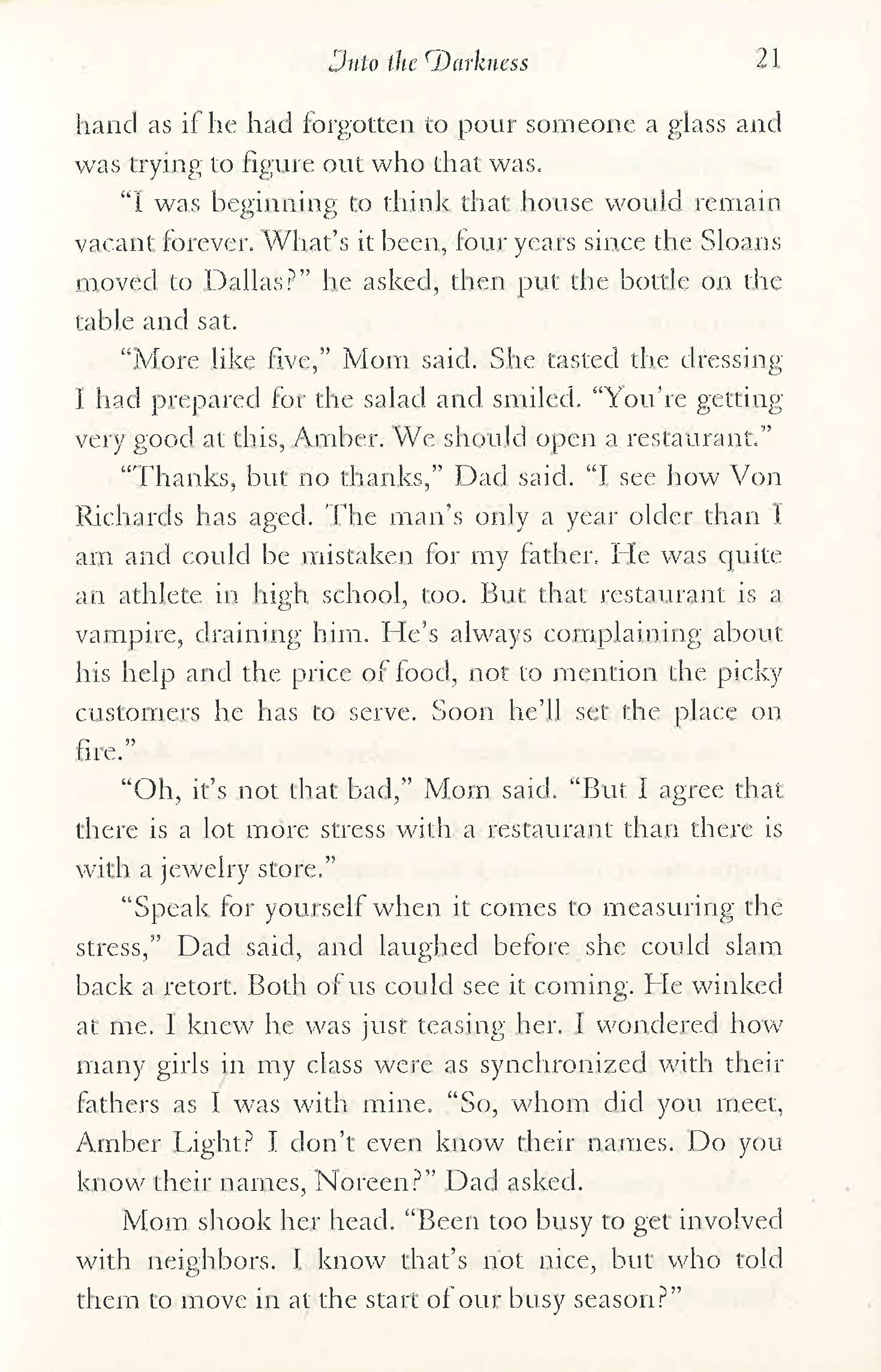 As lovely as one of the precious gems at her parents' jewellery store, Amber Taylor is shy and introspective - qualities misread by others as being stuck-up and superior. Facing a long, lonely summer working at the family shop, Amber's world lights up when the Matthews family suddenly moves in to the house next door, a property that has stood neglected for the longest time. And when she meets Brayden Matthews, an only child just like her, Amber soon becomes infatuated with this handsome, quirky young man who seems to know her innermost feelings almost before she does, who takes her places she never knew existed in her small town. Their connection is electrifying, unlike anything Amber's felt before. But as quickly as he appears, Brayden vanishes into the darkness. And finding out the truth about him will push Amber Taylor to the edge of madness. . .