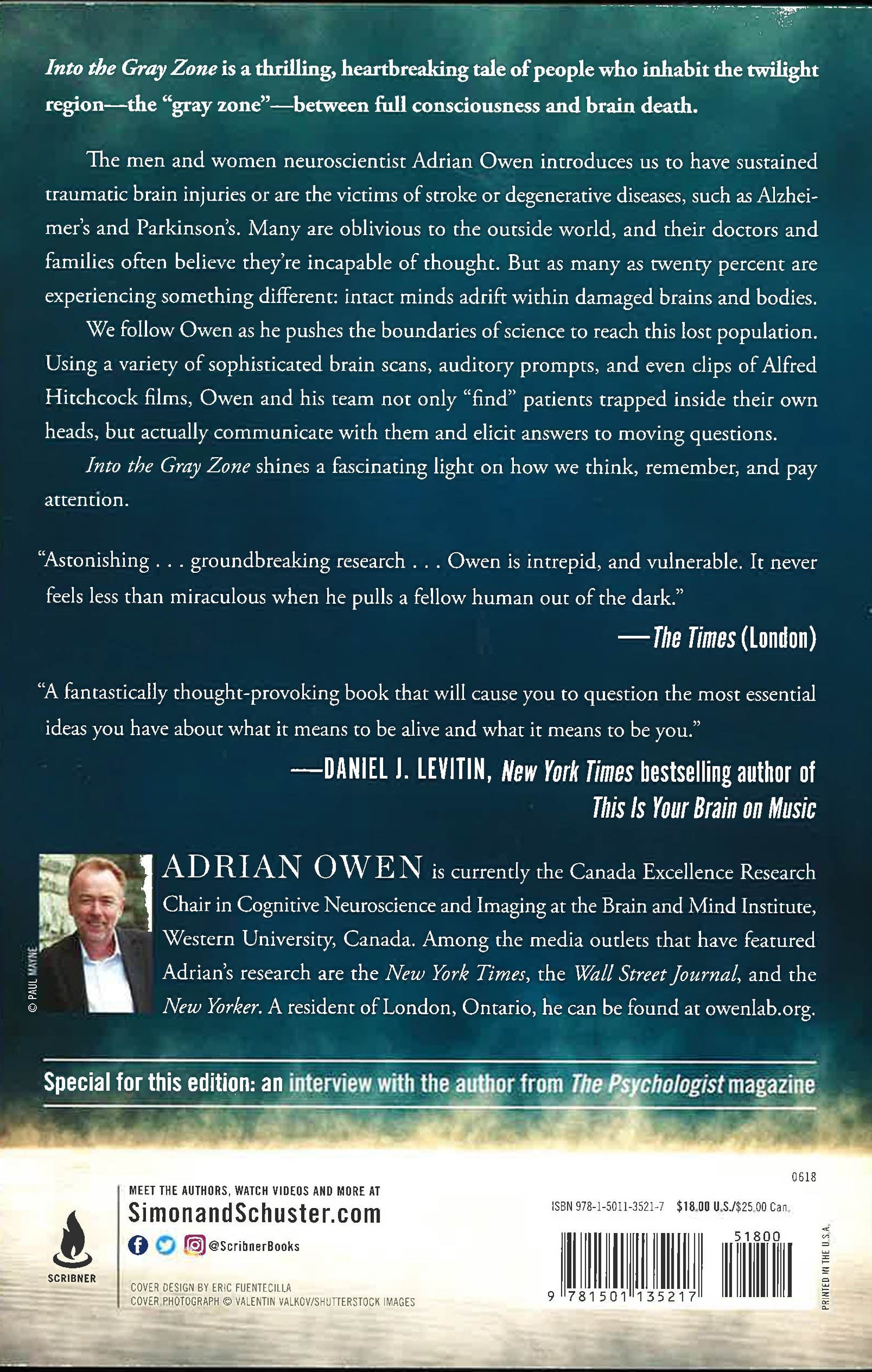 In this "riveting read, meshing memoir with scientific explication" (Nature), a world-renowned neuroscientist reveals how he learned to communicate with patients in vegetative or "gray zone" states and, more importantly, he explains what those interactions tell us about the working of our own brains. "Vivid, emotional, and thought-provoking" (Publishers Weekly), Into the Gray Zone takes readers to the edge of a dazzling, humbling frontier in our understanding of the brain: the so-called "gray zone" between full consciousness and brain death. People in this middle place have sustained traumatic brain injuries or are the victims of stroke or degenerative diseases, such as Alzheimer's and Parkinson's. Many are oblivious to the outside world, and their doctors believe they are incapable of thought. But a sizeable number--as many as twenty percent--are experiencing something different: intact minds adrift deep within damaged brains and bodies. An expert in the field, Adrian Owen led a team that, in 2006, discovered this lost population and made medical history. Scientists, physicians, and philosophers have only just begun to grapple with the implications. Following Owen's journey of exciting medical discovery, Into the Gray Zone asks some tough and terrifying questions, such as: What is life like for these patients? What can their families and friends do to help them? What are the ethical implications for religious organizations, politicians, the Right to Die movement, and even insurers? And perhaps most intriguing of all: in defining what a life worth living is, are we too concerned with the physical and not giving enough emphasis to the power of thought? What, truly, defines a satisfying life? "Strangely uplifting...the testimonies of people who have returned from the gray zone evoke the mysteries of consciousness and identity with tremendous power" (The New Yorker). This book is about the difference between a brain and a mind, a body and a person. Into the Gray Zone is "a fascinating memoir...reads like a thriller" (Mail on Sunday). *This book may have remainder mark.