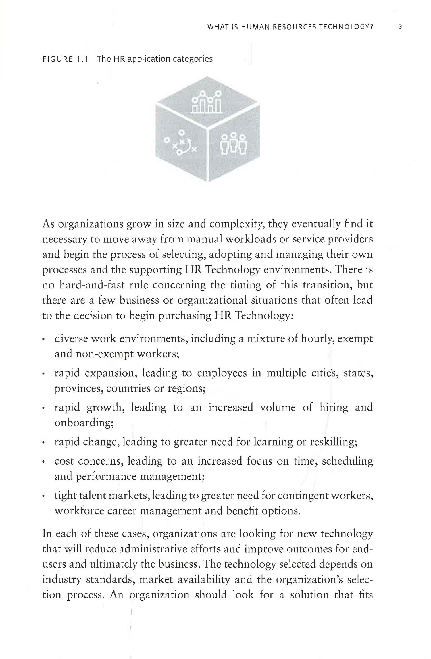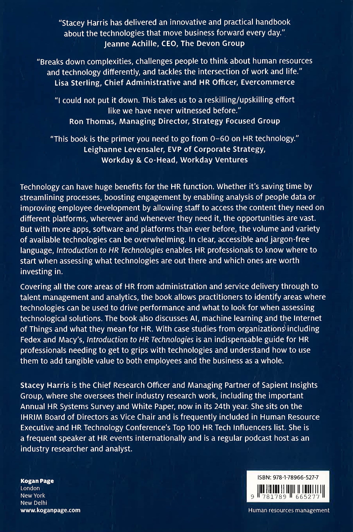 Technology can have huge benefits for the HR function. Whether it's saving time by streamlining processes, boosting engagement by enabling analysis of people data or improving employee development by allowing staff to access the content they need on different platforms, wherever and whenever they need it; the opportunities are vast. However, with more apps, software and platforms than ever before, the volume and variety of available technologies can be overwhelming. This makes it extremely difficult for HR professionals to know where to start when assessing what technologies are out there and which are worth investing in. Introduction to HR Technologies addresses these issues in clear, accessible and jargon-free language and is an indispensable guide for HR professionals needing to get to grips with technologies and understand how to use them to add tangible business value. Covering all the core areas of HR including recruitment, performance management, learning and development (L&D) and reward, Introduction to HR Technologies allows practitioners to identify areas where technologies can be used to drive performance and what to look for when assessing technological solutions. There is also discussion of artificial intelligence (AI), machine learning and the Internet of Things (IoT) and what they mean for HR. This book is essential reading for all HR professionals looking to use technology confidently to increase performance, improve processes and add value to both employees and the business as a whole.