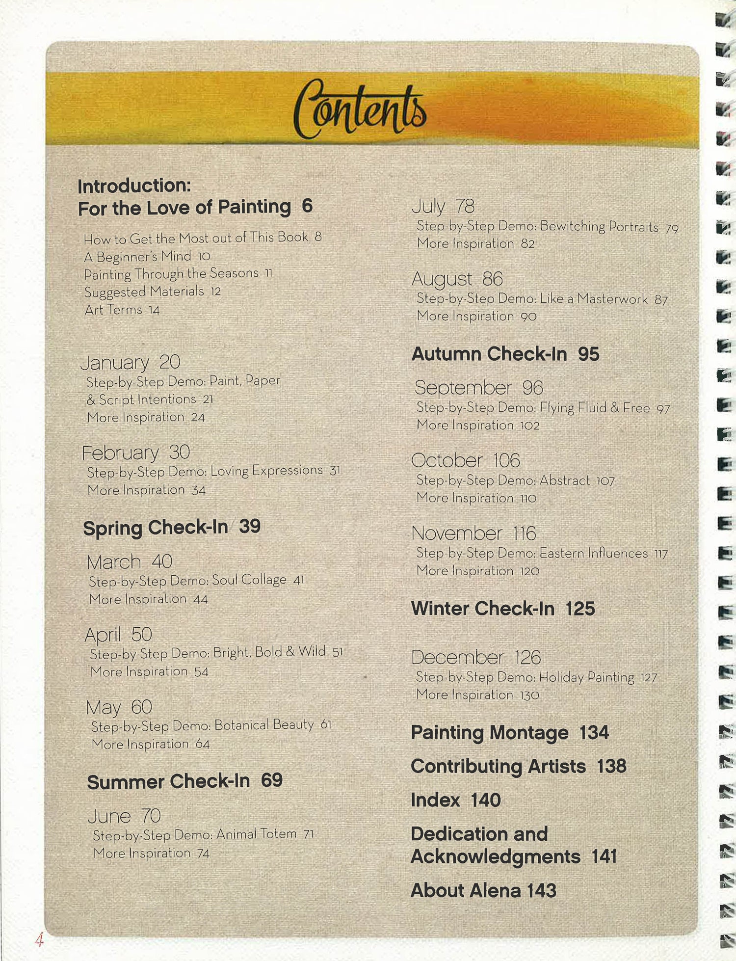 Stay inspired to paint all year long! A continual supply of fresh, intuitive painting techniques will keep you motivated throughout each season. With a new step-by-step exercise each month and seasonal check-ins and prompts, you'll get a full year of support and mixed-media inspiration. * Presents a year's worth of instruction and prompts that coincide with the changing seasons. * Offers inspiring gallery work from over 50 contributing artists. * Includes space to write or doodle directly inside the check-in portions of the book so you have a record of your thoughts and experiments.