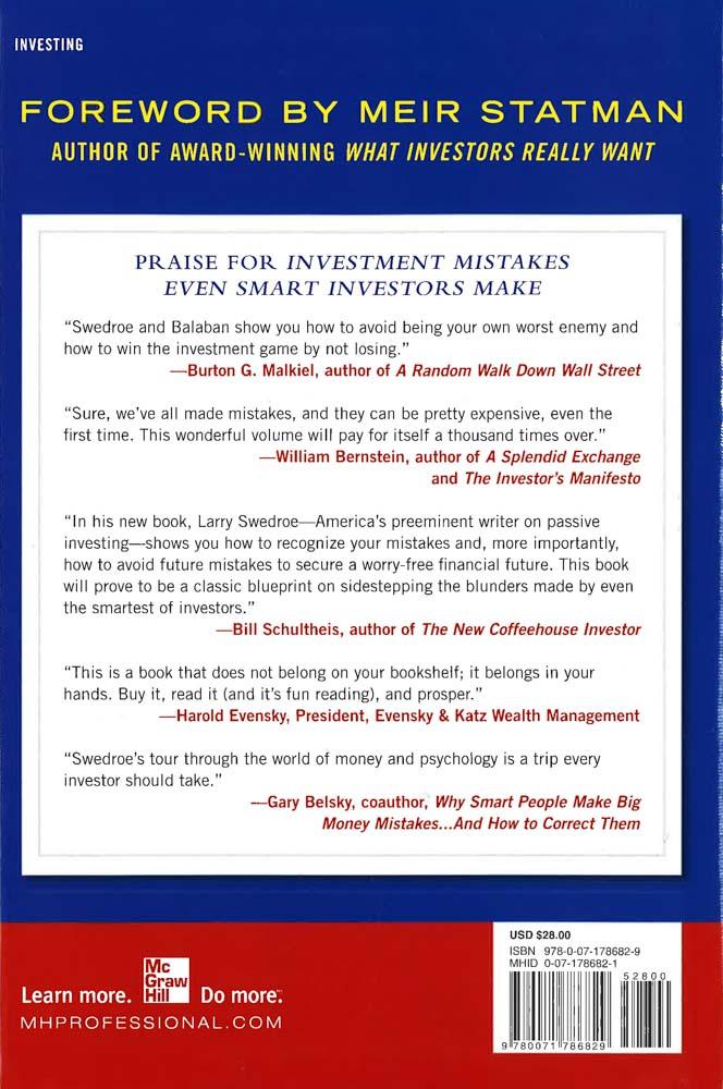 With a Foreword by Meir Statman, author of award-winning What Investors Really Want. Even the most experienced investors in the world can screw up-and don't let anyone tell you otherwise. Whether you're an old pro with a well-designed portfolio or a newbie investor just starting out, bestselling author Larry Swedroe with RC Balaban can show you how to "live and learn" from others' mistakes-and invest in good times and bad. By answering the key questions every investor should ask, you'll learn how to avoid: Mistake #1: Feeling too confident in your investing skills. Mistake #6: Allowing yourself to be swayed by popular opinion. Mistake #11: Holding on to assets because of the price you paid. Mistake #15: Letting friendships influence your choice of advisors .Mistake #31: Expecting miracles from hedge fund managers. Mistake #48: Confusing speculation with investing. Mistake #60: Underestimating the number of stocks you need to diversify. Mistake #71: Forgetting that you can be too conservative. Mistake #77: Repeating the same mistake. Be warned: This groundbreaking guide will shatter the myths about money you've come to accept and challenge the conventional wisdom you've received from friends, advisors, and other "experts." By exposing these all-too-common mistakes, one by one, you'll be able to rethink your strategy and reinvest in your future with confidence. You'll discover the truth about misleading demographics, "high-return" investments, active managers, and other resources you should-or shouldn't-trust. You'll learn the actual devastating effect taxes can have on your returns if you use the wrong strategy. You'll learn the wrong way and the right way to build your portfolio, diversify your accounts, and plan for your family's future. Most important, this book will show you how to avoid making the investment mistakes you used to make and how to give yourself the best chance of achieving your financial goals. Filled with insider insight, need-to-know advice, and revealing case studies, this is the one book smart investors can learn from-and even smarter investors can invest in.