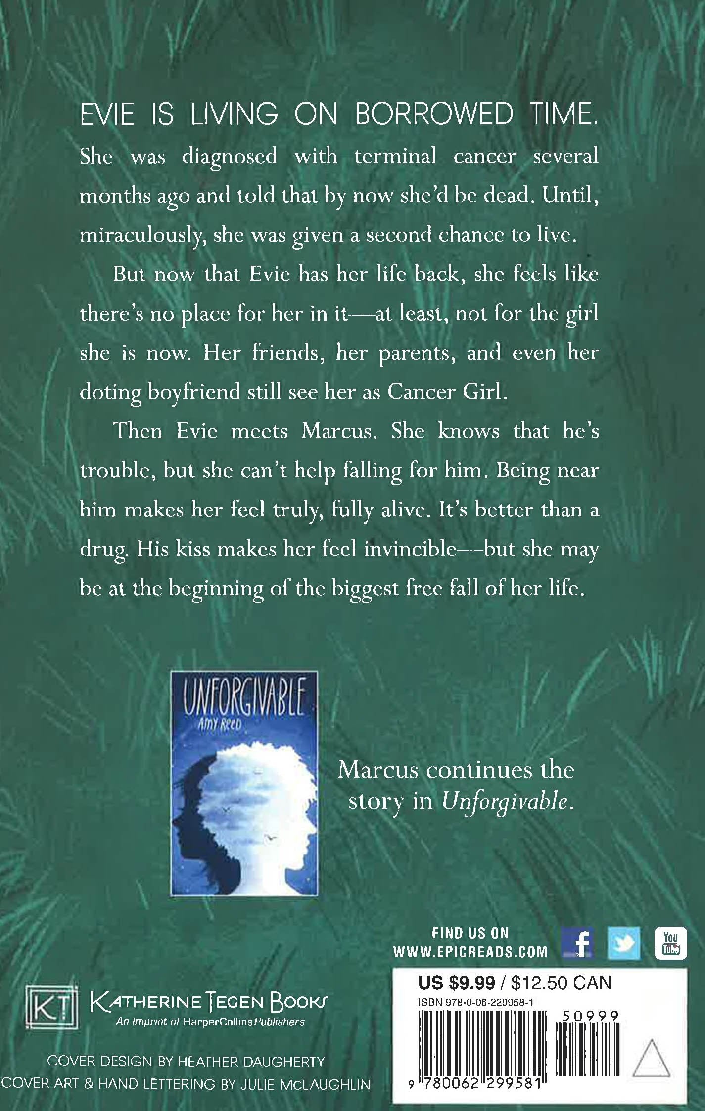 Evie is living on borrowed time. She was diagnosed with terminal cancer several months ago and told that by now she’d be dead. Evie is grateful for every extra day she gets, but she knows that soon this disease will kill her. Until, miraculously, she may have a second chance to live.All Evie had wanted was her life back, but now that she has it, she feels like there’s no place for her in it - at least, not for the girl she is now. Her friends and her parents still see her as Cancer Girl, and her boyfriend’s constant, doting attention is suddenly nothing short of suffocating.Then Evie meets Marcus. She knows that he’s trouble, but she can’t help falling for him. Being near him makes her feel truly, fully alive. It’s better than a drug. His kiss makes her feel invincible - but she may be at the beginning of the biggest free fall of her life.