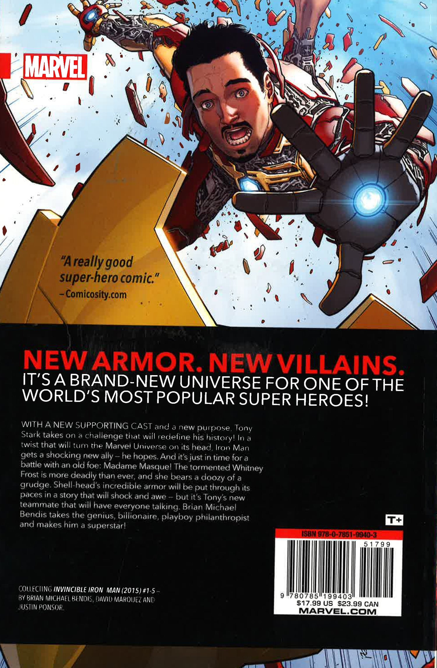 One of the most popular super heroes in the world soars to fresh heights! Tony Stark has a new armor, a new supporting cast, new villains and a new purpose that's going to tear itself across the entire Marvel Universe and beyond. It begins with a shocker of a twist and only gets more surprising from there, with the return of one of Tony's biggest nemeses and the quest to find his biological parents! As Iron Man chases Madame Masque, her actions threaten to rip all of reality apart! Shellhead's incredible armor will be put through its paces in a story that will shock and awe - but it is who exactly Tony teams up with that will have everyone talking. Brian Michael Bendis takes the genius, billionaire, playboy philanthropist and makes him a superstar!
