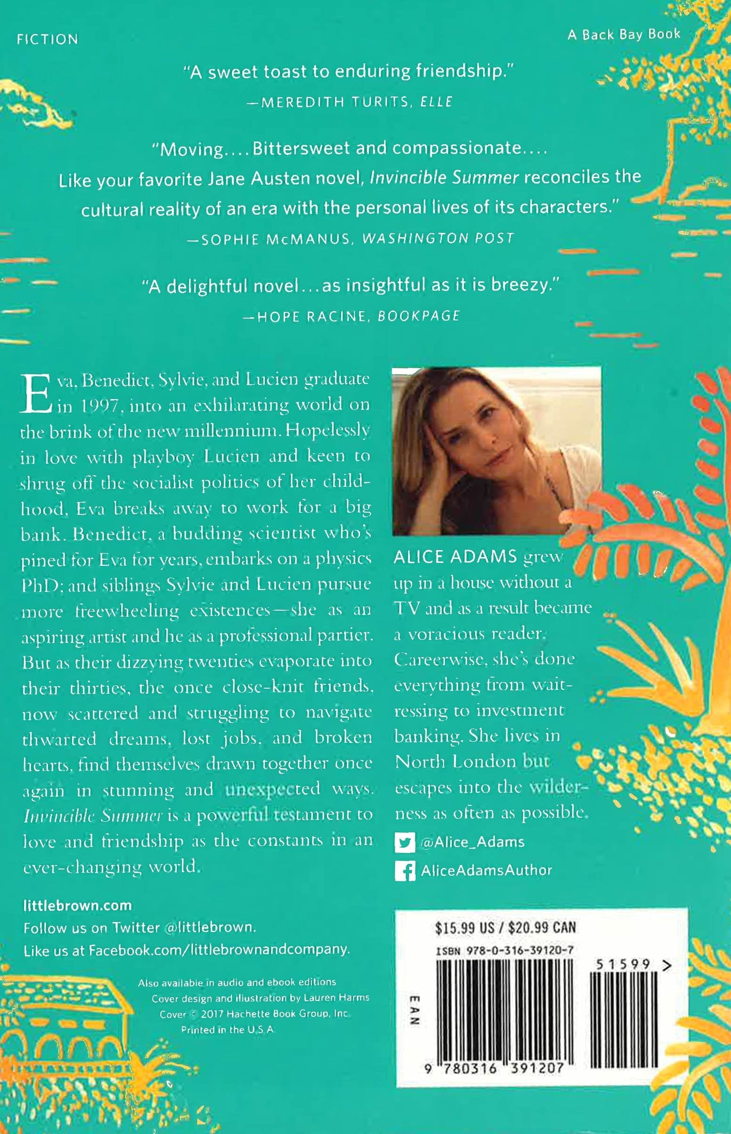 Four friends. Twenty years. One unexpected journey. Eva, Benedict, Sylvie, and Lucien graduate in 1997, into an exhilarating world on the brink of the new millennium. Hopelessly in love with playboy Lucien and keen to shrug off the socialist politics of her childhood, Eva breaks away to work for a big bank. Benedict, a budding scientist who's pined for Eva for years, embarks on a physics PhD, and siblings Sylvie and Lucien pursue more freewheeling existences--she as an aspiring artist and he as a professional partier. But as their dizzying twenties evaporate into their thirties, the once close-knit friends, now scattered and struggling to navigate thwarted dreams, lost jobs, and broken hearts, find themselves drawn together once again in stunning and unexpected ways. A dazzling depiction of the highs and lows of adulthood, INVINCIBLE SUMMER is a story about finding the courage to carry on in the wake of disappointment and a powerful testament to love and friendship as the constants in an ever-changing world.