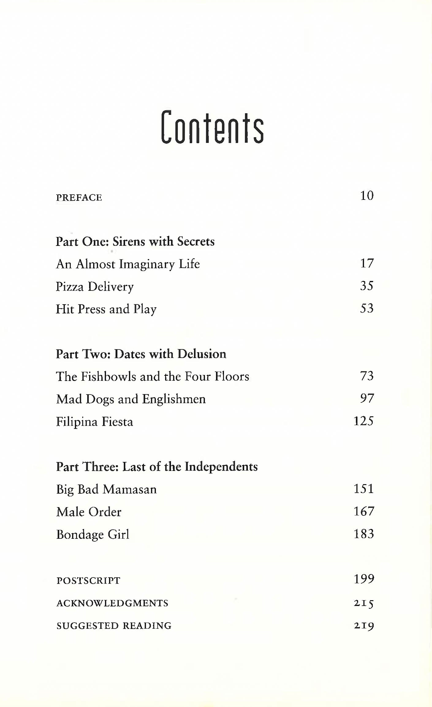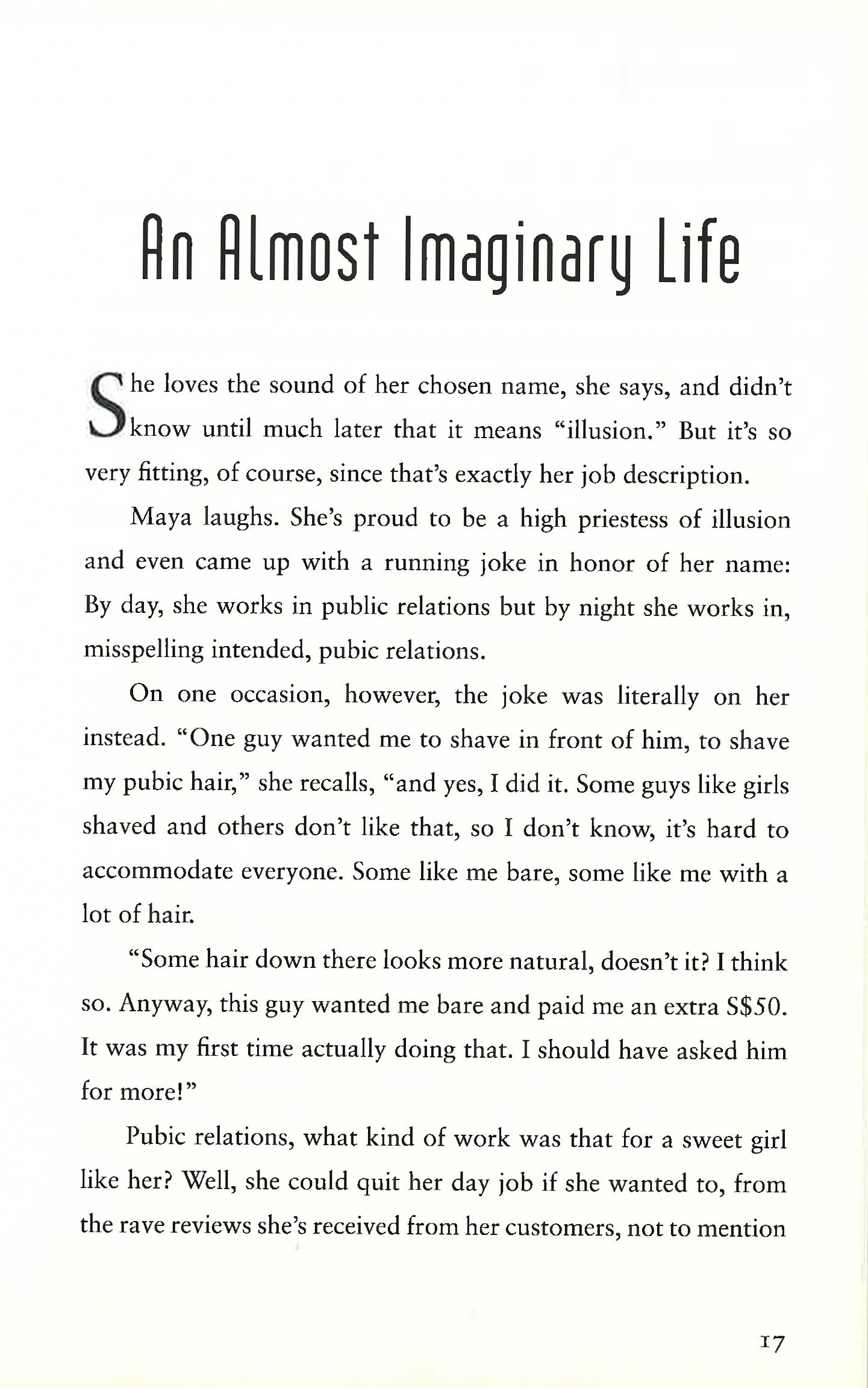 Both, he discovers, involve addictive behavior fed by deep existential forces fraught with anger and pain, often disguised as carnal longing. There's the girl who works at a public relations agency by day and moonlights as an escort by night, the karaoke-bar mamasan who deals in wild and wanton girls from mainland China, the American male escort who gets paid by visiting Shanghai socialites for his companionship both in an out of their hotel bedrooms, and the Singaporean university student who freelances as a bondage model.