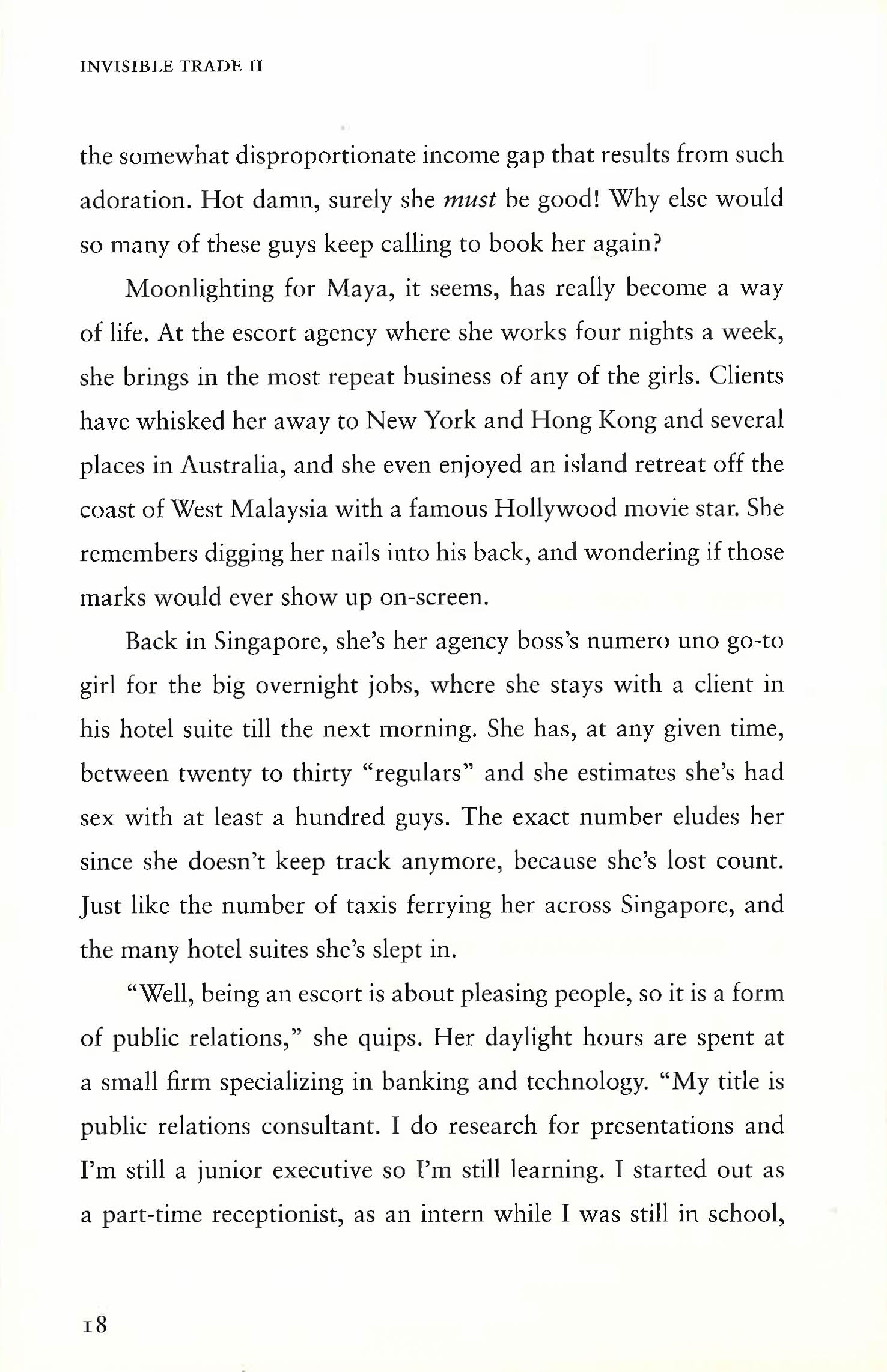 In this long-awaited sequel to the Singapore bestseller Invisible Trade, journalist Gerrie Lim seeks to unravel and demystify two major aspects of the sex industry in modern Singapore: the secretive double lives led by the beautiful, upscale escorts and the reasons why men habitually need to spend money to pay for sex.