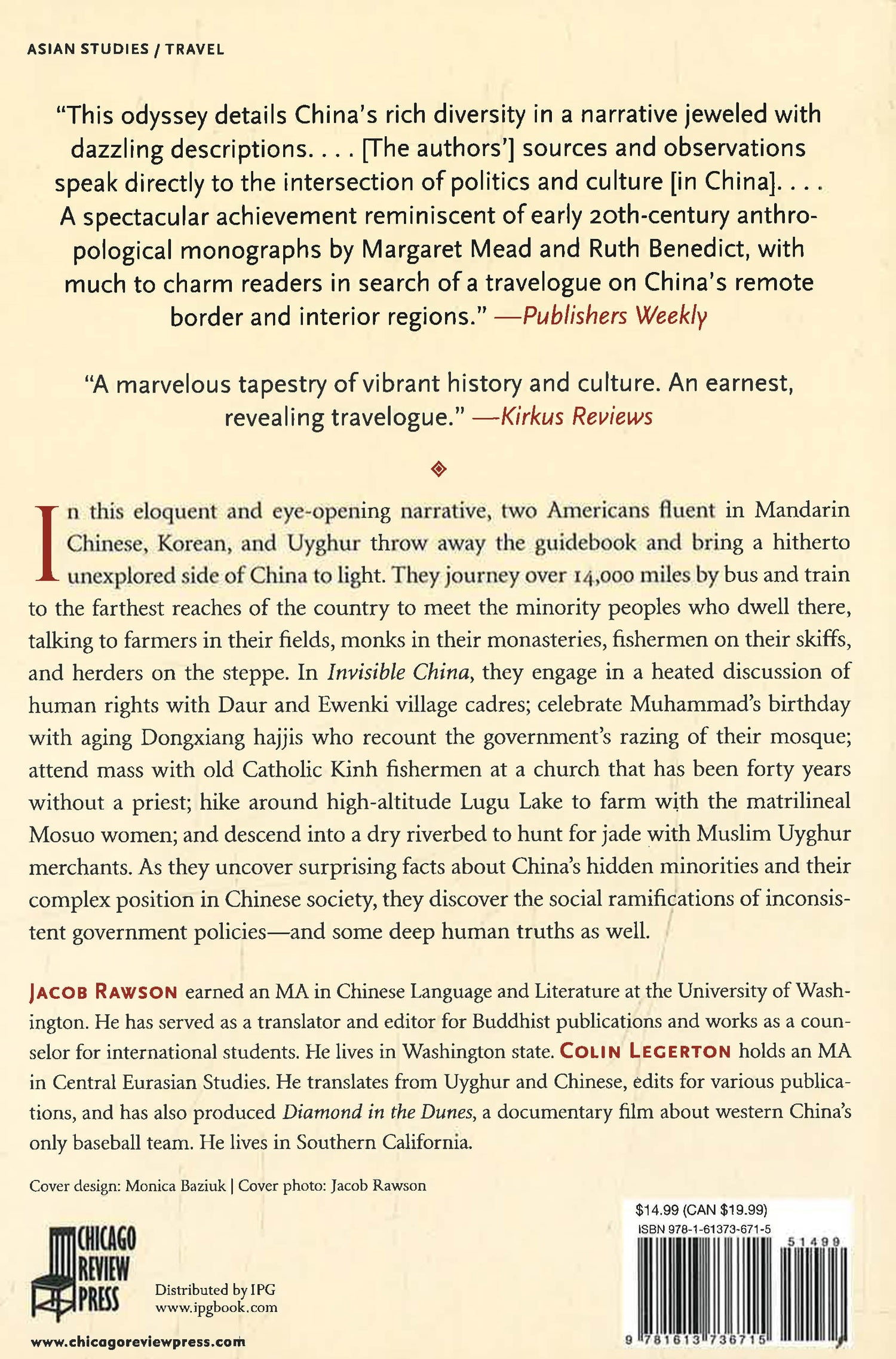 In this eloquent and eye-opening narrative, two Americans fluent in Mandarin Chinese, Korean, and Uyghur throw away the guidebook and bring a hitherto unexplored side of China to light. They journey over 14,000 miles by bus and train to the farthest reaches of the country to meet the minority peoples who dwell there, talking to farmers in their fields, monks in their monasteries, fishermen on their skiffs, and herders on the steppe. In Invisible China, they engage in a heated discussion of human rights with Daur and Ewenki village cadres; celebrate Muhammad's birthday with aging Dongxiang hajjis who recount the government's razing of their mosque; attend mass with old Catholic Kinh fishermen at a church that has been forty years without a priest; hike around high-altitude Lugu Lake to farm with the matrilineal Mosuo women; and descend into a dry riverbed to hunt for jade with Muslim Uyghur merchants. As they uncover surprising facts about China's hidden minorities and their complex position in Chinese society, they discover the social ramifications of inconsistent government policies--and some deep human truths as well.