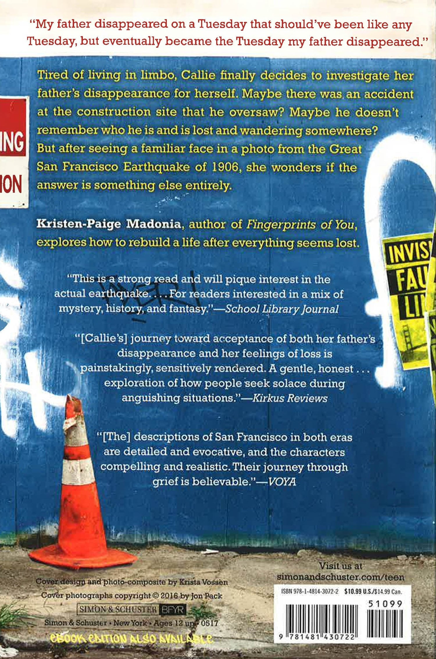My father disappeared on a Tuesday that should’ve been like any Tuesday, but eventually became the Tuesday my father disappeared.Tired of living in limbo, Callie finally decides to investigate her father’s disappearance for herself. Maybe there was an accident at the construction site that he oversaw? Maybe he doesn’t remember who he is and is lost wandering somewhere? But after seeing a familiar face in a photo from the Great San Francisco Earthquake of 1906, she wonders if the answer is something else entirely.